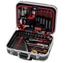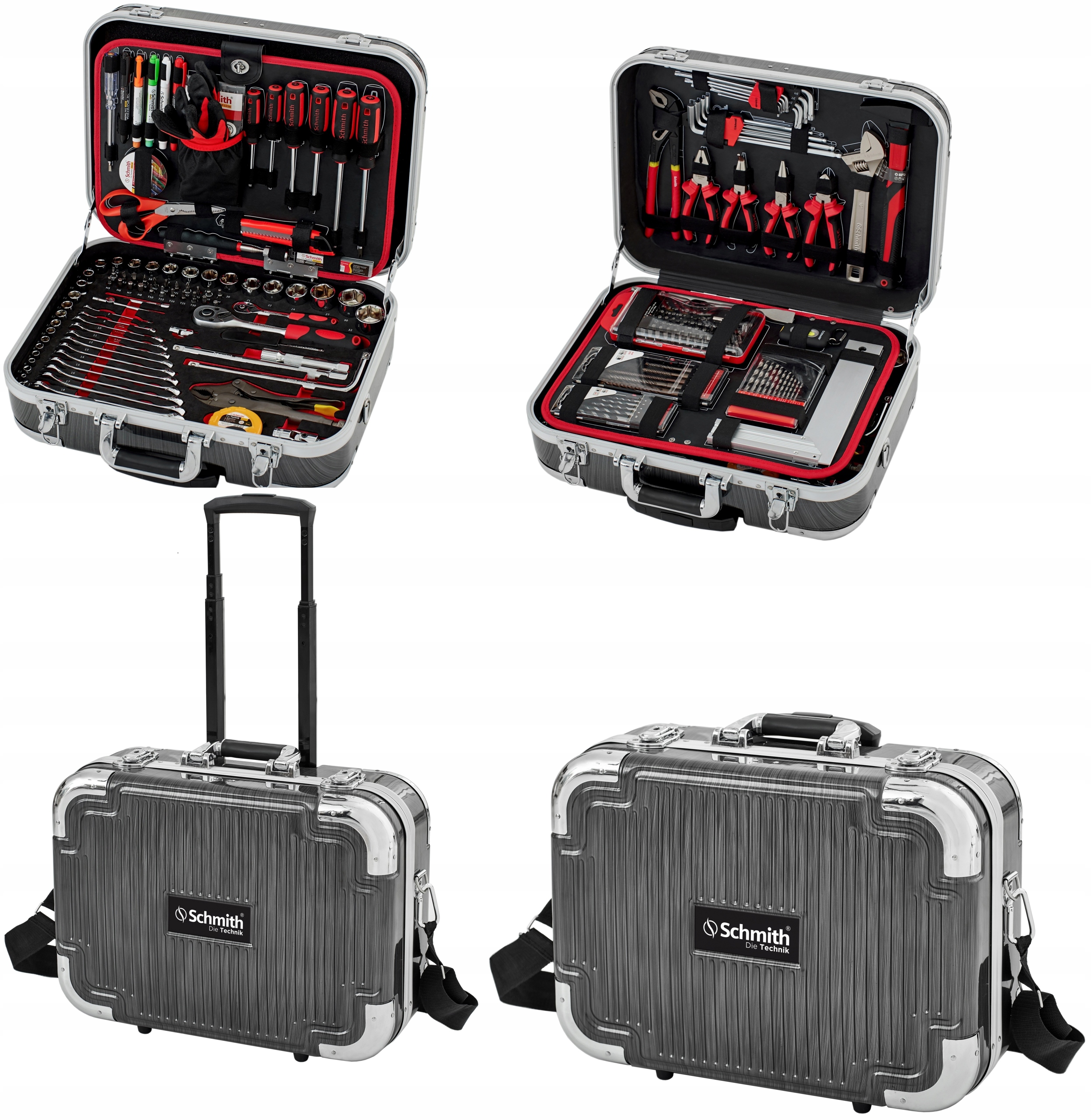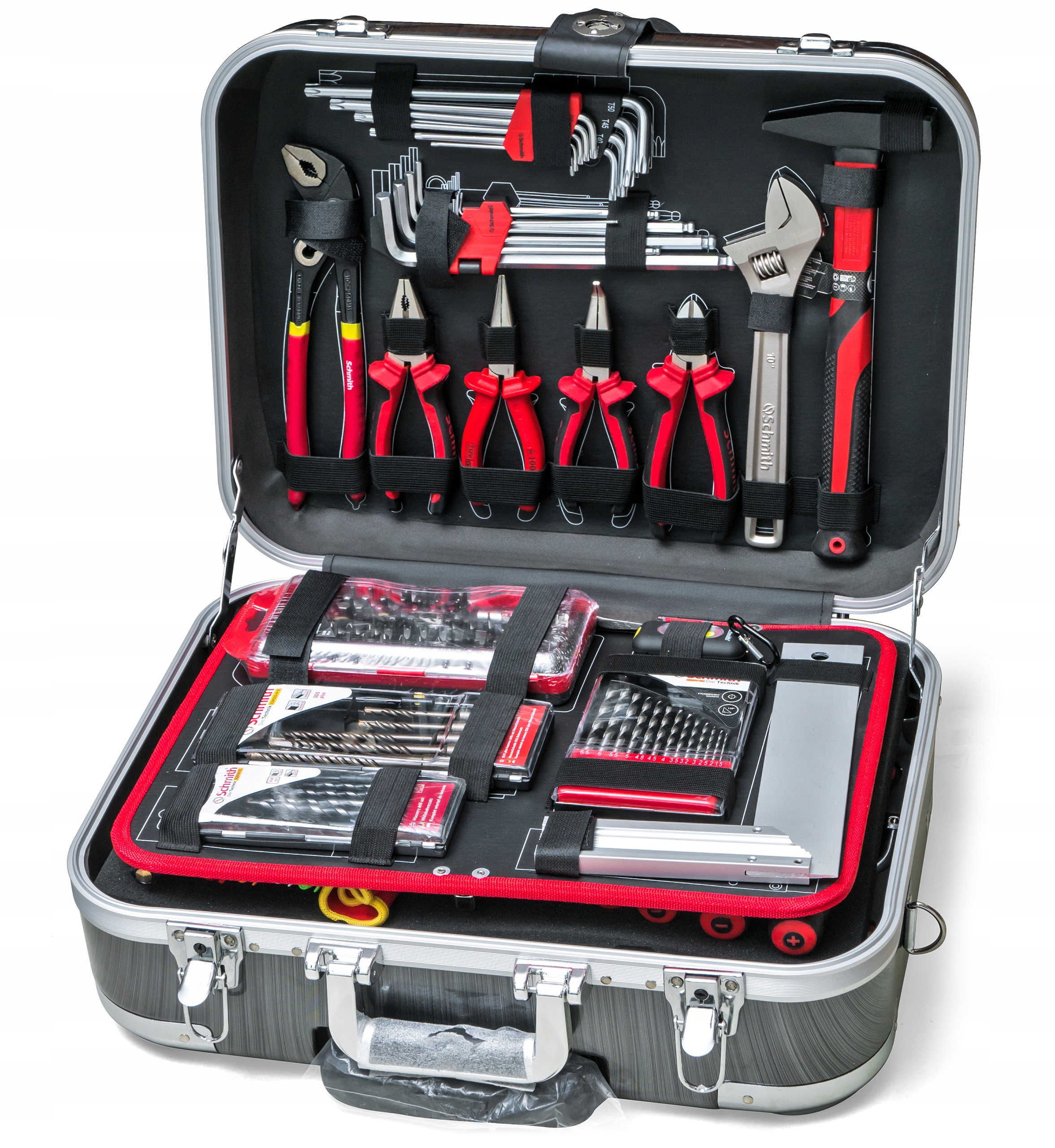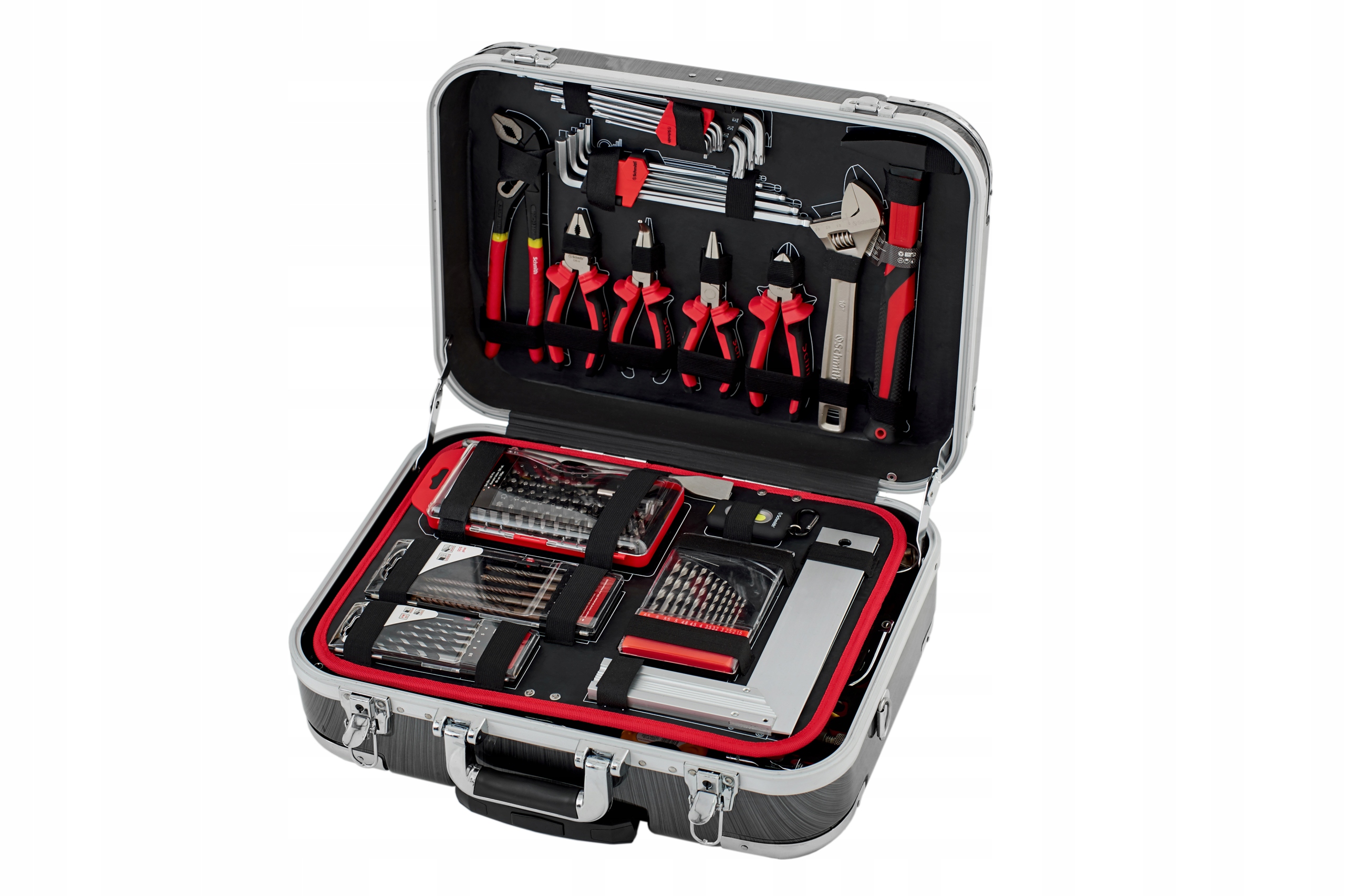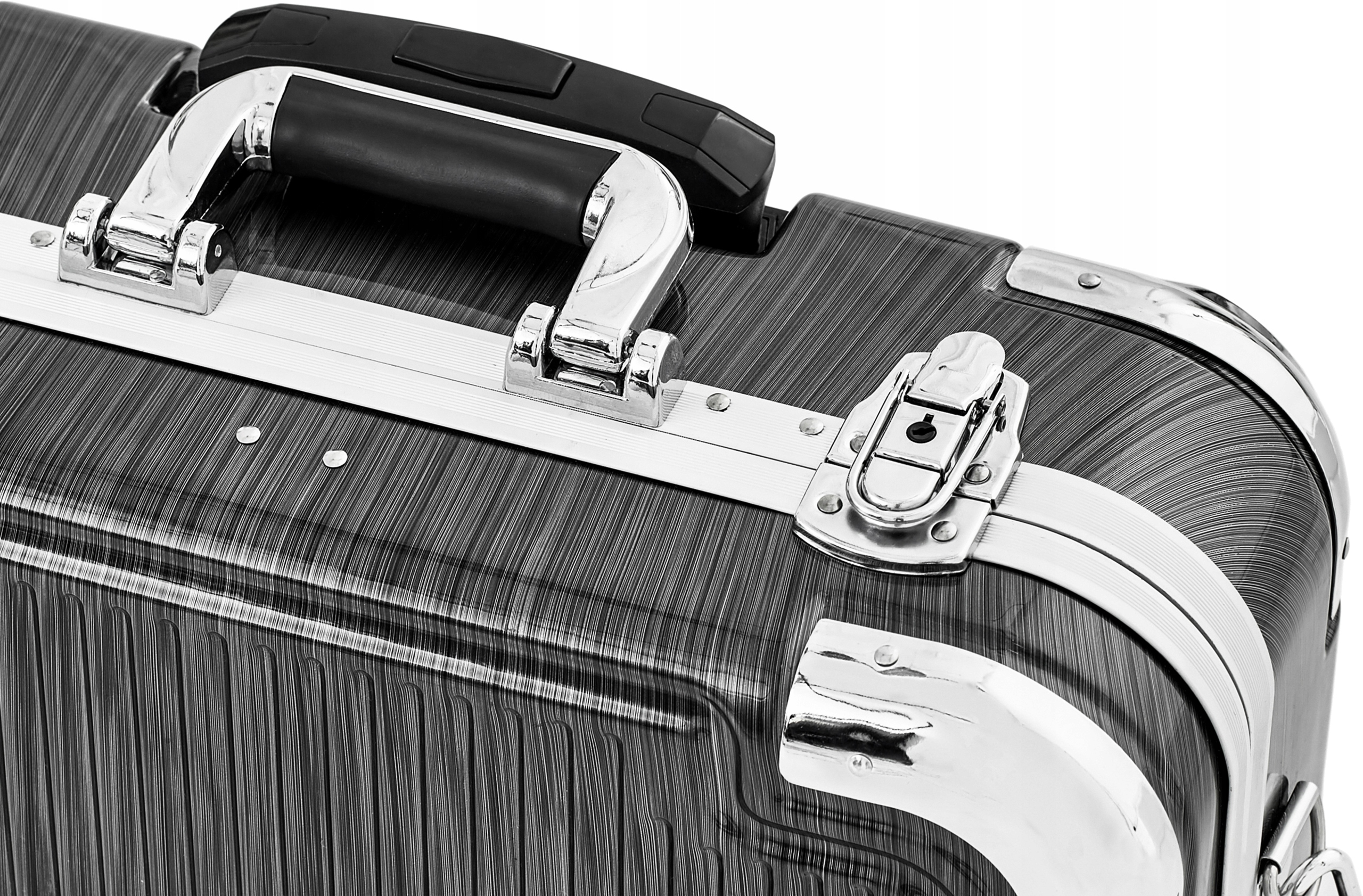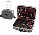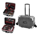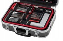 Чемодан изготовлен из материала ABS, характеризующегося высокая устойчивость к царапинам и жесткость. Включает в себя кольца и выдвижную ручку для вождение. Внутренние стенки изготовлены из черно-красной амортизирующей пены.