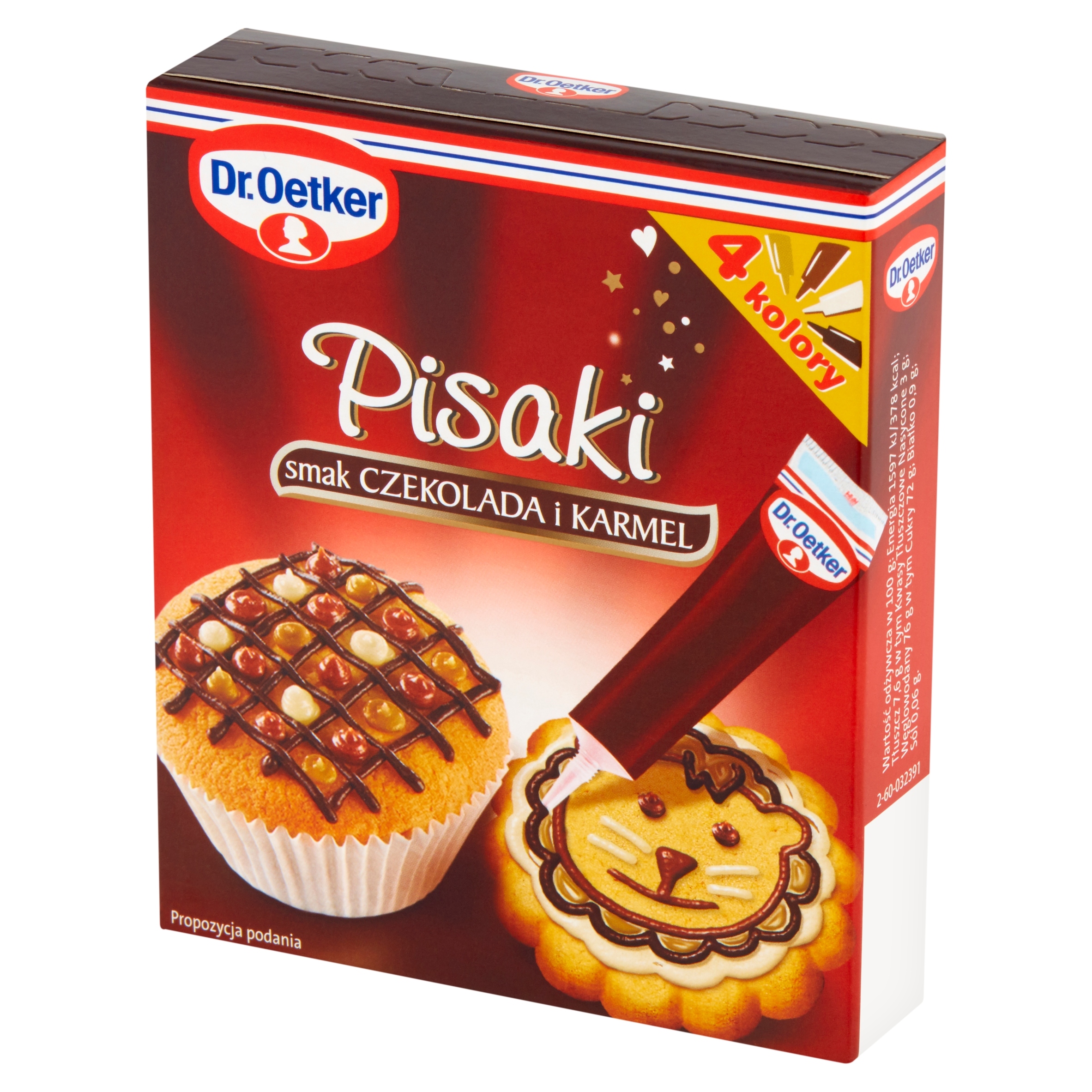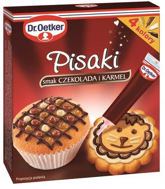 Pisaki o smaku czekolady deserowej, mlecznej i białej oraz karmelu pozwolą stworzyć wyjątkowe dekoracje na każdą okazję. Rysuj fantazyjne wzory, pisz słodkie dedykacje i ciesz się kreatywną zabawą. Doskonałym tłem dla Pisaków mogą być Polewy czekoladowe Dr. Oetkera. Możesz też dekorować bezpośrednio na suchych powierzchniach ciasta.