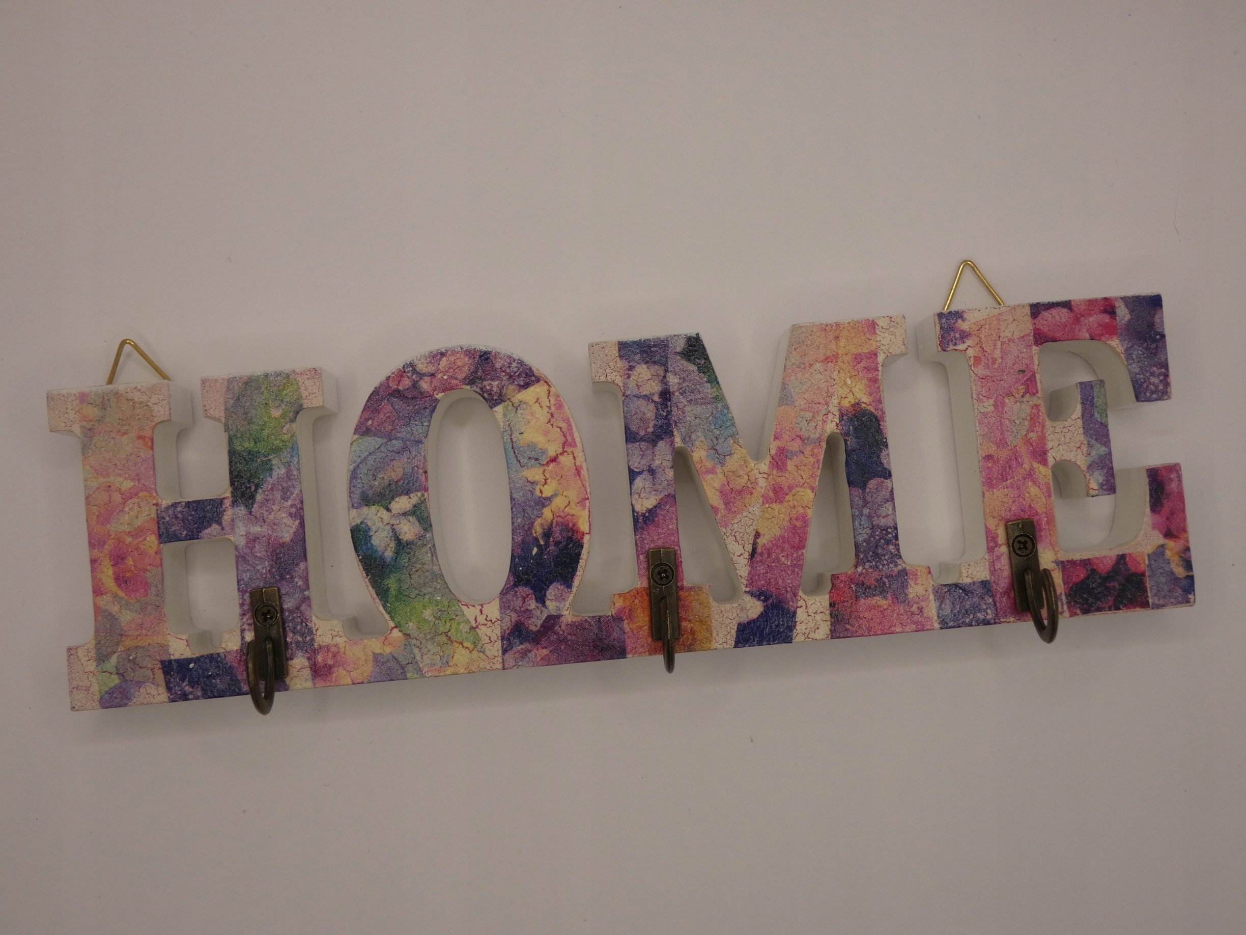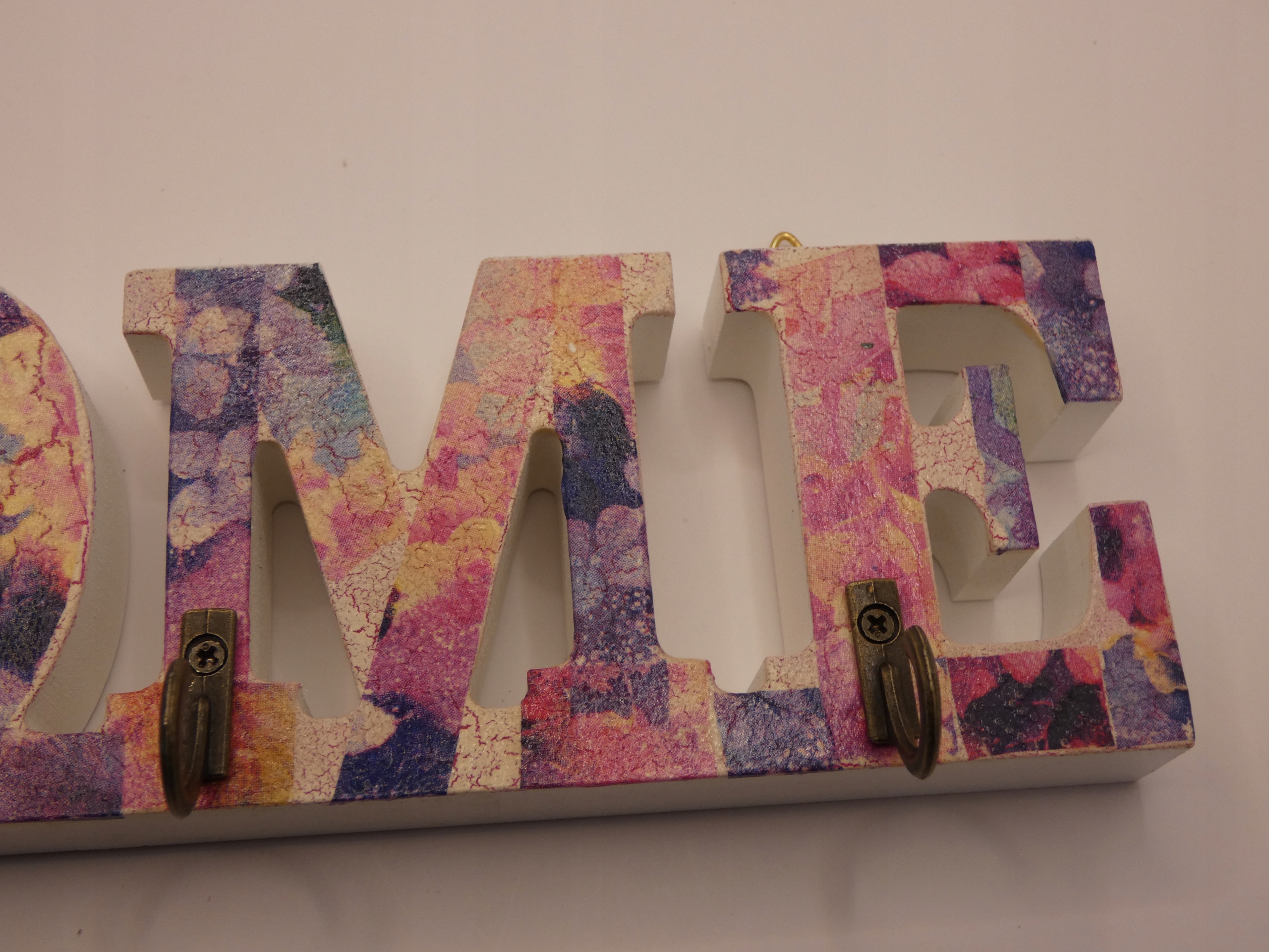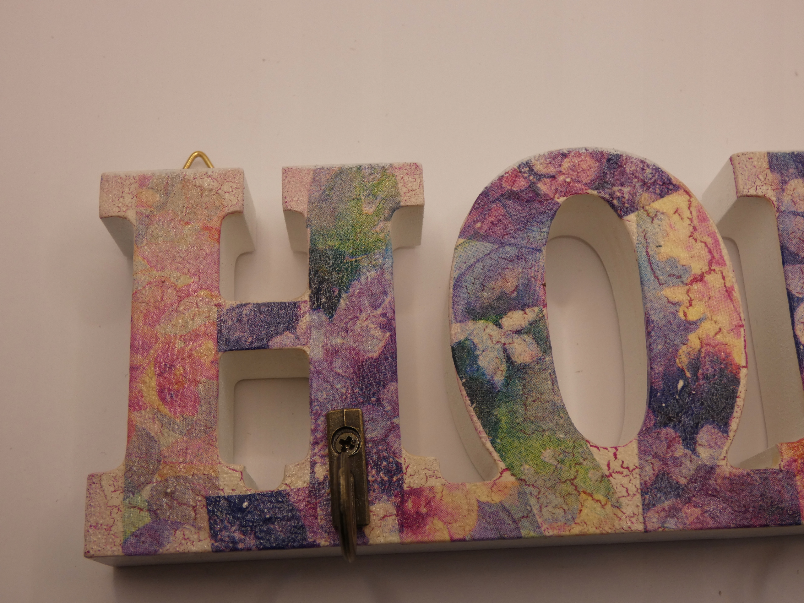 Wieszak ozdobiony ręcznie techniką decoupage, różowy, w fioletowe kwiaty, na napisie home. Wymiary 24 x 7cm. Trzy haczyki na klucze i drobiazgi (breloczki, smycze itd). Z tyłu zawieszki do przymocowania wieszaczka do ściany lub mebla. Niepowtarzalny, praktyczny prezent do biura lub przedpokoju :-)