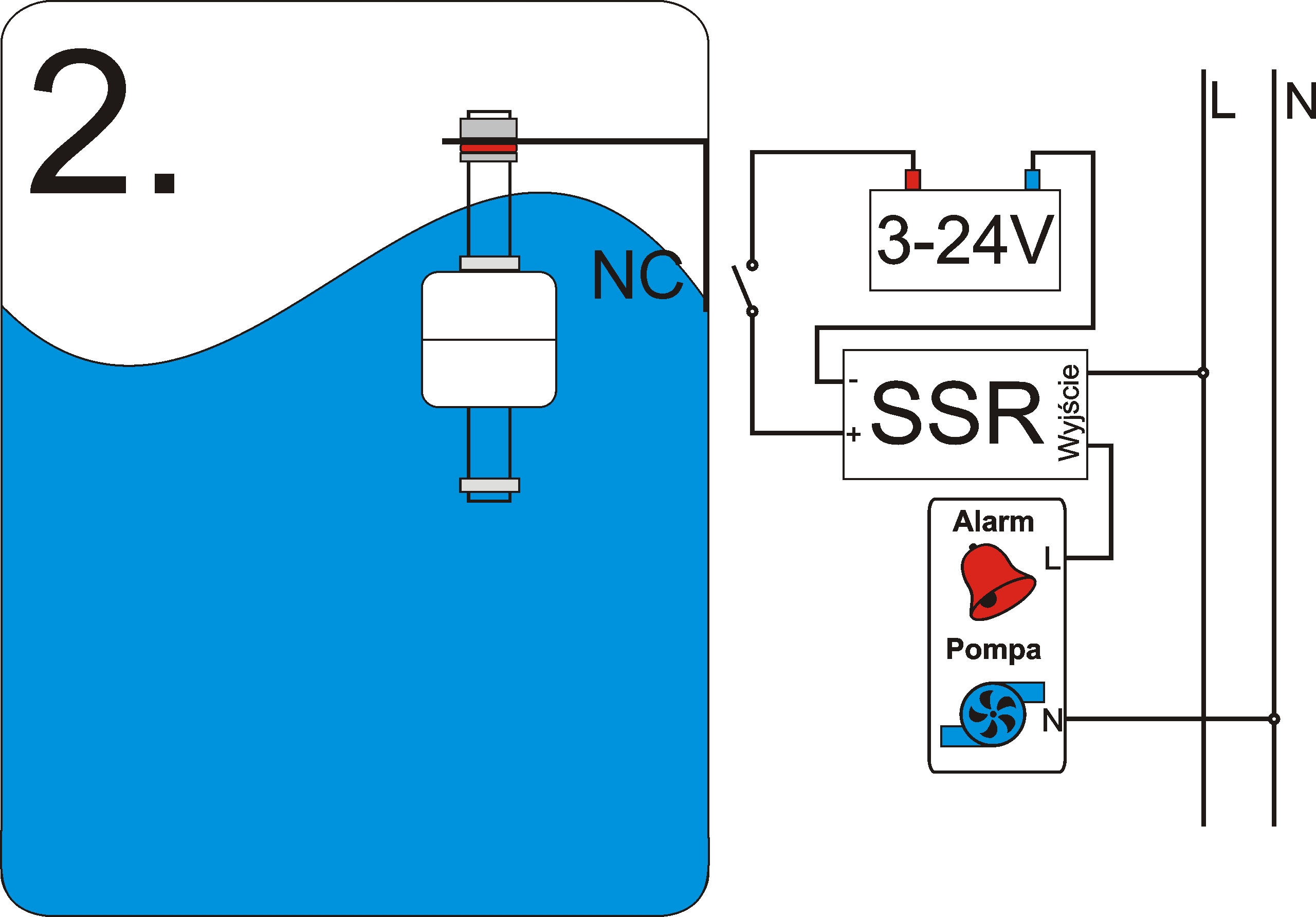 2. Нормально закрытый - когда уровень жидкости опускается ниже уровня датчика цепь будет включена