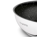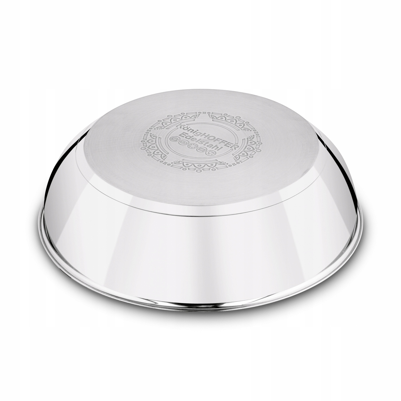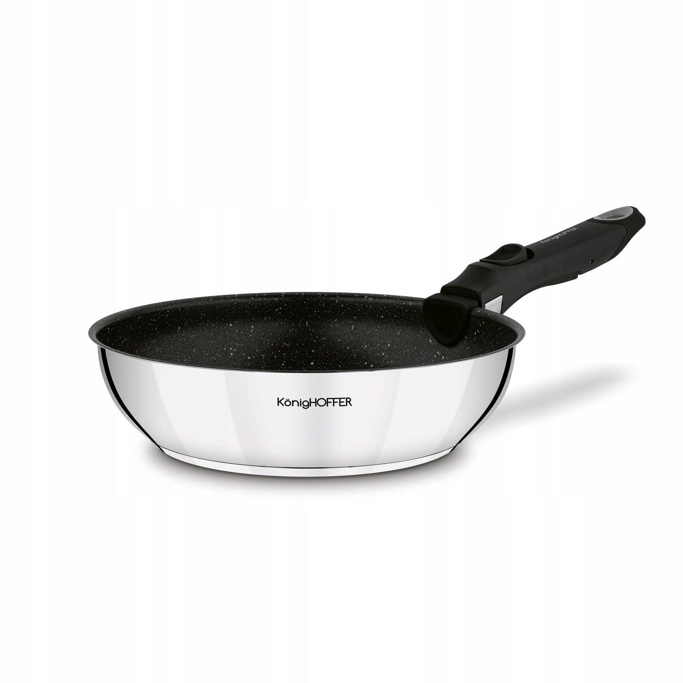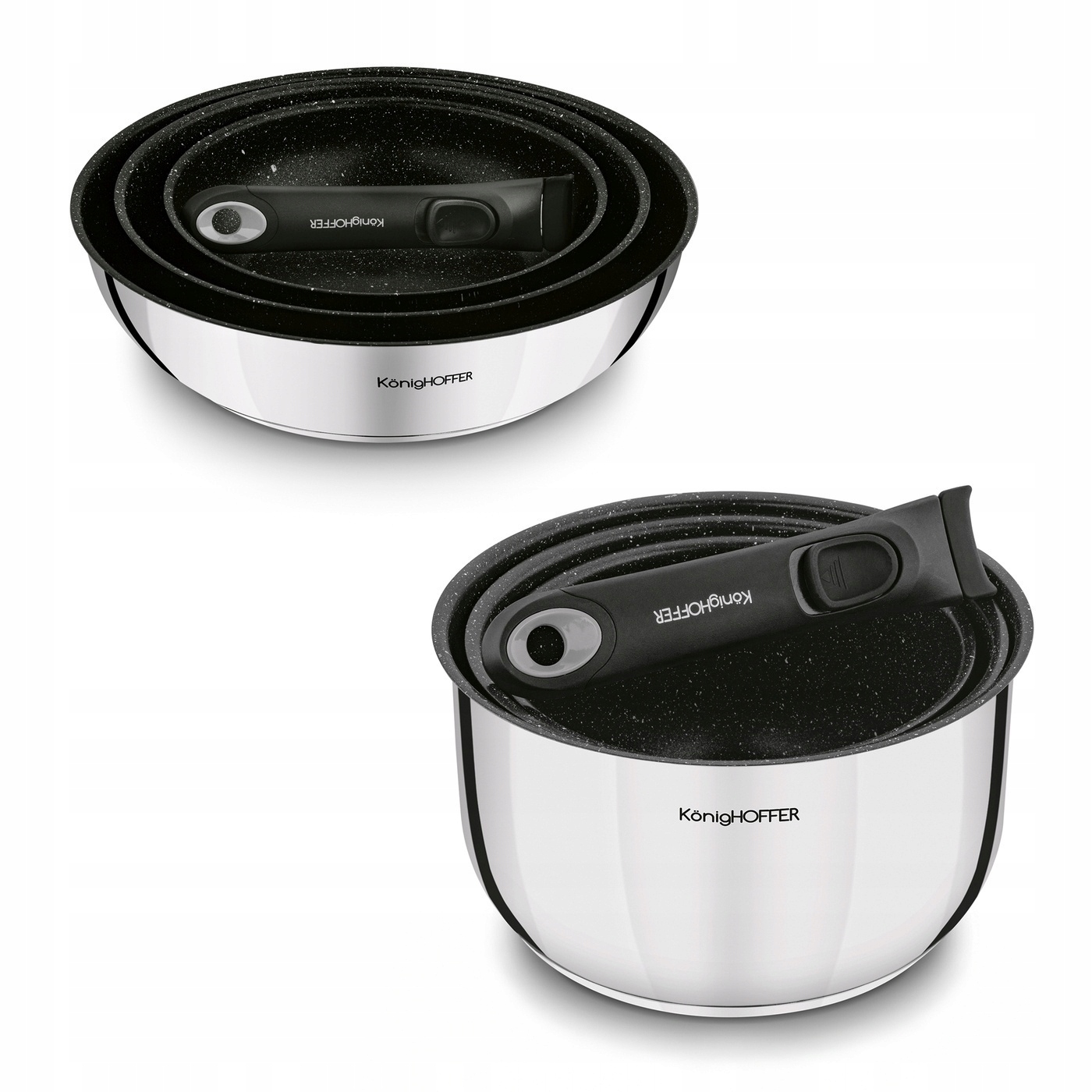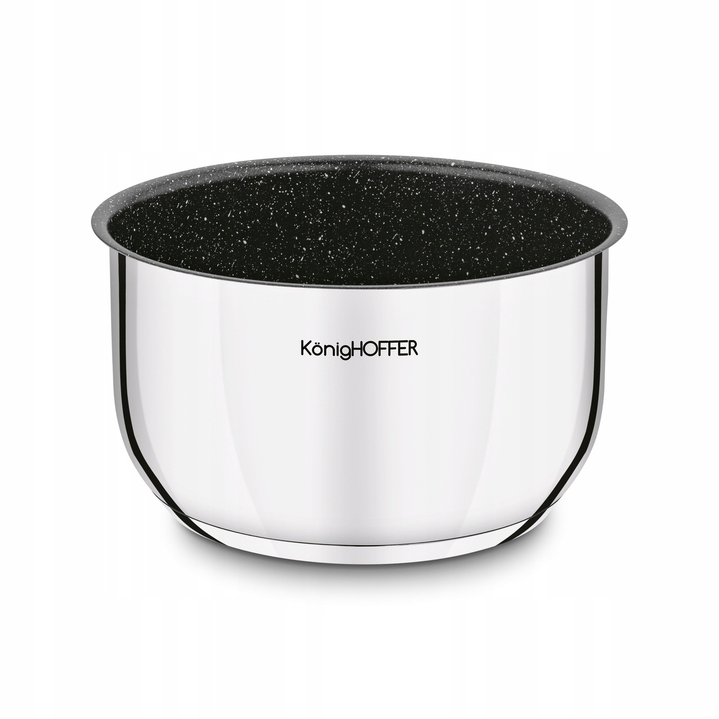 Komplet garnków i patelni głębokich non-stick z powłoką typu stone Konighoffer Colate wykonany jest ze stali nierdzewnej. Dzięki temu jest świetnie wyważony i poręczny. Podwyższoną trwałość zapewnia mu powłoka redukująca przywieranie jedzenia. Jej wysoka jakość, twardość oraz struktura zostały opracowane z myślą o wieloletnim smażeniu (np. placków ziemniaczanych) i gotowaniu (np. budyniu). Energooszczędność daje specjalna budowa dna. To dzięki niemu możesz używać garnków i patelni Colate na każdej kuchence. Powłoka nieprzywierająca umożliwi ci dodatkowo smażenie na niewielkiej ilości tłuszczu oraz bezproblemową pielęgnację. Zniesie przy tym też wiele cykli ścierania (więcej niż zwykłe naczynia non-stick typu marmur dostępne na rynku). Przenoszenie i użytkowanie zestawu zapewniają 2 rączki, które się wolno nagrzewają i pewnie leżą w dłoni. Są one uniwersalne i odpinane, a więc pasują do każdej średnicy garnków/patelni z powłoką marmurową typu stone Colate. Z ich pomocą o wiele łatwiej zmieścisz naczynia w kuchennej szafce lub szufladzie. Z tym kompletem bez problemu stworzysz też swój własny zestaw naczyń kuchennych do domowego użytku i dla całej rodziny. To jedna z najlepszych opcji w tej kategorii!