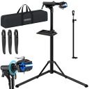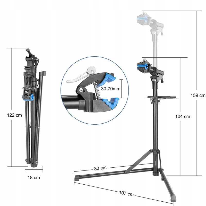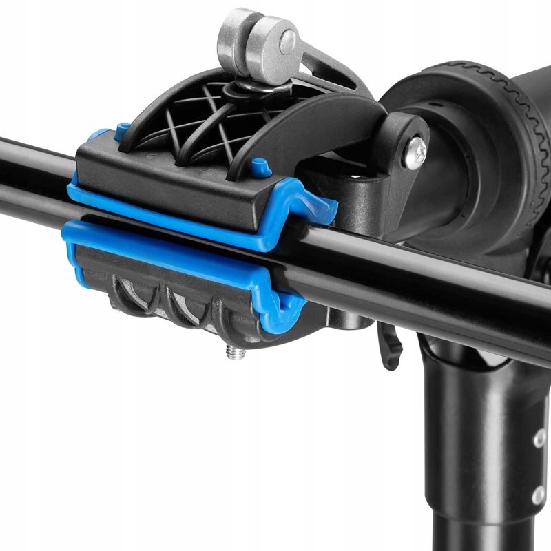 Elementy plastikowe są wykonane z wysokiej jakości, odpornego na uderzenia tworzywa ABS. Stojak montażowy cechuje prostota i szybkość, pozwala precyzyjnie wyrównać rower i łatwiej wykonać pracę. Wszystkie ruchome elementy są wyposażone w szybkozamykacze lub przymocowane do głównego ramienia za pomocą dużej nakrętki motylkowej. Montaż uchwytu stojaka jest możliwy między siodłem a kierownicą, a także między stojakiem montażowym a kierownicą lub przednim kołem. Regulacja odległości roweru od stojaka poprzez elastyczny pasek, który chwyta za kierownicę lub przednie koło w zakresie 50 do 90 cm. Podczas pracy drążek teleskopowy, który można regulować w zakresie od 104 do 159 cm, utrzymuje zawieszony sprzęt sportowy, rama jest przymocowana za pomocą regulowanego zacisku. Naprawy można zatem przeprowadzać na poziomie oczu, wygodna pozycja pracy chroni plecy i kolana. Stabilność konstrukcji gwarantuje szeroki rozkład nóg. Stojak ma magnetyczną półkę na narzędzia, dzięki czemu nie zgubisz śrub i nakrętek podczas pracy. Stojak nadaje się do rowerów o grubości ramy 30-70 mm, a dzięki pełnej gumowej powłoce zapobiega zarysowaniom na ramie koła Uwaga! Rama powinna być dokładnie wyczyszczona, w przeciwnym razie mogą pojawić się zadrapania z kamieni, piasku itp., ocierających się o uchwyt.