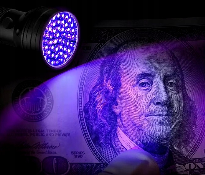 ➡️ Weryfikacja autentyczności dokumentów: Latarki UV są często wykorzystywane do sprawdzania autentyczności banknotów, paszportów, kart kredytowych i innych dokumentów zabezpieczonych elementami widocznymi jedynie w świetle UV.