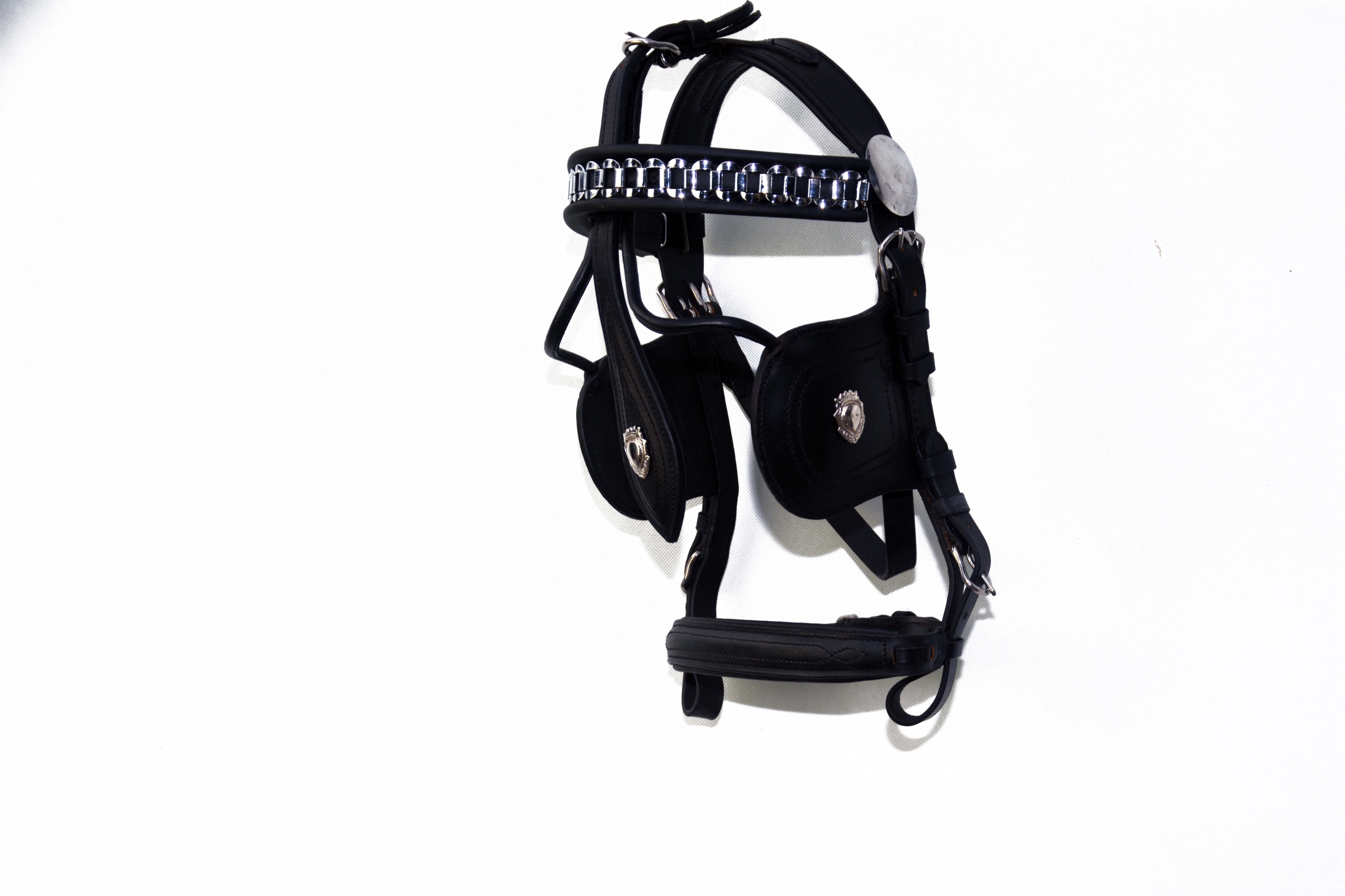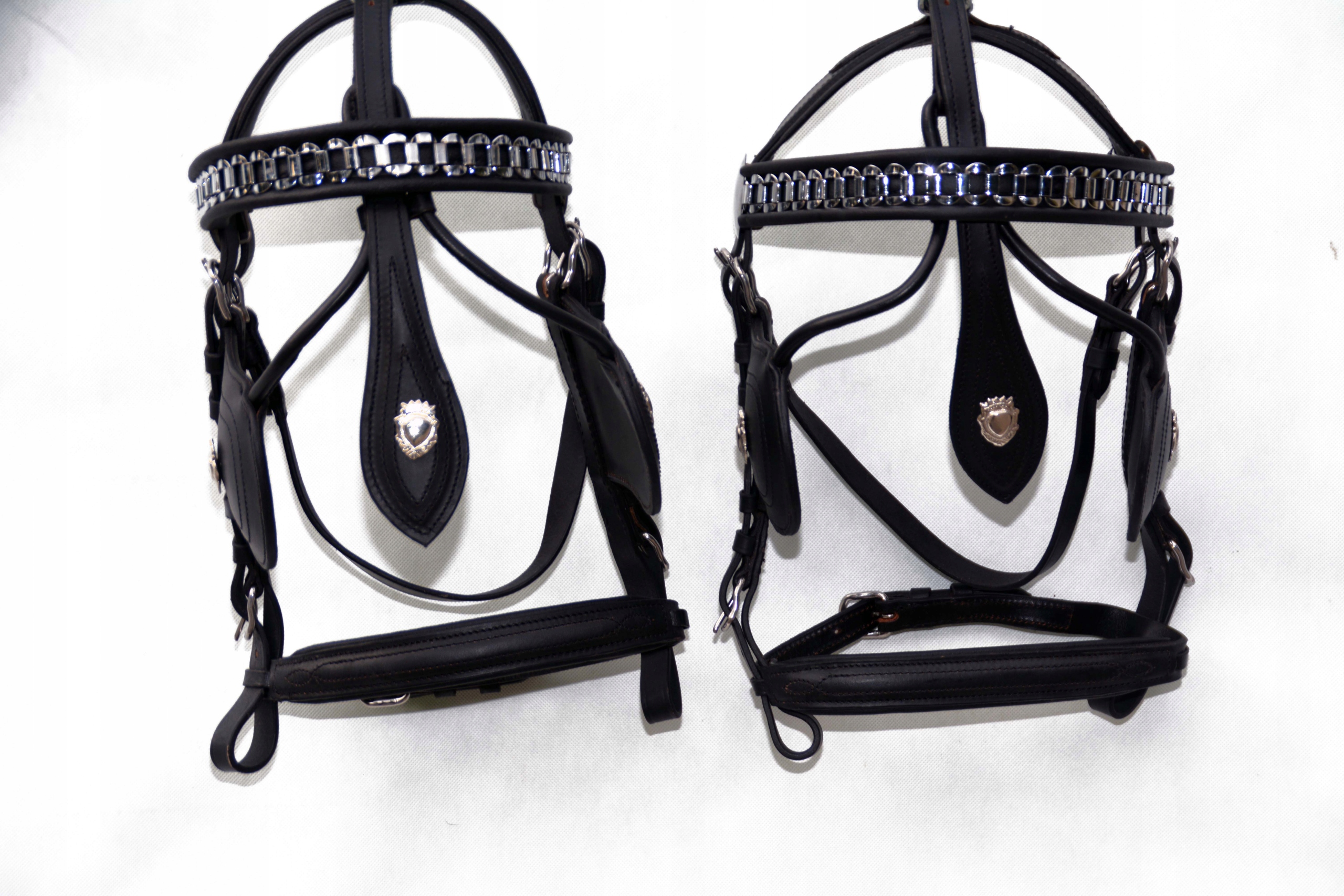 Ogłowie zaprzęgowe z okularami roz. full Ogłowie wykonane w całości ze skóry licowej ,wszystkie okucia i sprzączki wykonane ze stali szlachetnej ,ogłowie zdobione .