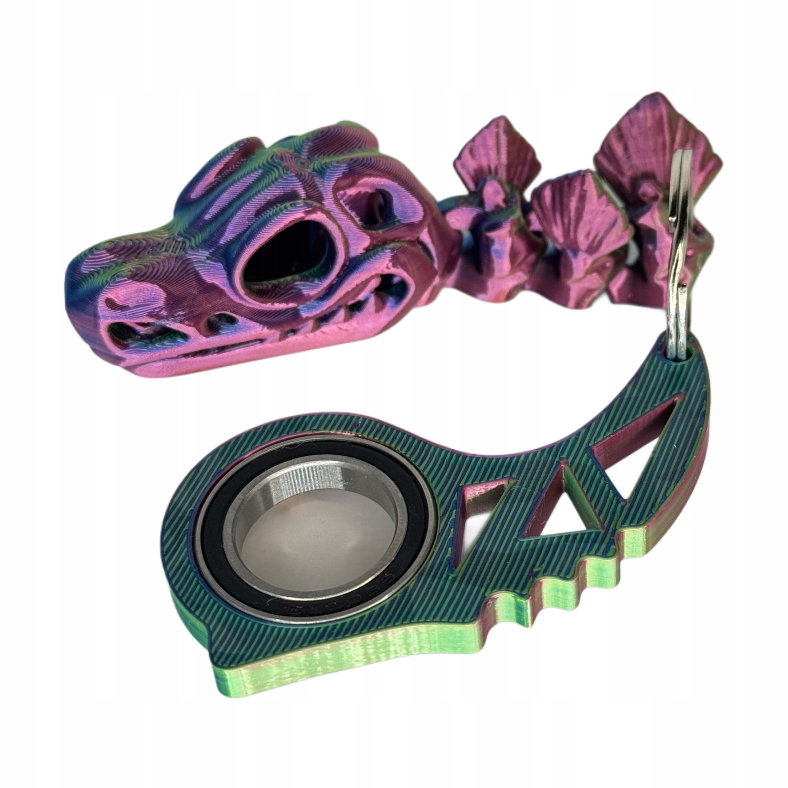 Przedstawiamy unikalny Keyspinner z przyczepioną zawieszką w T-Rex, wydrukowany w technologii 3D w kolorze Aurora. Ta wyjątkowa zabawka łączy w sobie funkcjonalność i estetykę, będąc doskonałym dodatkiem do kluczy, plecaka czy torby.