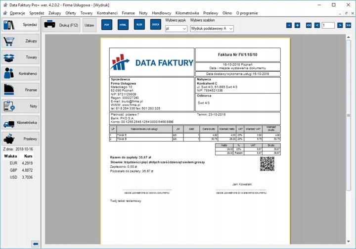 Data Faktury jest prostym i jednocześnie rozbudowanym programem do wystawiania faktur, który dzięki swojej konstrukcji pozwoli w kilka minut zacząć pracę nawet mniej obeznanemu użytkownikowi. Program Data faktury jest skierowany do małych i średnich przedsiębiorstw. Program otrzymuje aktualizacje w ramach zakupionej licencji, które wydajemy w odstępach około miesięcznych uzupełniając program o nowe funkcje oraz aktualne przepisy już od ponad 18 lat.