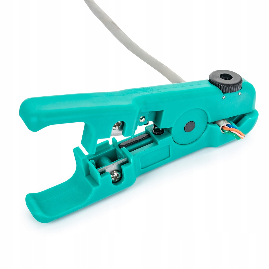 Narzędzie umożliwia także zaciskanie ekranów wtyków na przewodzie.