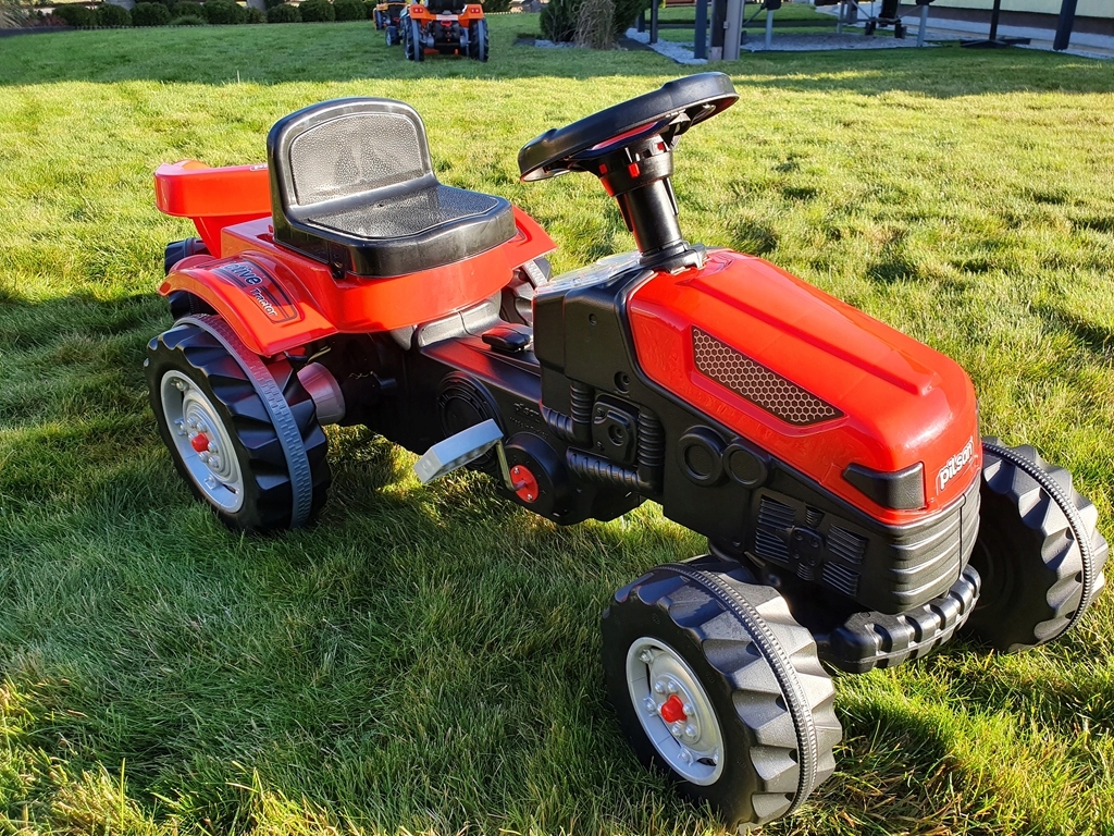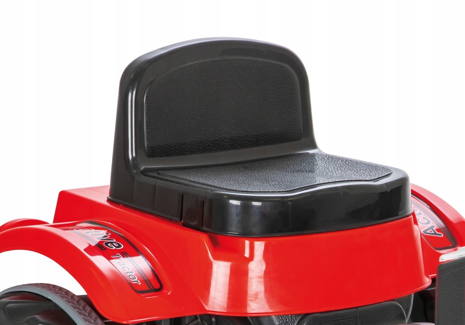 Traktor napędzany jest za pośrednictwem pedałów które stabilnie zamocowane są w konstrukcji nośnej zabawki. Bardzo ciekawą funkcją jest możliwość regulacji siedzenia w zakresie przód – tył, umożliwia odpowiednie przygotowanie pojazdu do wysokości dziecka. Dodatkowo na wyposażeniu znajduje się duża przyczepka w której można przewozić zabawki, wiaderka, łopatki czy też piasek i kamienie.