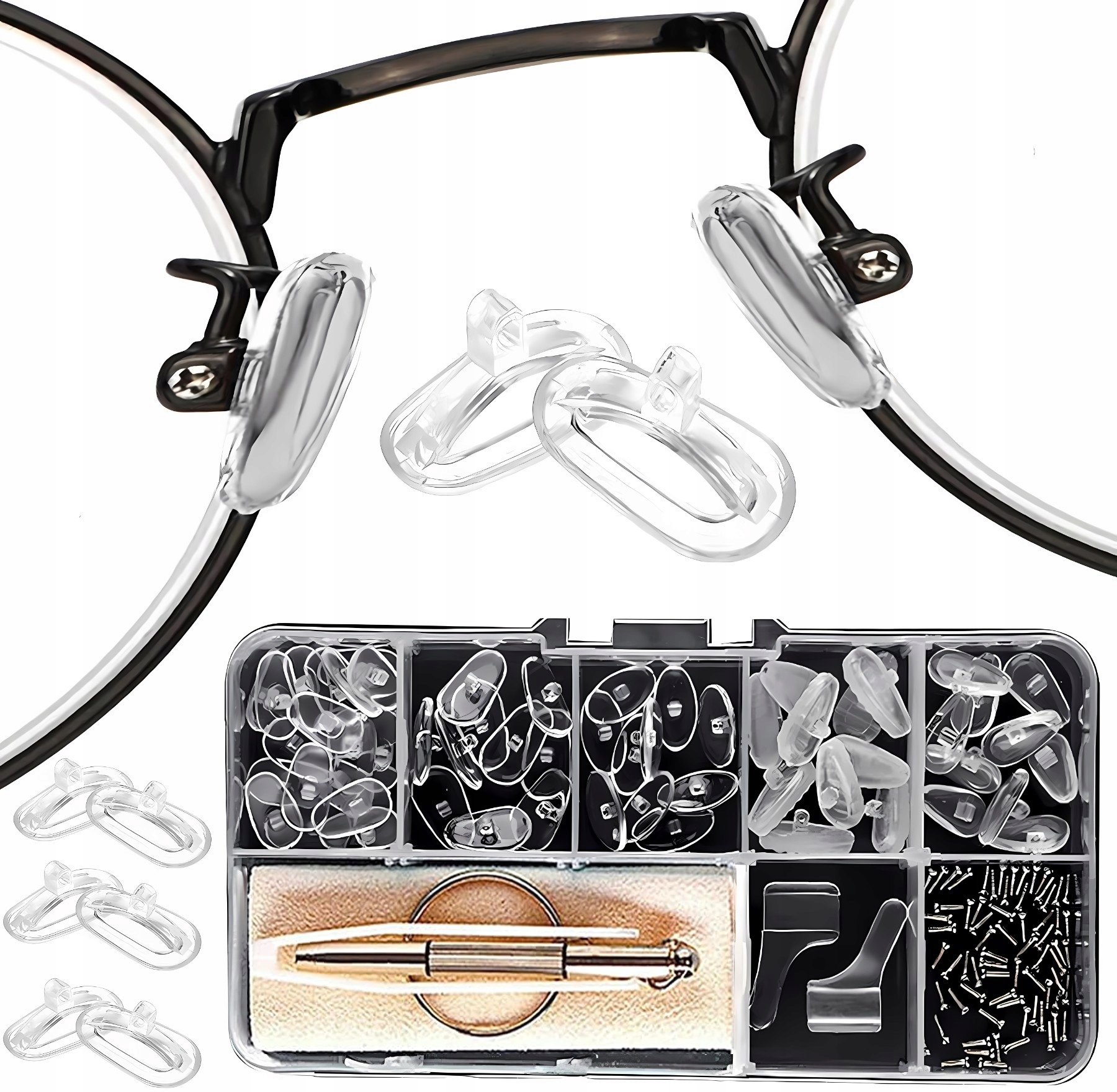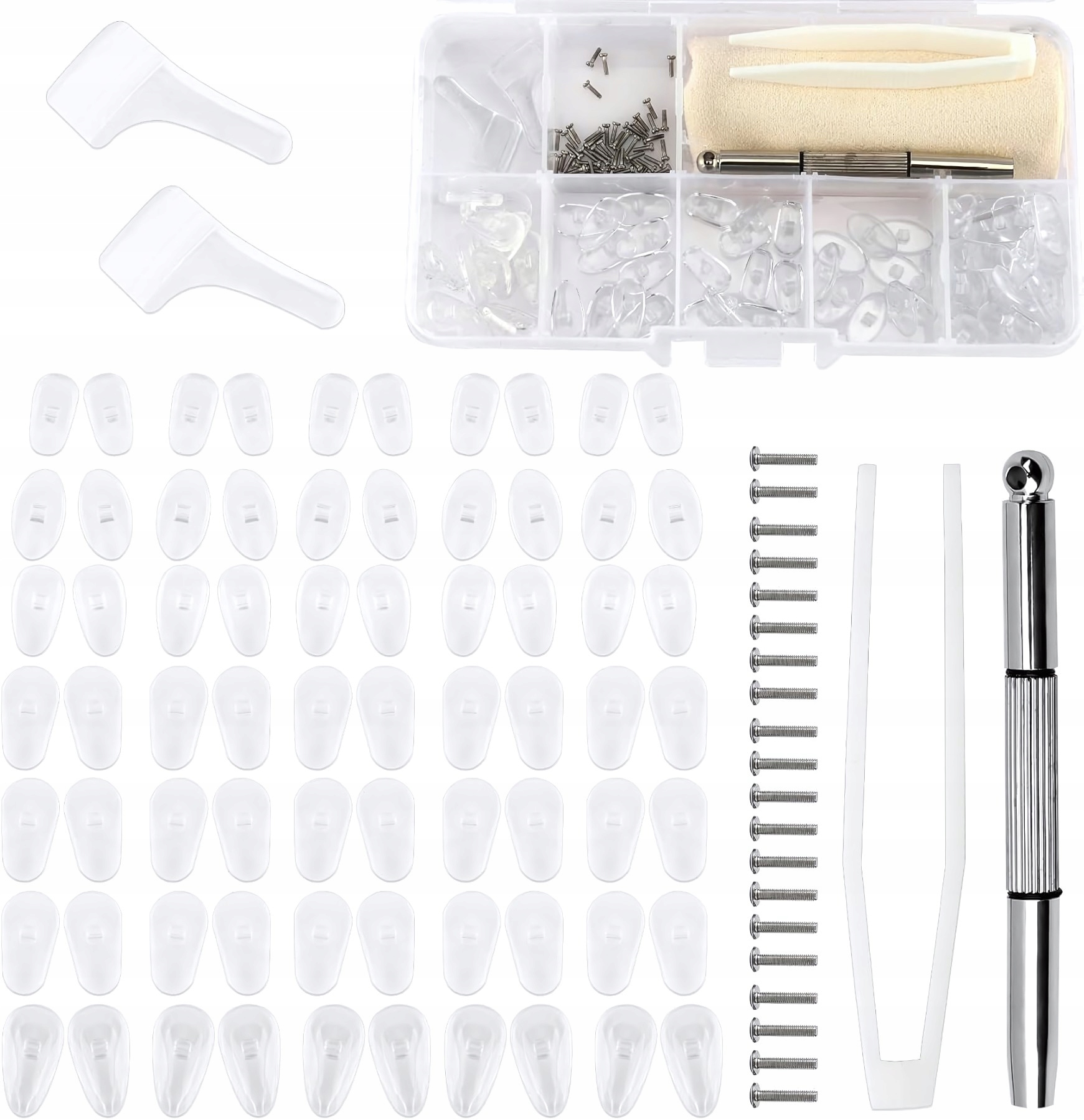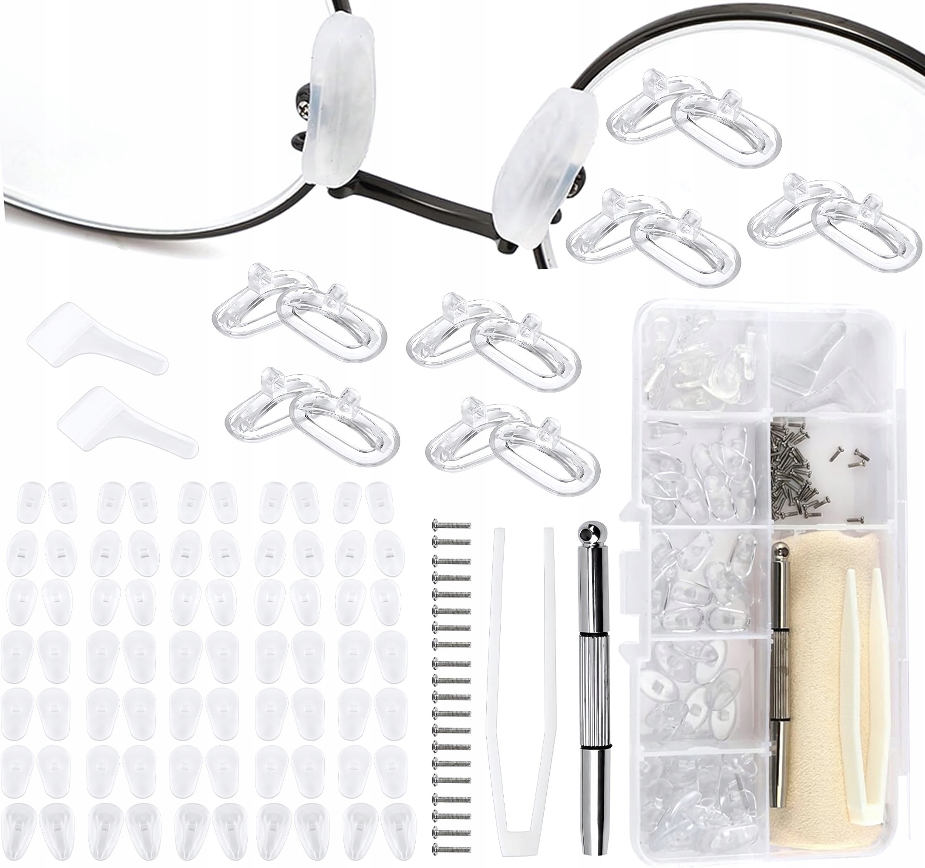 ✅ Zawartość zestawu: zawiera 35 par wymiennych nosków (5 rodzajów), 1 śrubokręt, komplet śrub, pensete, ściereczkę do czyszczenia, 1 parę osłon na nóżki okularów.