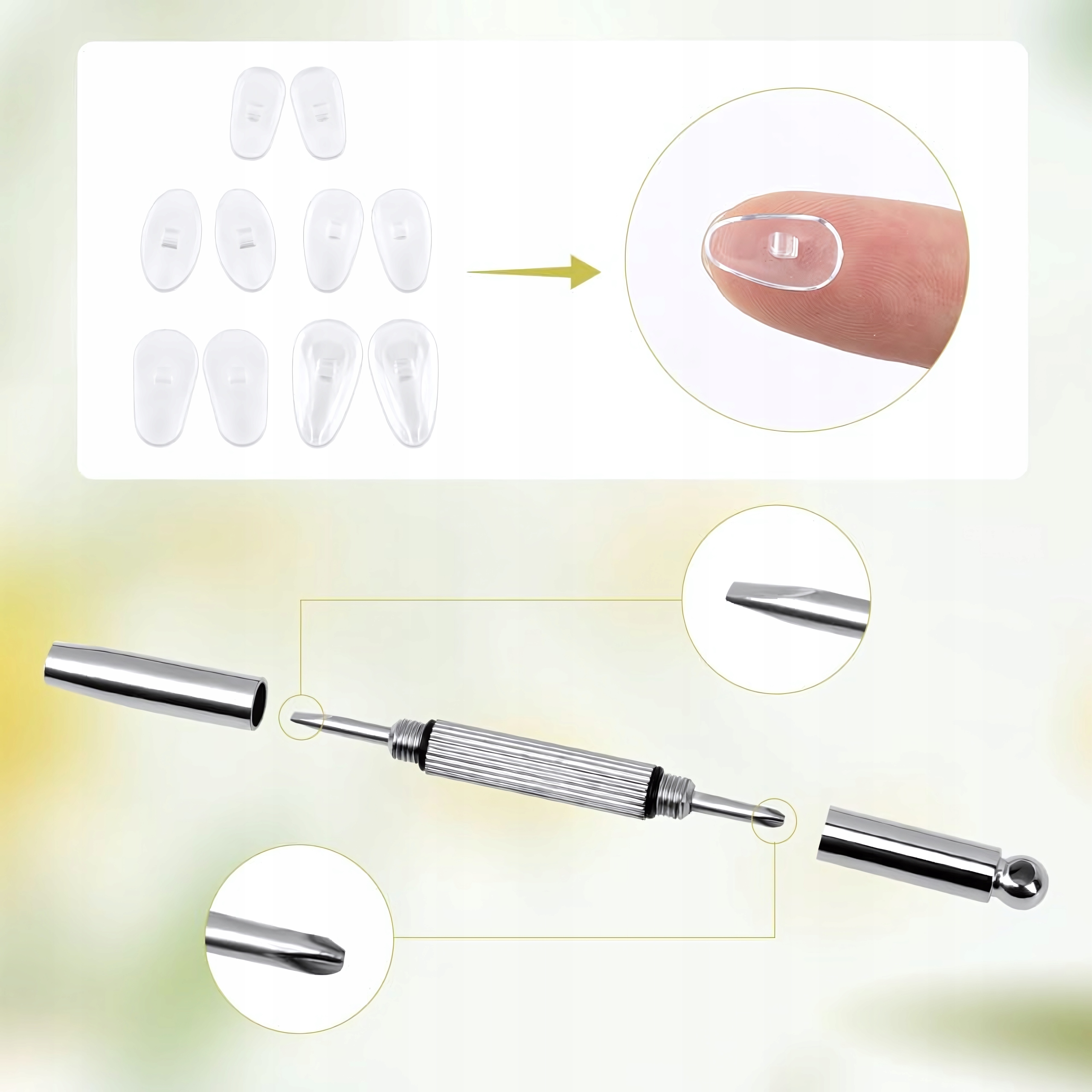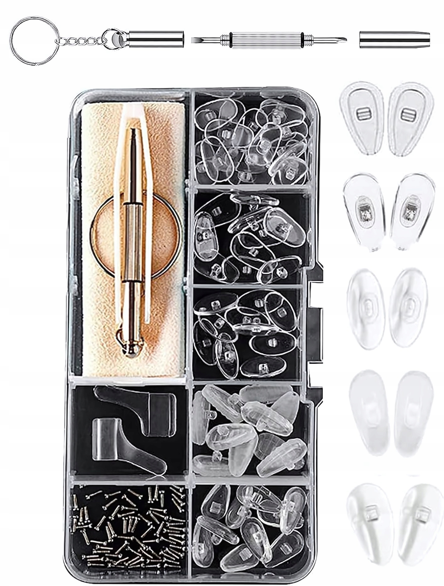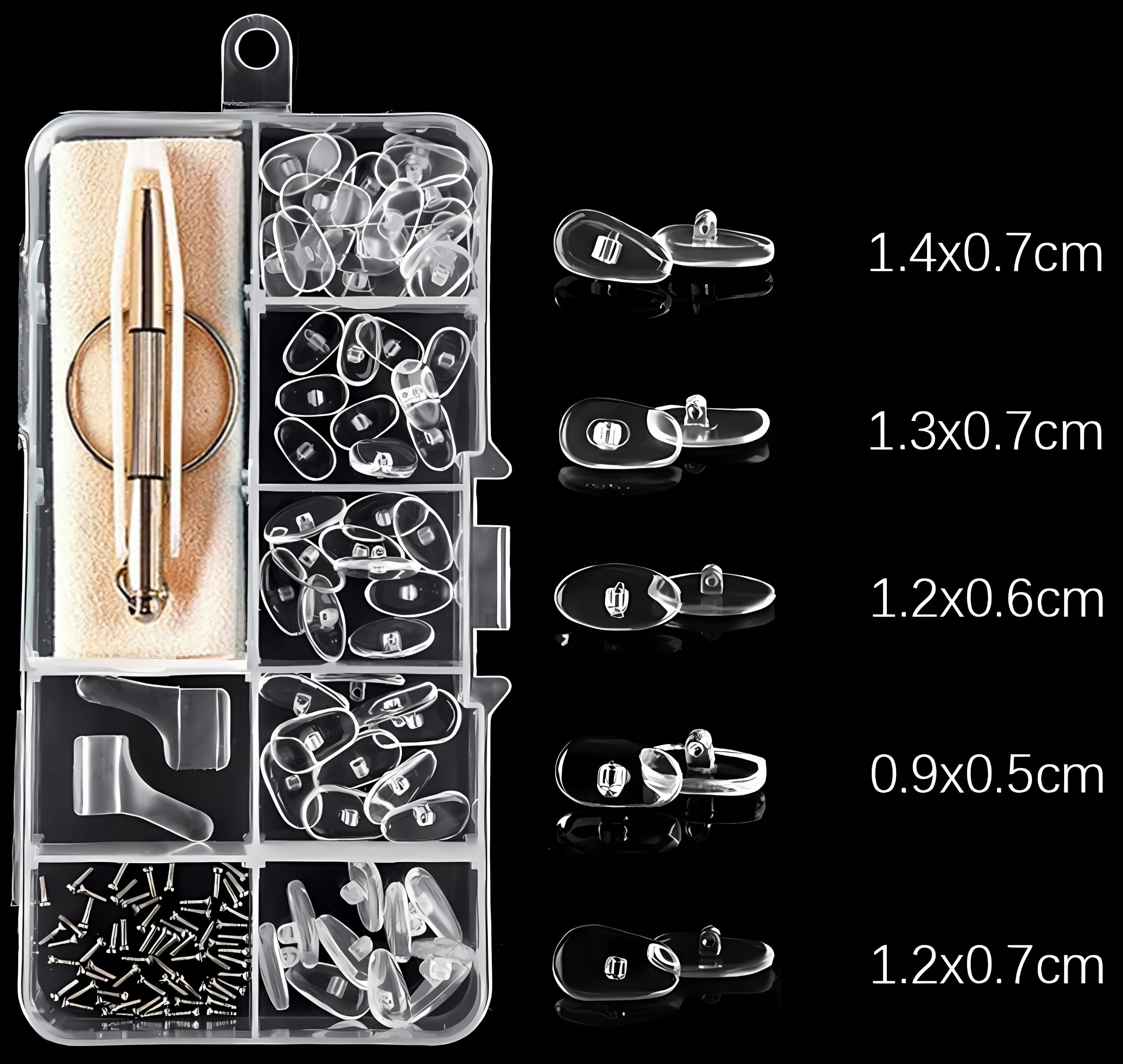 ✅ Zawartość zestawu: zawiera 35 par wymiennych nosków (5 rodzajów), 1 śrubokręt, komplet śrub, pensete, ściereczkę do czyszczenia, 1 parę osłon na nóżki okularów.