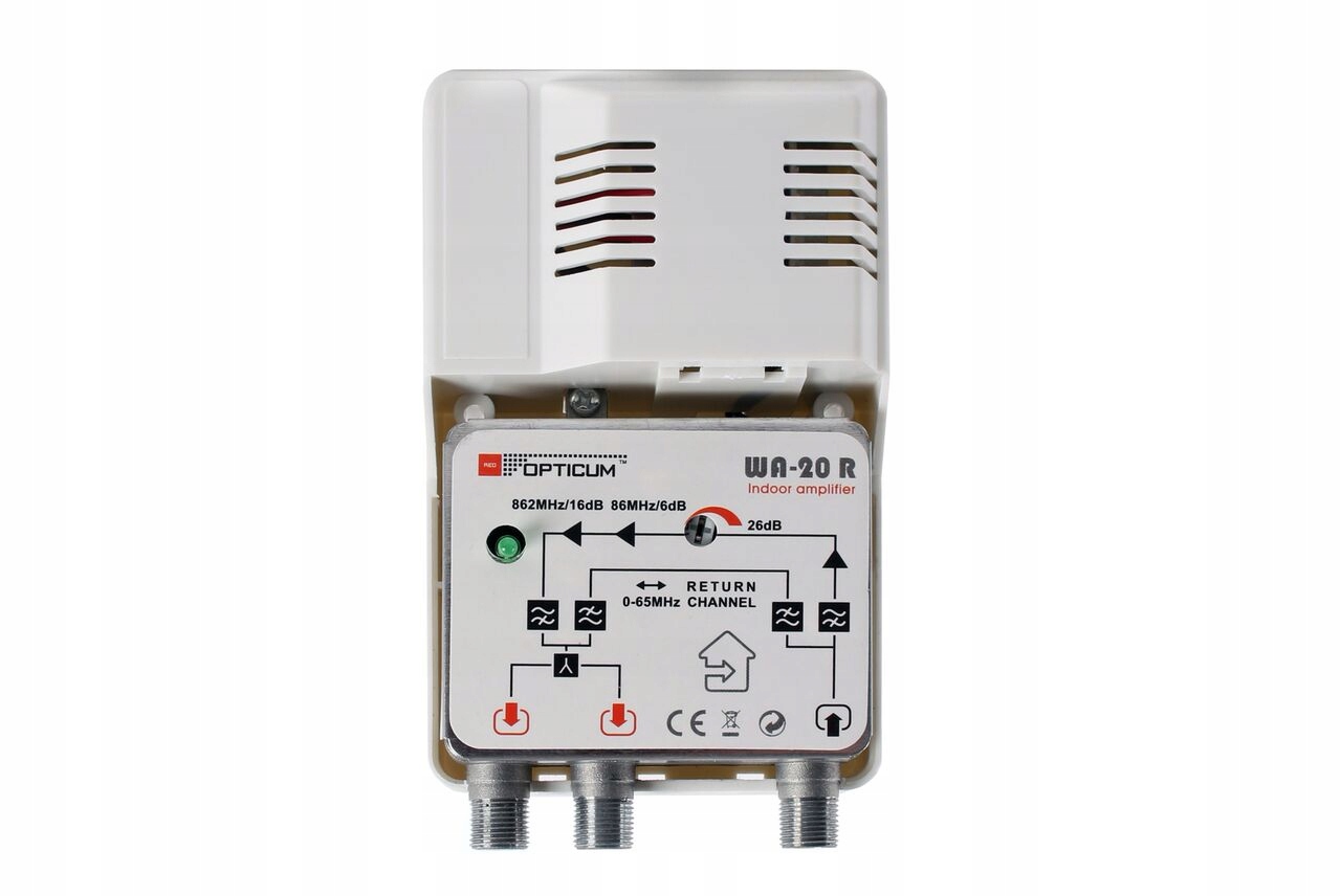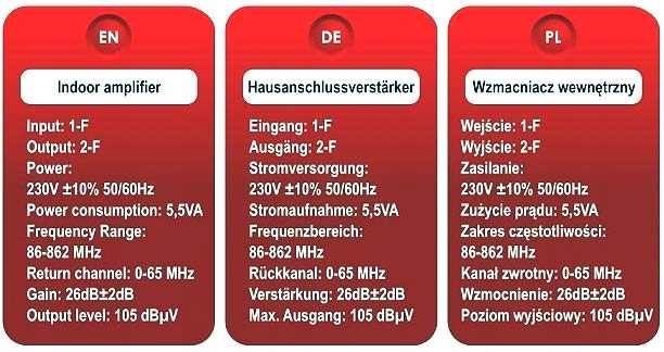 Wzmacniacz pracuje w zakresie 86 - 862 MHz. Wzmocnienie wynosi do 26dB. Urządzenie można zamocować bezpośrednio do ściany, w zestawie znajdują się dwa kołki ze śrubami, które to umożliwiają.