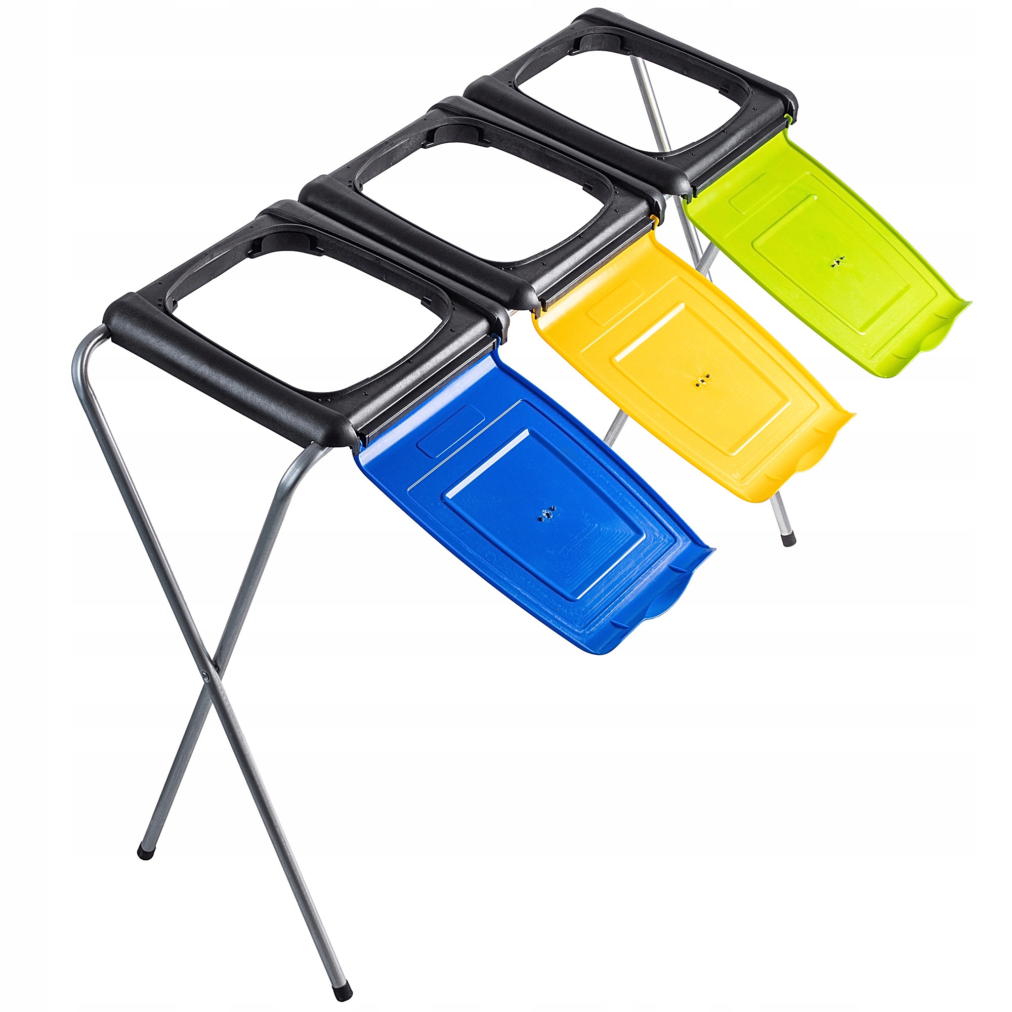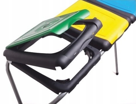 ✅ Kolorowe pokrywy stojaka znacząco ułatwiają rozdzielanie różnych rodzajów odpadów. Zielona pokrywa przeznaczona na worek na szkło, żółta na plastik, niebieska na papier.