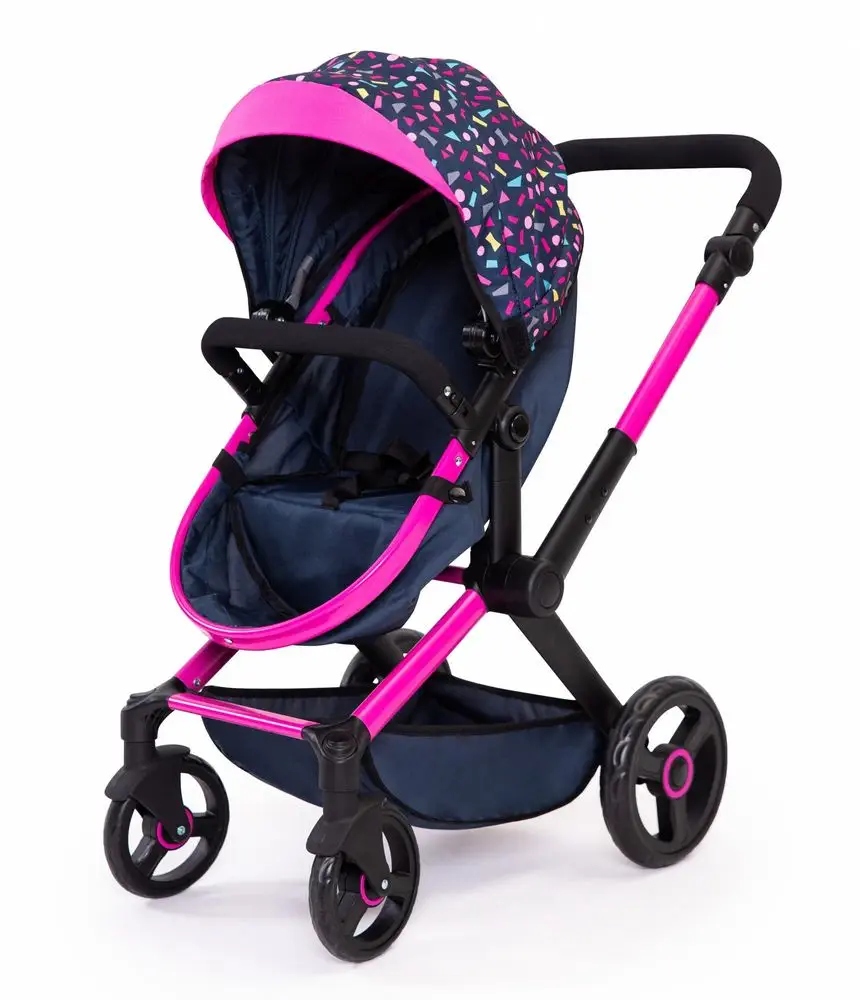 Śliczny wózek granatowo-różowej kolorystyce, z aplikacją wróżki i tęczy, zachwyci każdą "małą mamę"