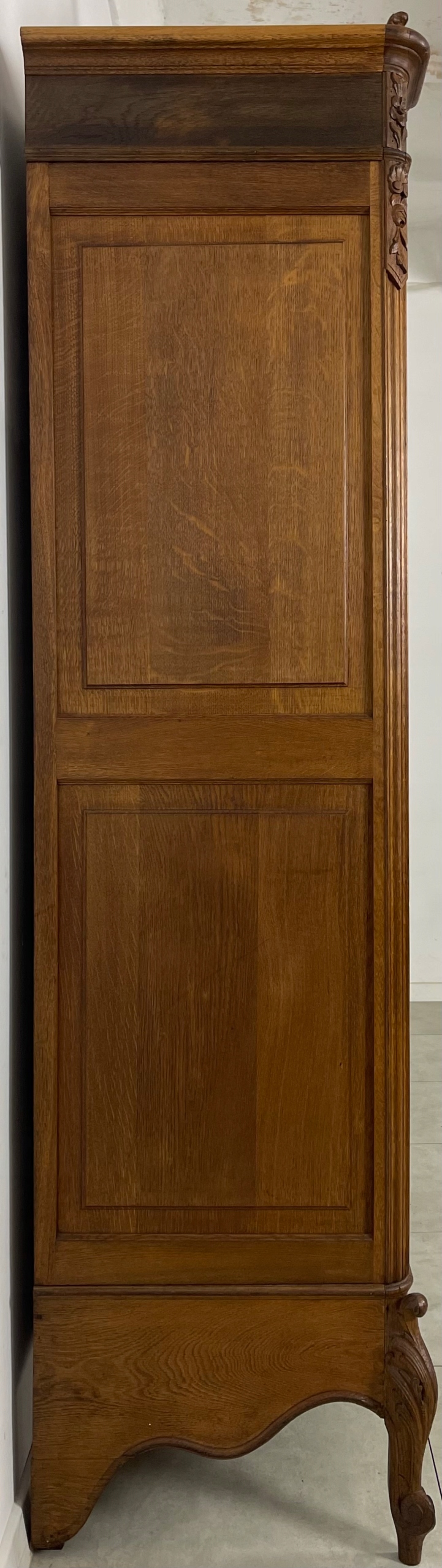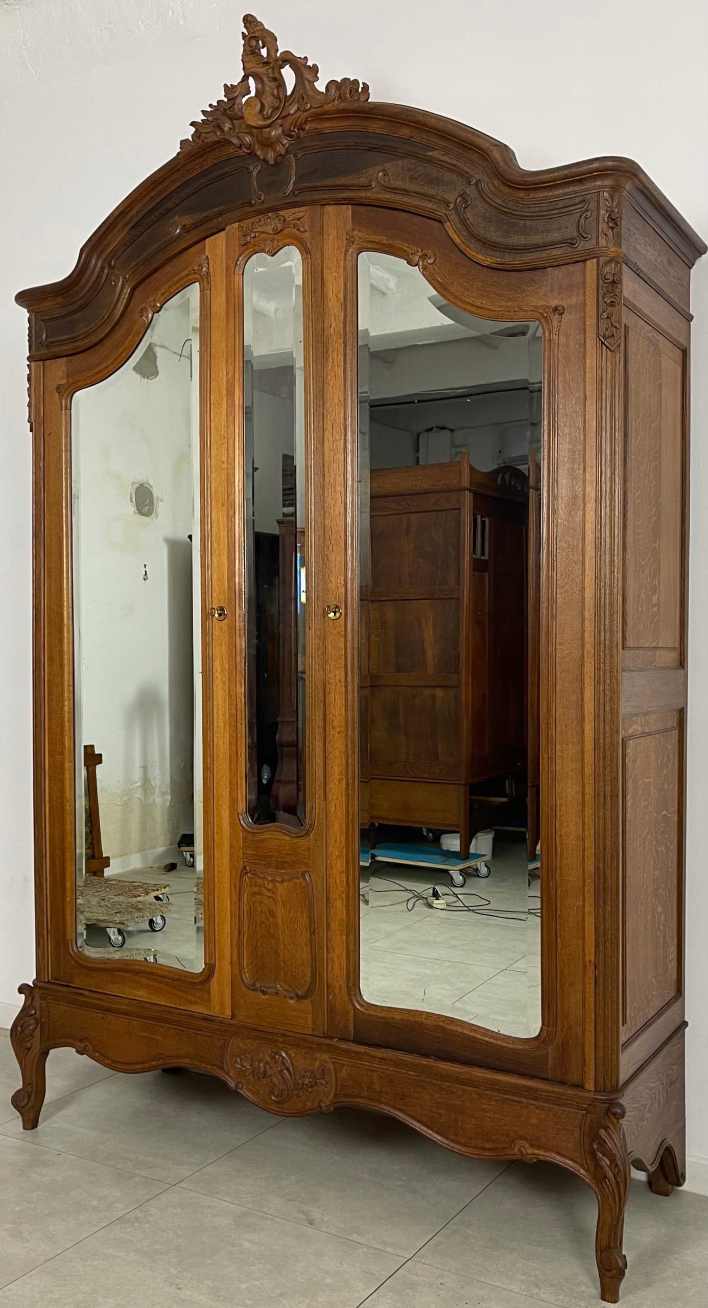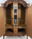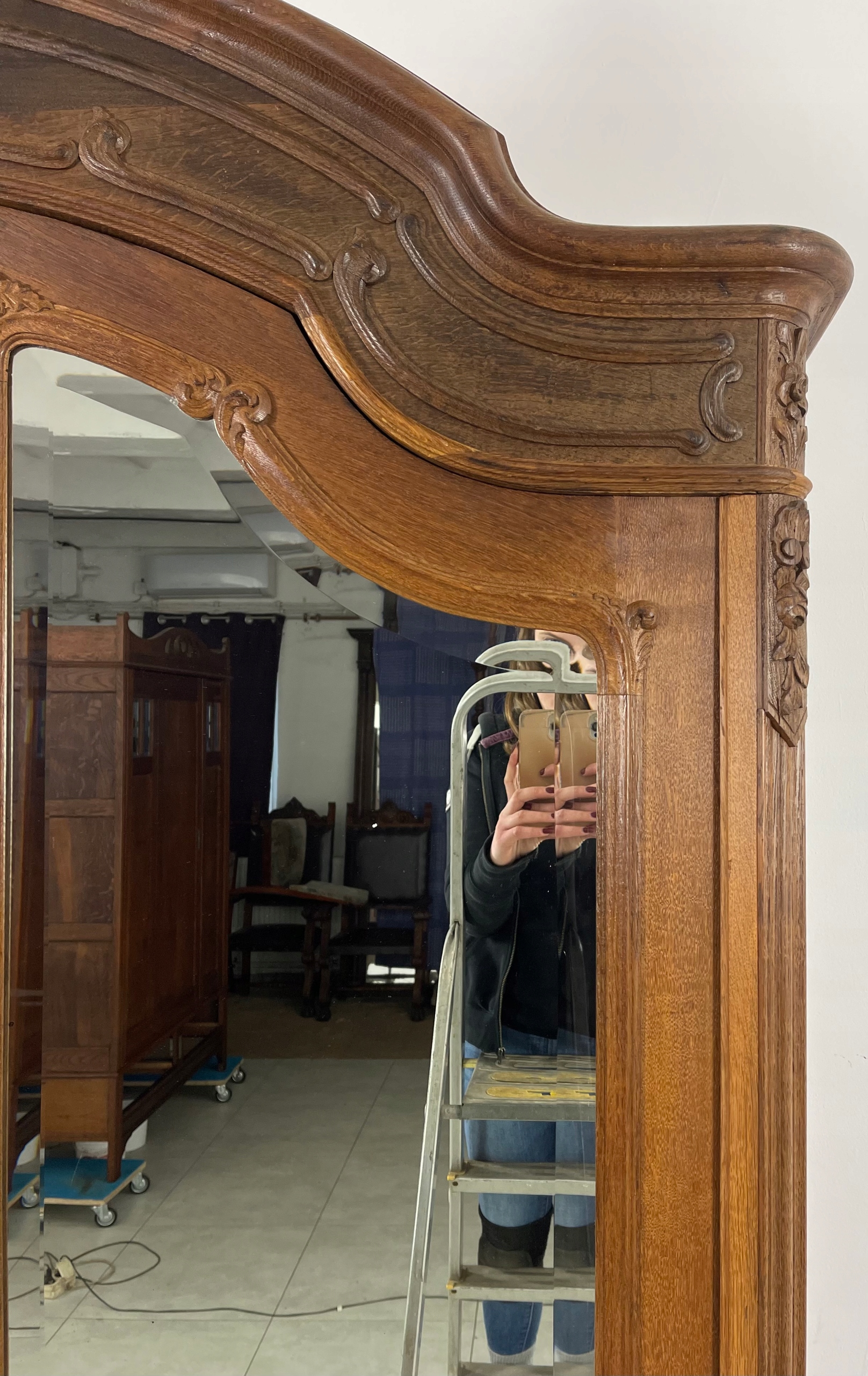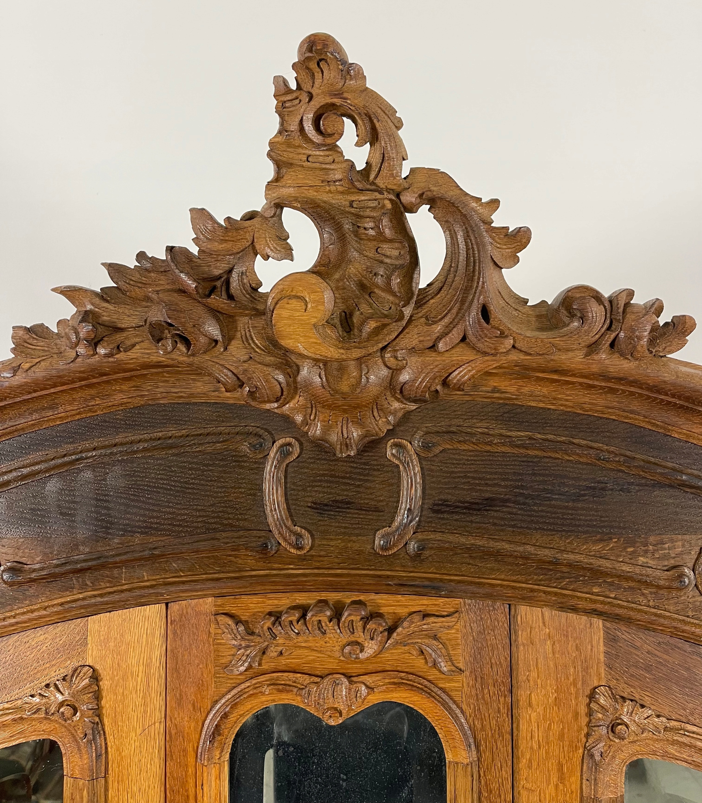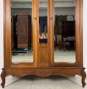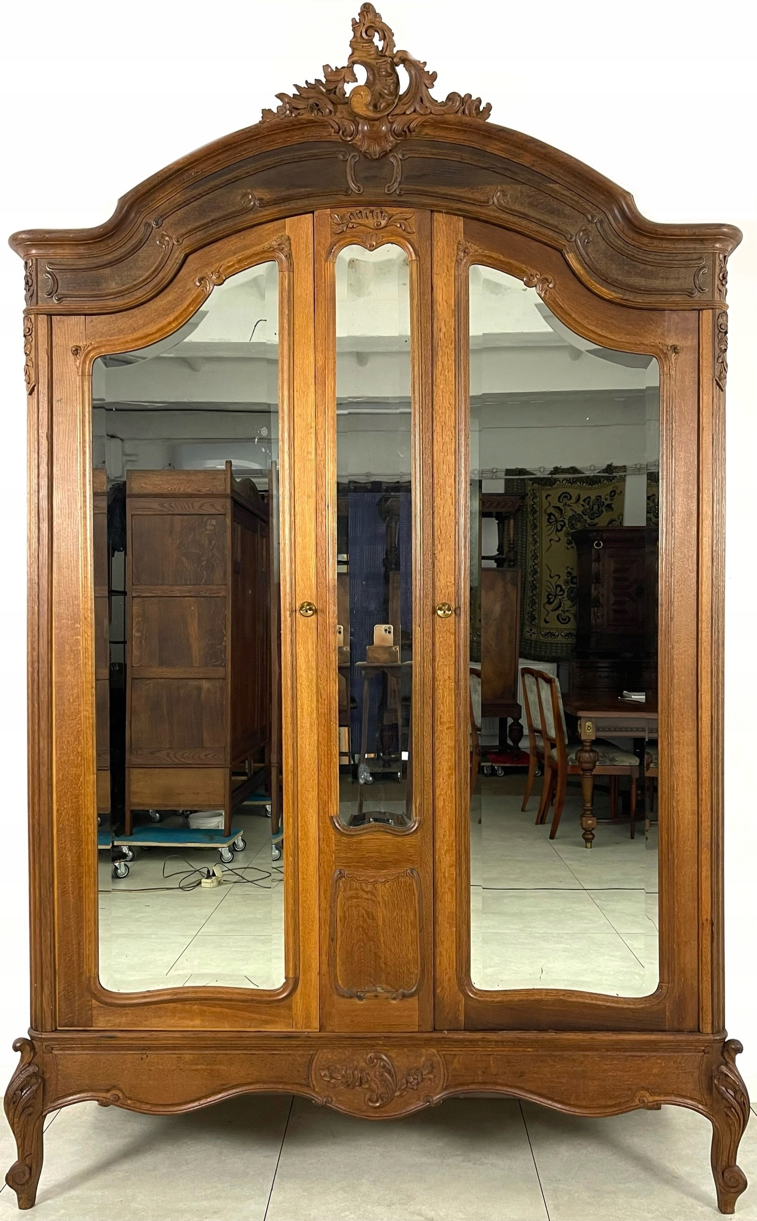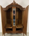 Mebel zdobiony rzeźbieniami, mosiężnymi okuciami oraz zwieńczonym charakterystycznym dla stylu ornamentem. Prezentuje się bardzo okazale, jest wyjątkowy i niepowtarzalny.