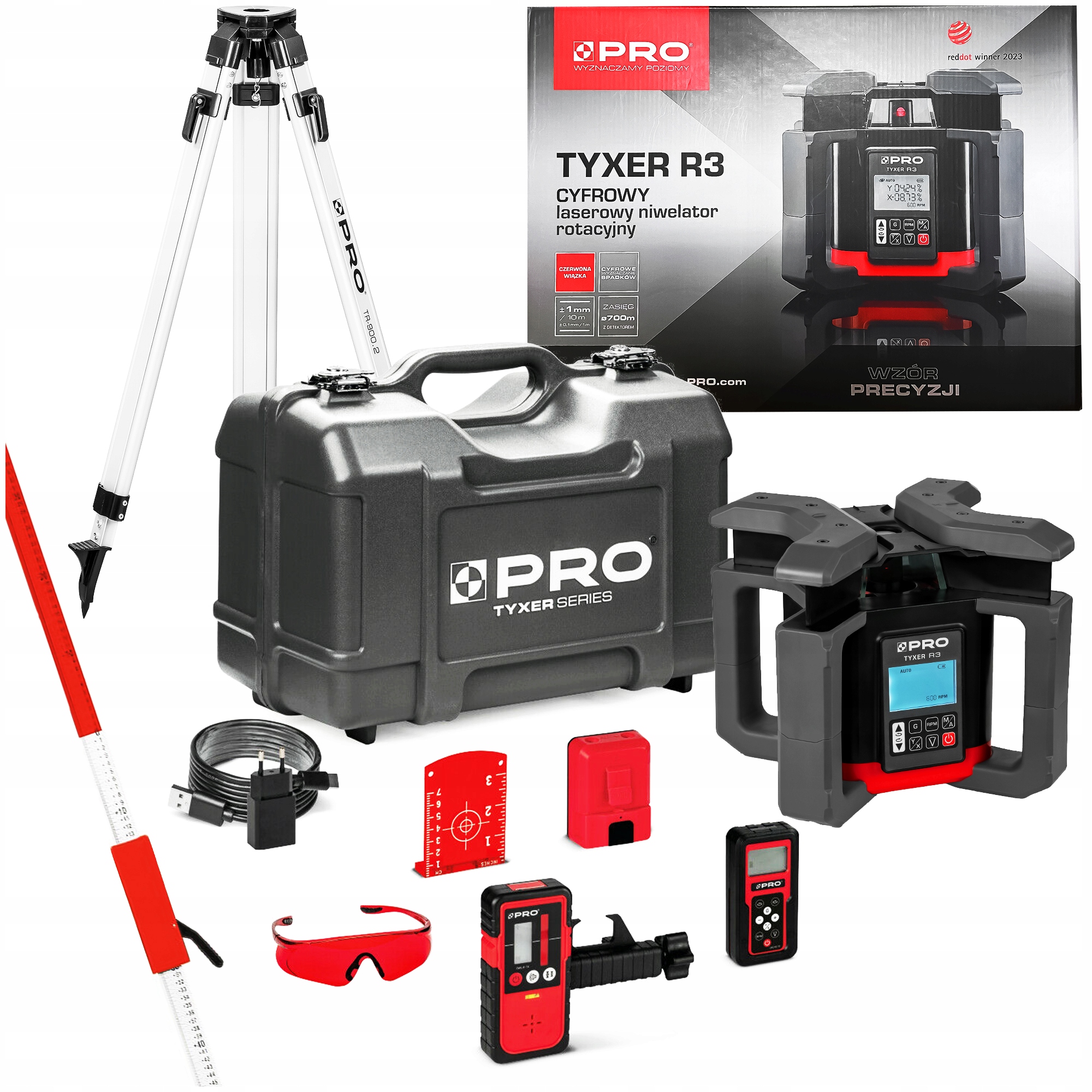 ZESTAW NIWELATOR LASEROWY PRO TYXER R3 DETKTOR ŁATA NIWELACYJNA STATYW