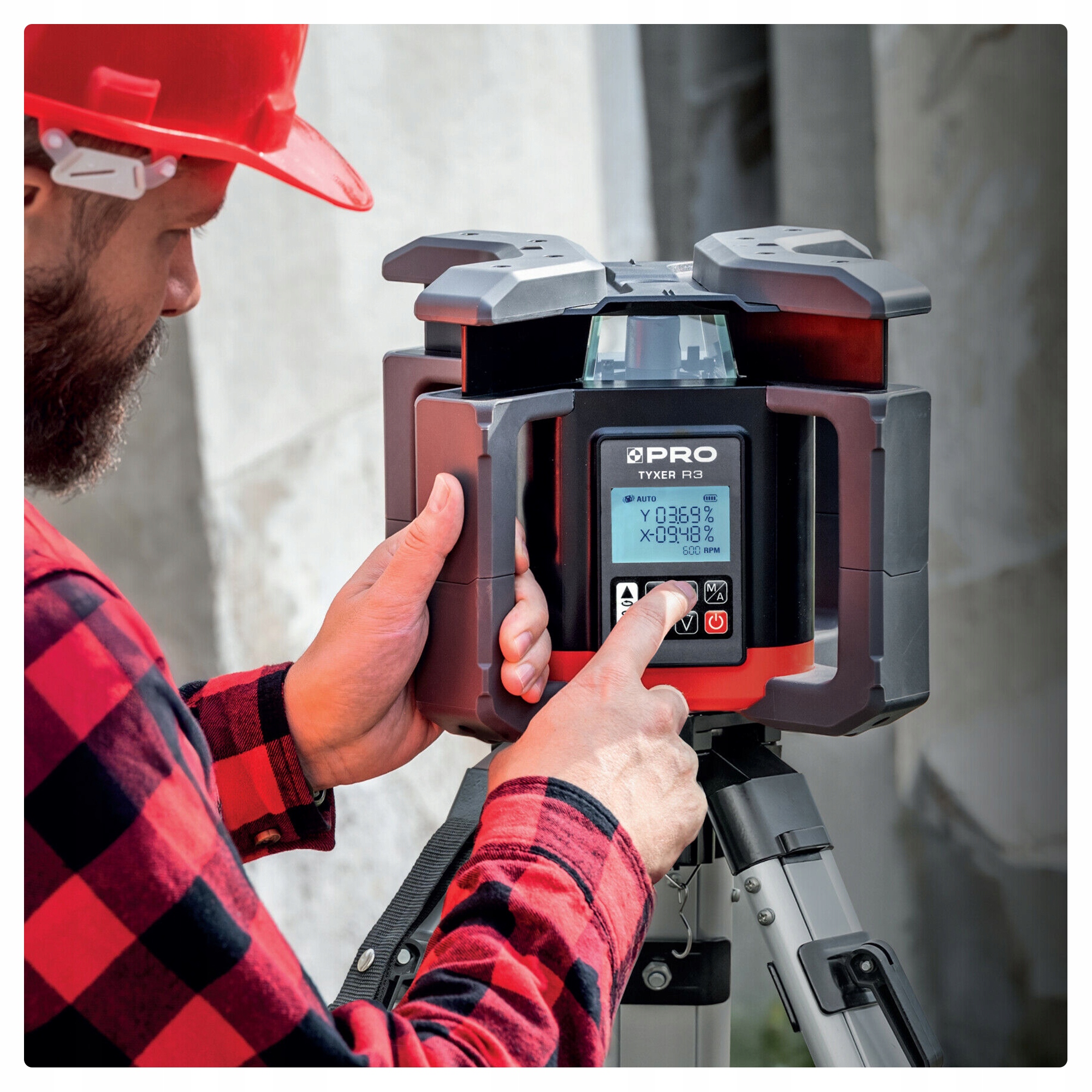 TYXER R3 posiada funkcję automatycznego sterowania silnikiem, która pozwala na ustalanie pionu jak i poziomu z możliwością manualnego ustawienia przechyłu niezależnie w dwóch osiach.
