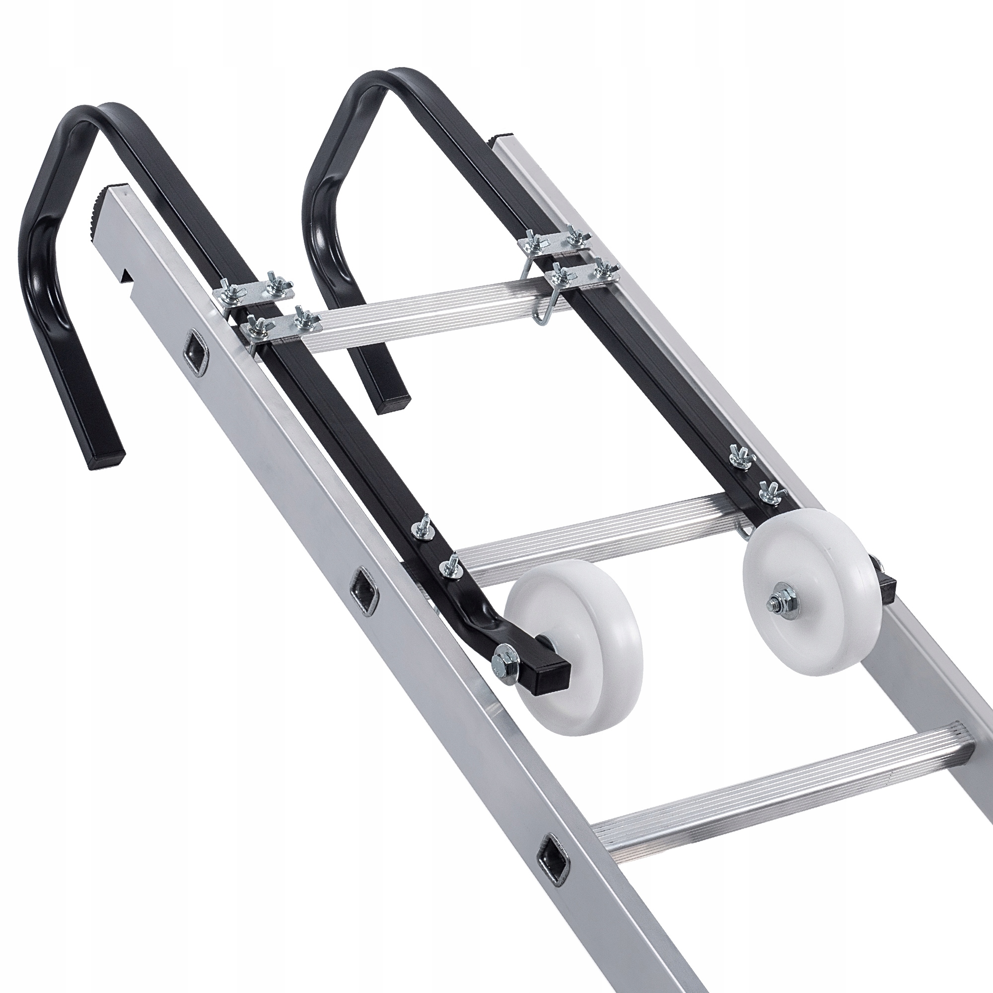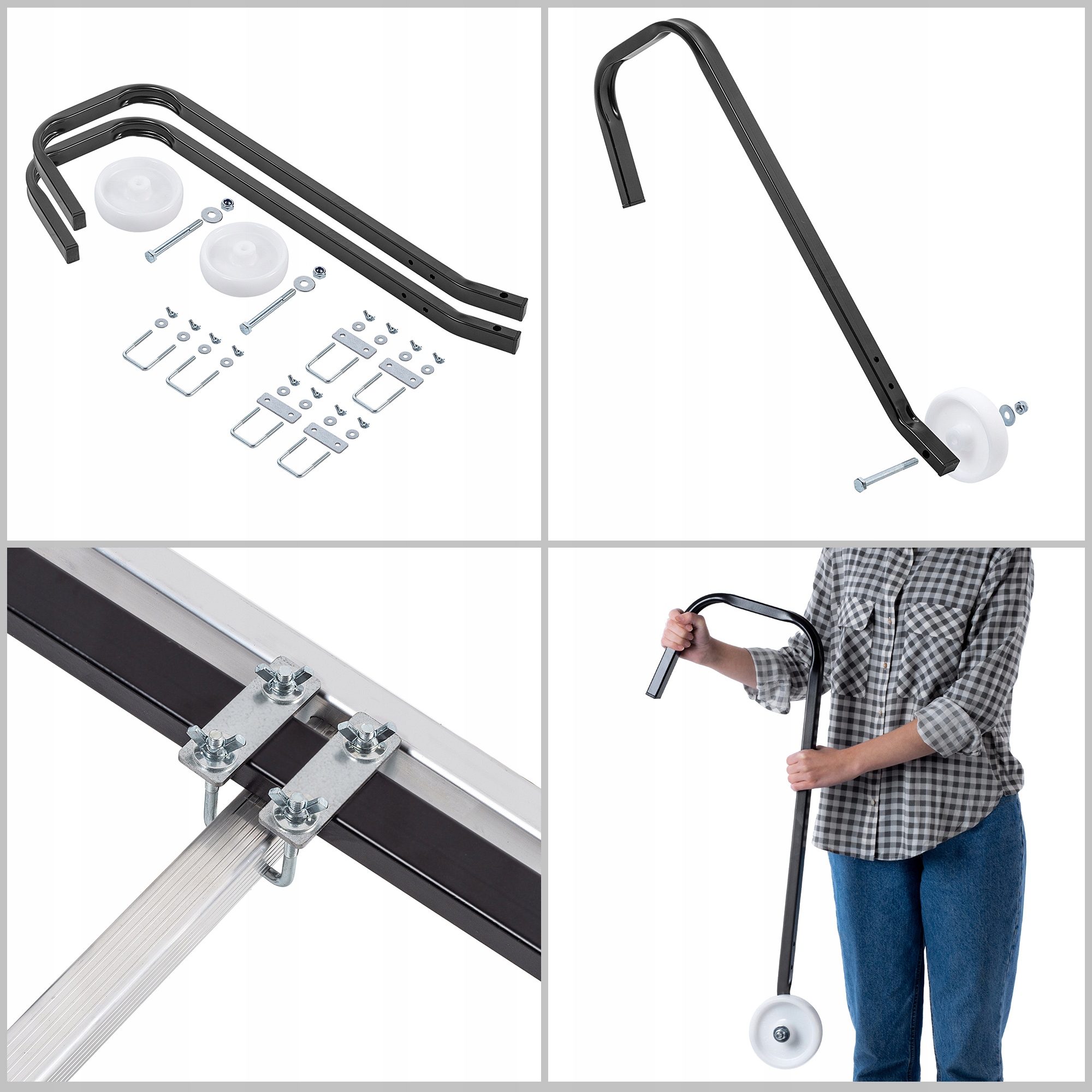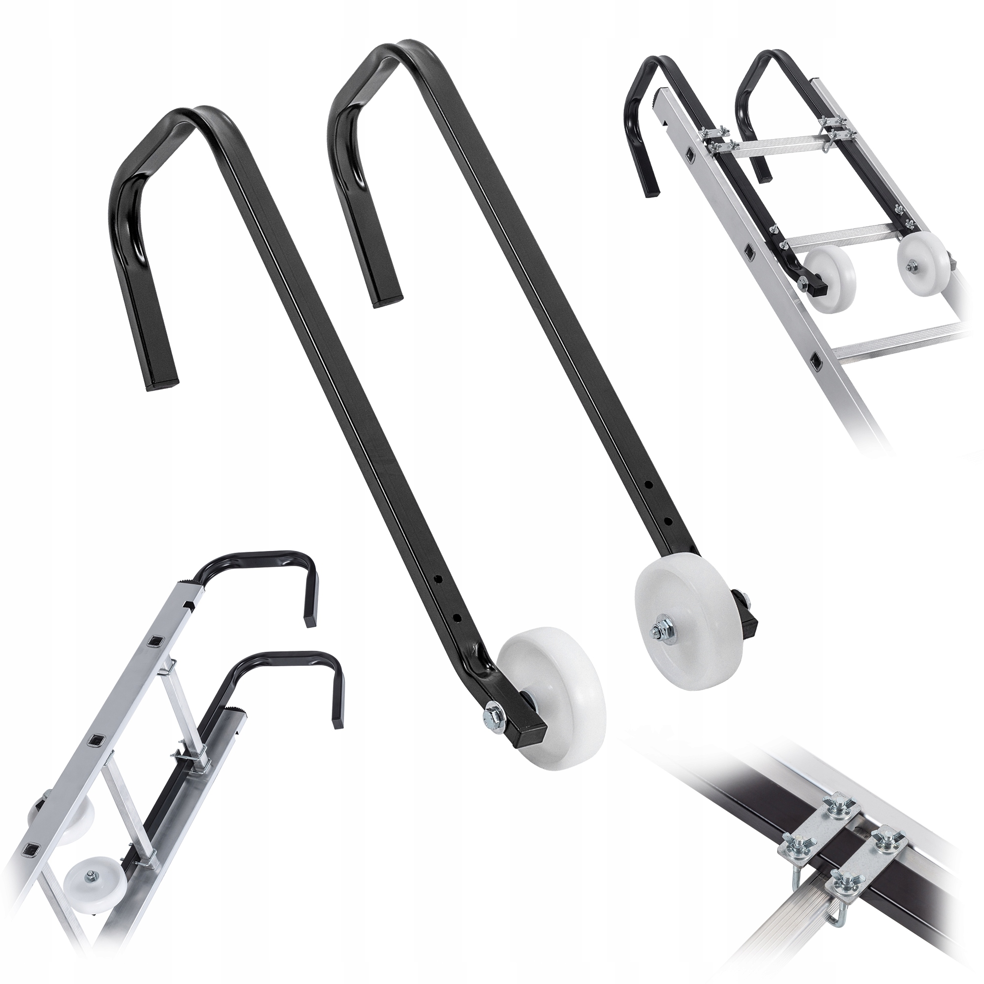 ✅ WIELOFUNKCYJNE PRZEZNACZENIE - Uchwyty z kółkami dla kalenicy dachu, pozwalają na mocną stabilizację i swobodne przemieszczanie drabiny podczas prac.