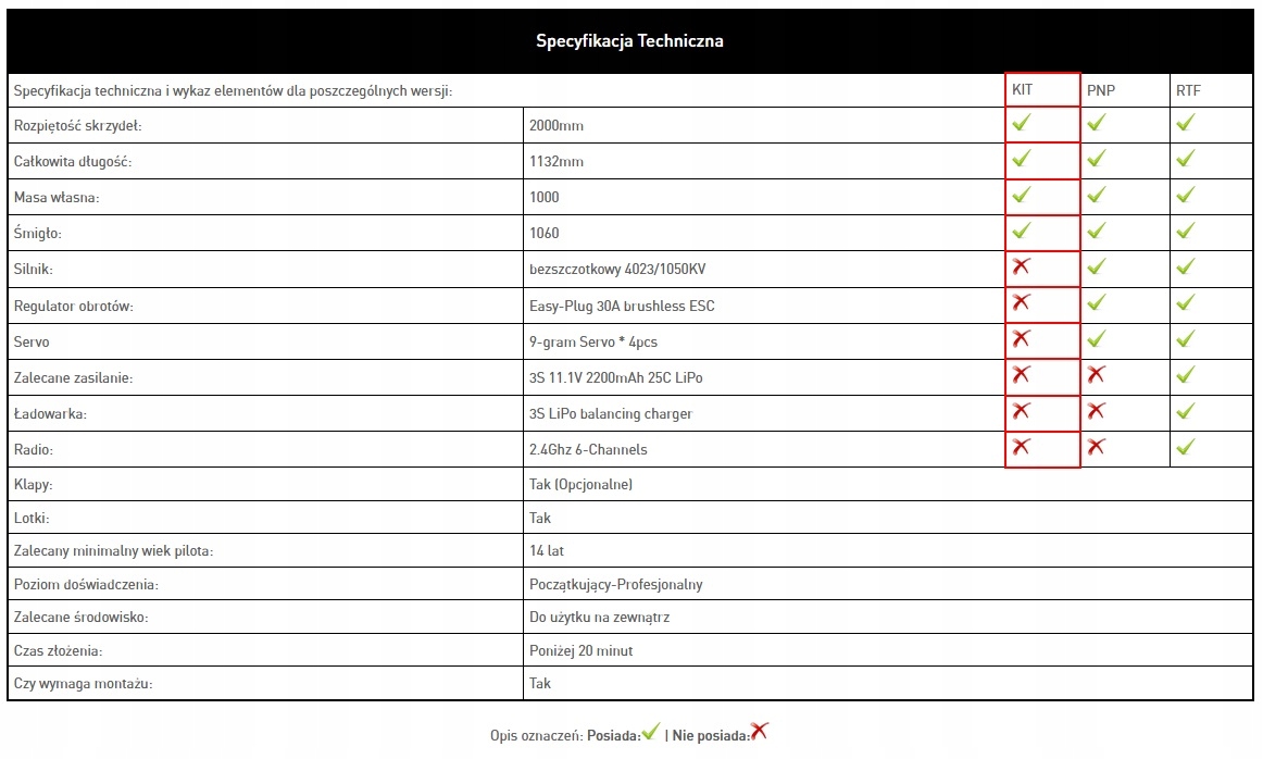 Szybowiec w wersji KIT, zestaw zawiera sam model. We własnym zakresie należy dokupić silnik, regulator, serwa, akumulator, ładowarkę, nadajnik i odbiornik.