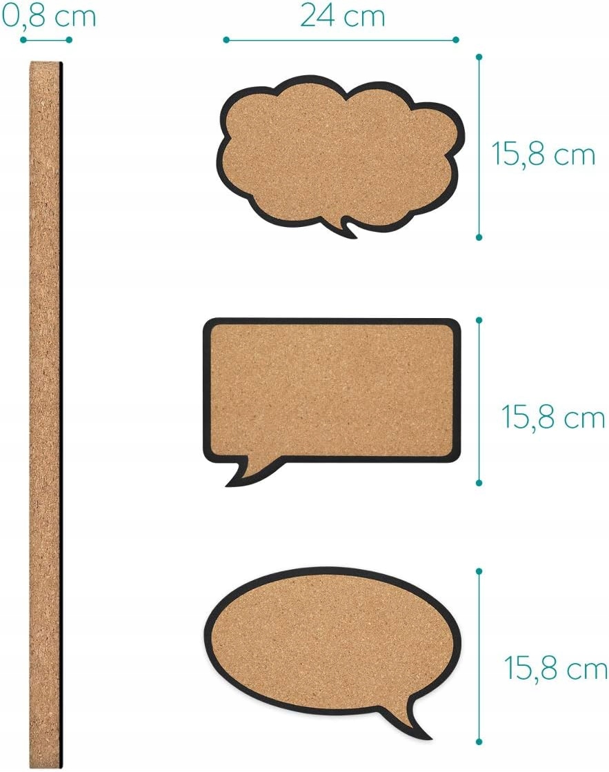 W zestawie znajdują się trzy tablice korkowe w różnych kształtach – mowy i myśli, co dodaje im wyjątkowego charakteru. Dzięki temu stanowią nie tylko praktyczne narzędzie, ale również ozdobę pomieszczenia.