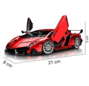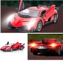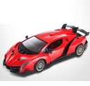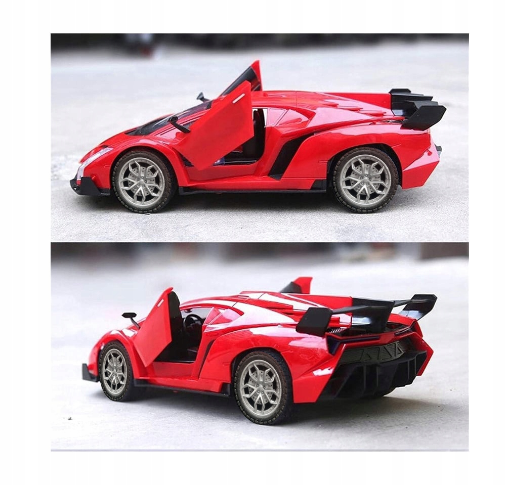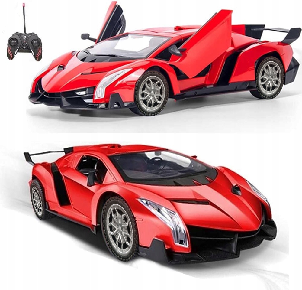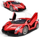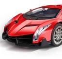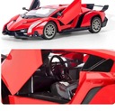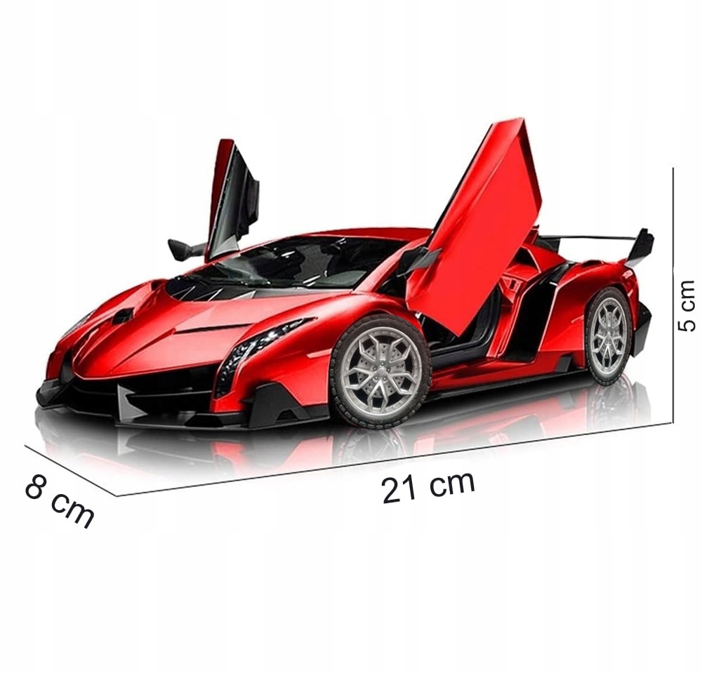 Lamborghini Veneno w wersji zabawki zdalnie sterowanej to miniatura prawdziwego modelu sportowego, zachowująca jego charakterystyczne cechy w mniejszej skali. Czerwony kolor nadwozia sprawia, że model jest jeszcze bardziej atrakcyjny. Zabawka posiada szczegółowo odwzorowane ostre linie karoserii, które przywodzą na myśl zaawansowane technologie i szybkość. Przód modelu zdobią realistyczne, kątowe reflektory oraz nisko osadzona, szeroka atrapa chłodnicy. Boczne powietrzniki i płynny profil nadają zabawce dynamizmu, podkreślając jej sportowy charakter. Tył zabawki wyposażony jest w imponujący spojler i stylizowane, trójkątne światła, co dodaje jej wyrazistości. Koła są proporcjonalnie duże, z wyraźnie widocznym, wieloramionowym designem, co uzupełnia wizerunek Lamborghini jako samochodu gotowego do wyścigów.