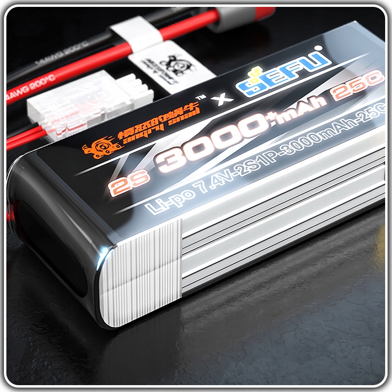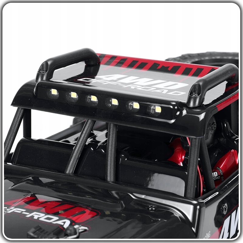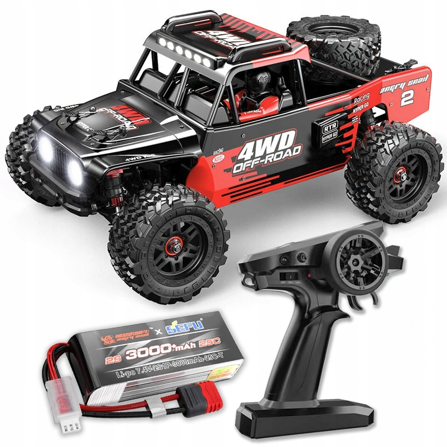⭐ Pilot zdalnego sterowania działa na częstotliwości 2,4 GHz i jest zasilany dwiema bateriami 1,5 AA. Źródłem zasilania samochodu jest bateria 7,4 V 3000 mAh 2S 25C, zapewniająca stałe i niezawodne zasilanie.