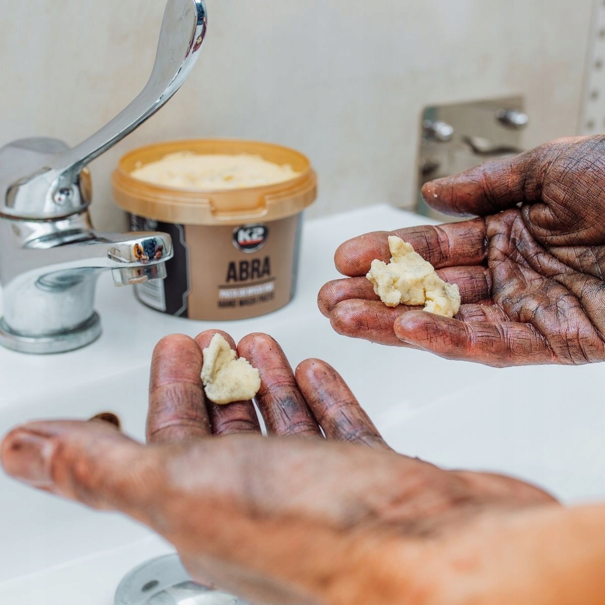 Łatwa w użyciu. Pasta K2 ABRA jest lżejsza od wody, dzięki czemu łatwo się spłukuje, co czyni mycie rąk szybszym i generuje dużą oszczędność czasu.