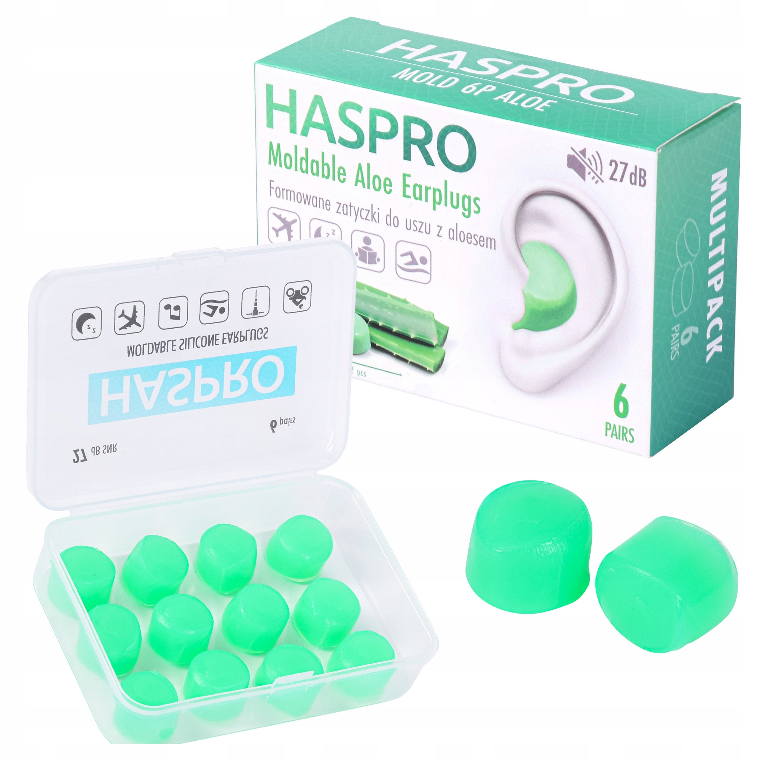 ▶ Haspro MOLD 6P ALOE to silikonowe, łatwo formowane zatyczki do uszu wielokrotnego użytku, wzbogacone o aloes.