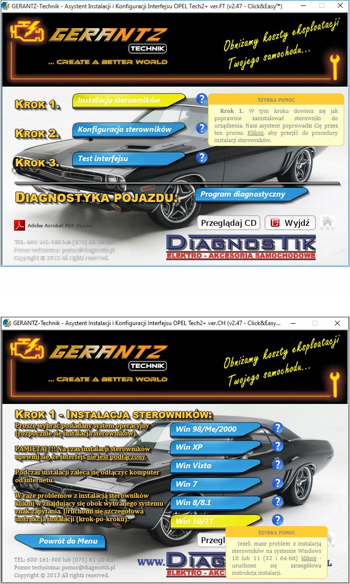 (инструкции, расположение диагностических разъемов в отдельных автомобилях, диагностические советы, в в том числе: стирание инспекций обслуживания и масла, коды неисправностей.) и наш авторский программа: помощник по установке и настройке устройства версии 2.47, с технологией Click