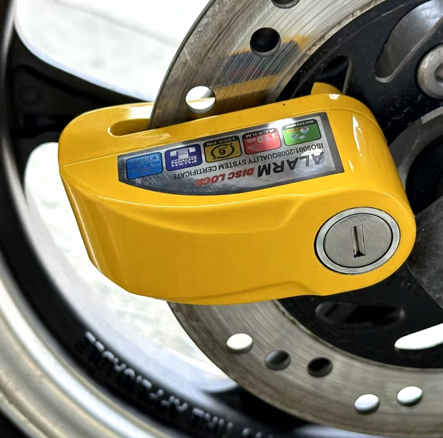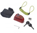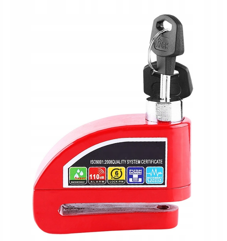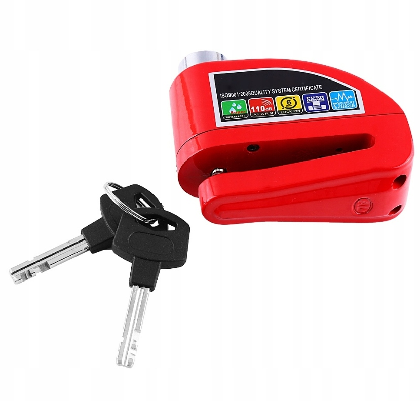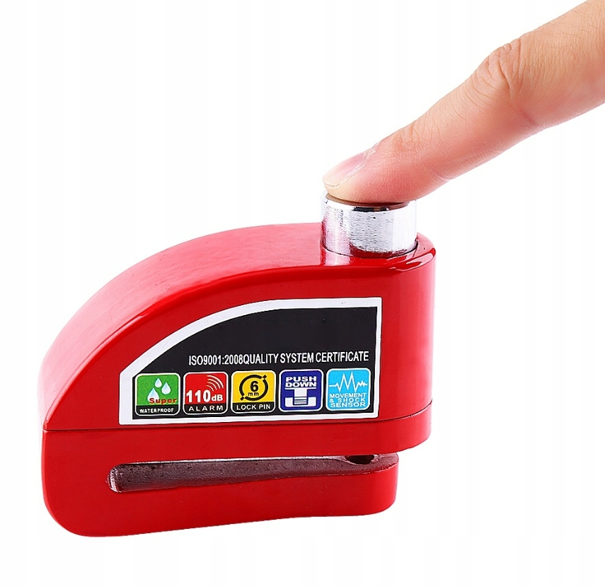 ➡️ Aby uzbroić alarm, załóż blokadę na tarcze hamulcową i wciśnij sworzeń tak aby przeszedł przez otwór wentylacyjny tarczy. Usłyszysz dźwięk oznaczający włączenie alarmu. Po 3 sekundach urządzenie wyda kolejny dźwięk informujący o prawidłowym uzbrojeniu. Po wykryciu ruchu alarm wyemituje krótki dźwięk ostrzegawczy. Jeżeli ruch pojawi się ponownie, uruchomi się alarm o głośności 110dB trwający 10s.