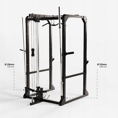Wyposażenie stojaka: - Wyciąg wbudowany na stałe (maks. 60 kg, pozycja dolna lub górna) - 2 uchwyty do wyciągu (1 trójkąt i 1 drążek) - 2 wsporniki do przechowywania obciążenia (maks. 100 kg każdy) i 2 schowki na gryf, aby przestrzeń treningową łatwo było utrzymać w porządku - Specjalny adapter pozwalający dostosować te wsporniki / schowki do średnicy sprzętu: 28 mm lub 50 mm - Drążek do podciągania, który można zainstalować na dwa sposoby, co pozwala stosować szeroki chwyt