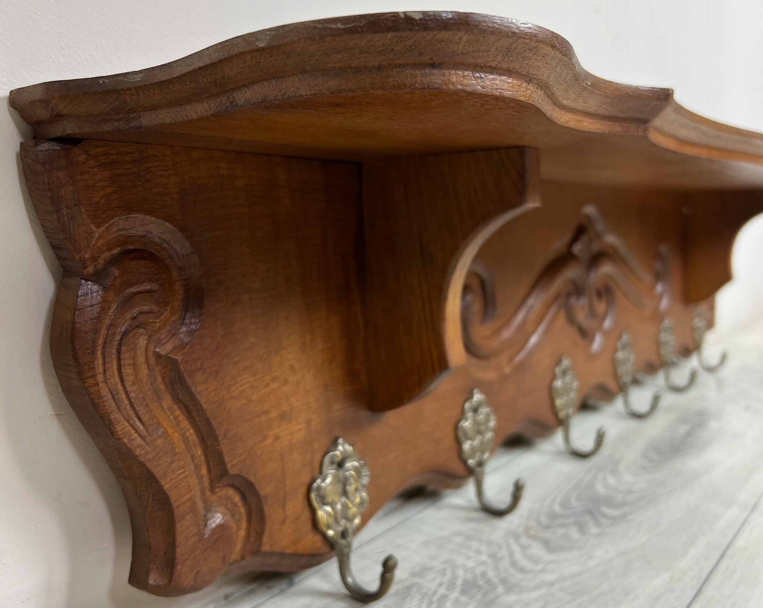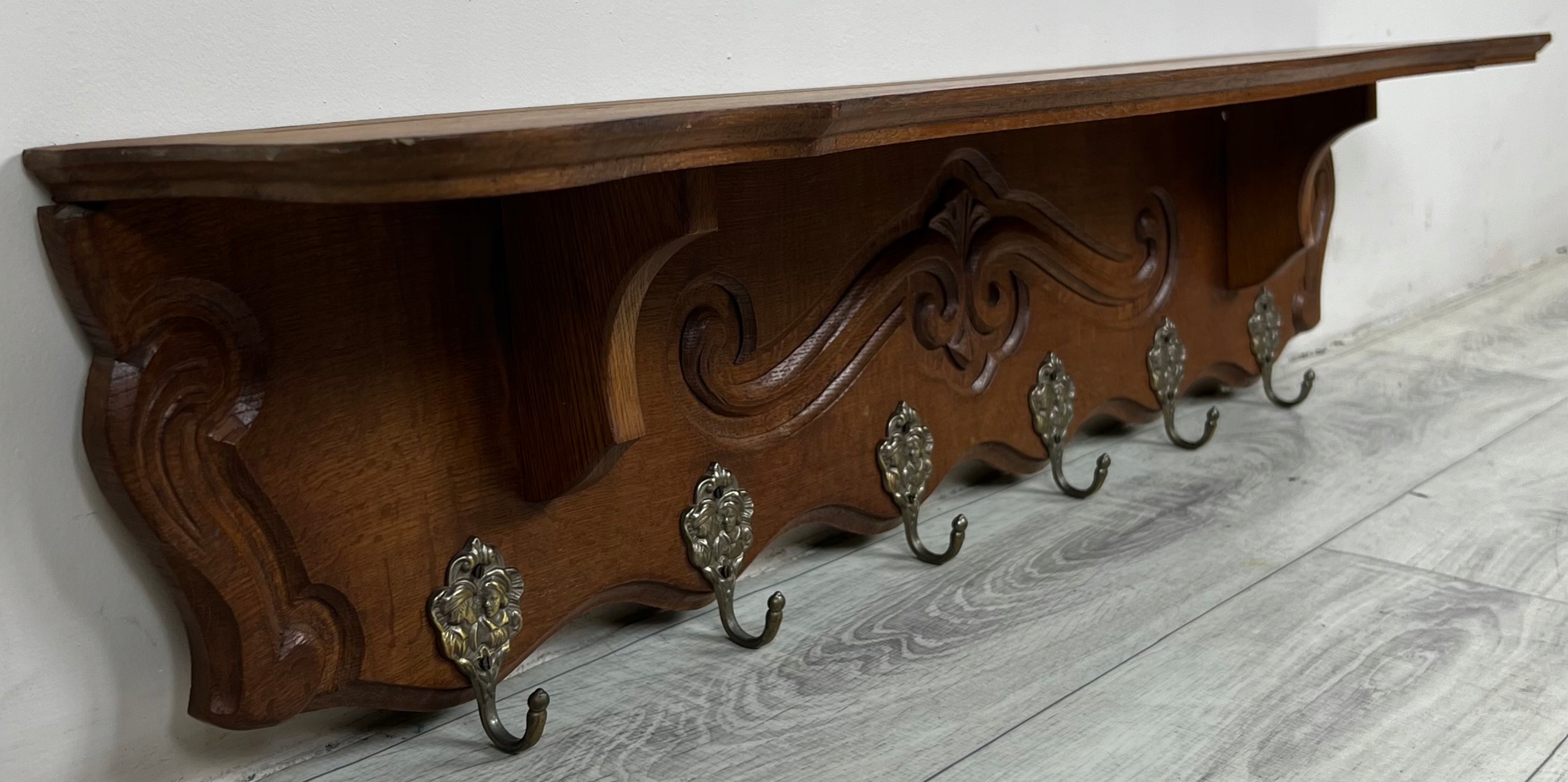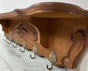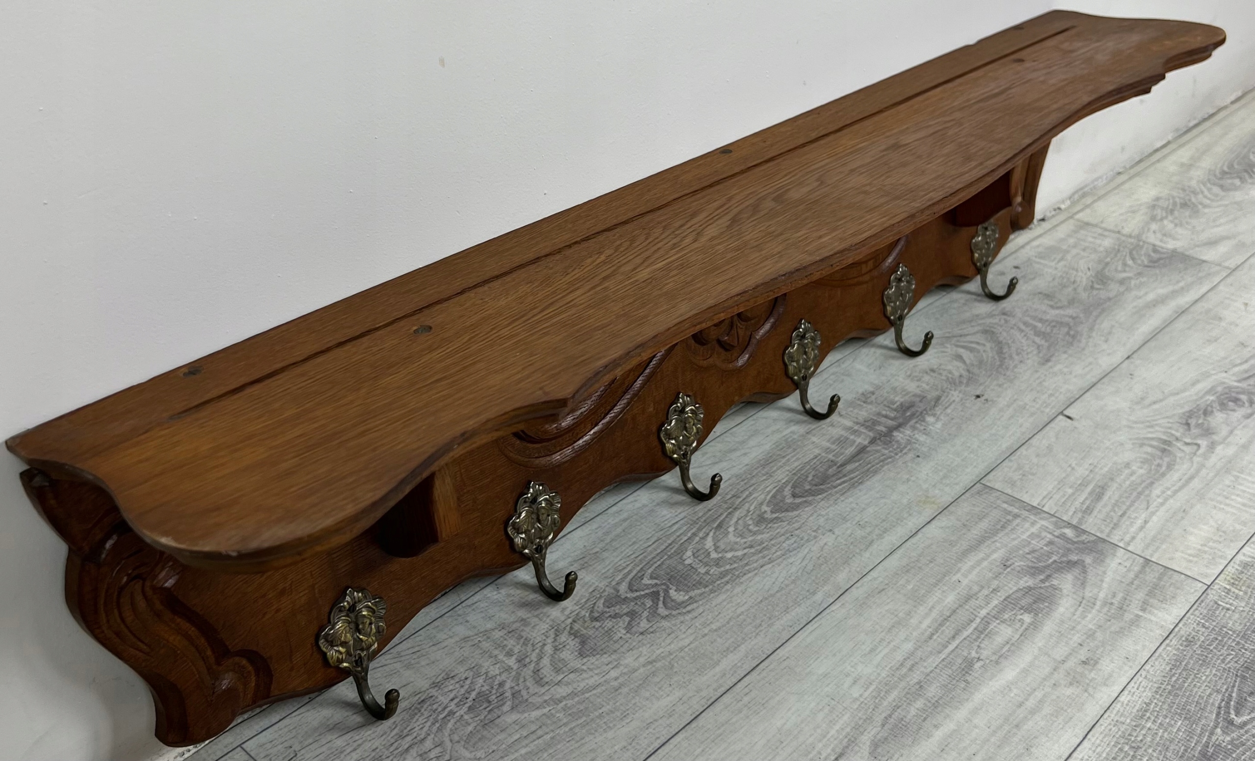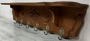 Posiada 6 mosiężnych haczyków. Na górze półka.