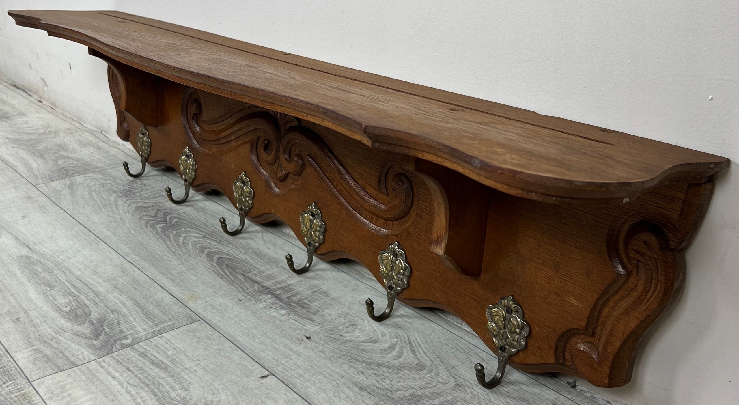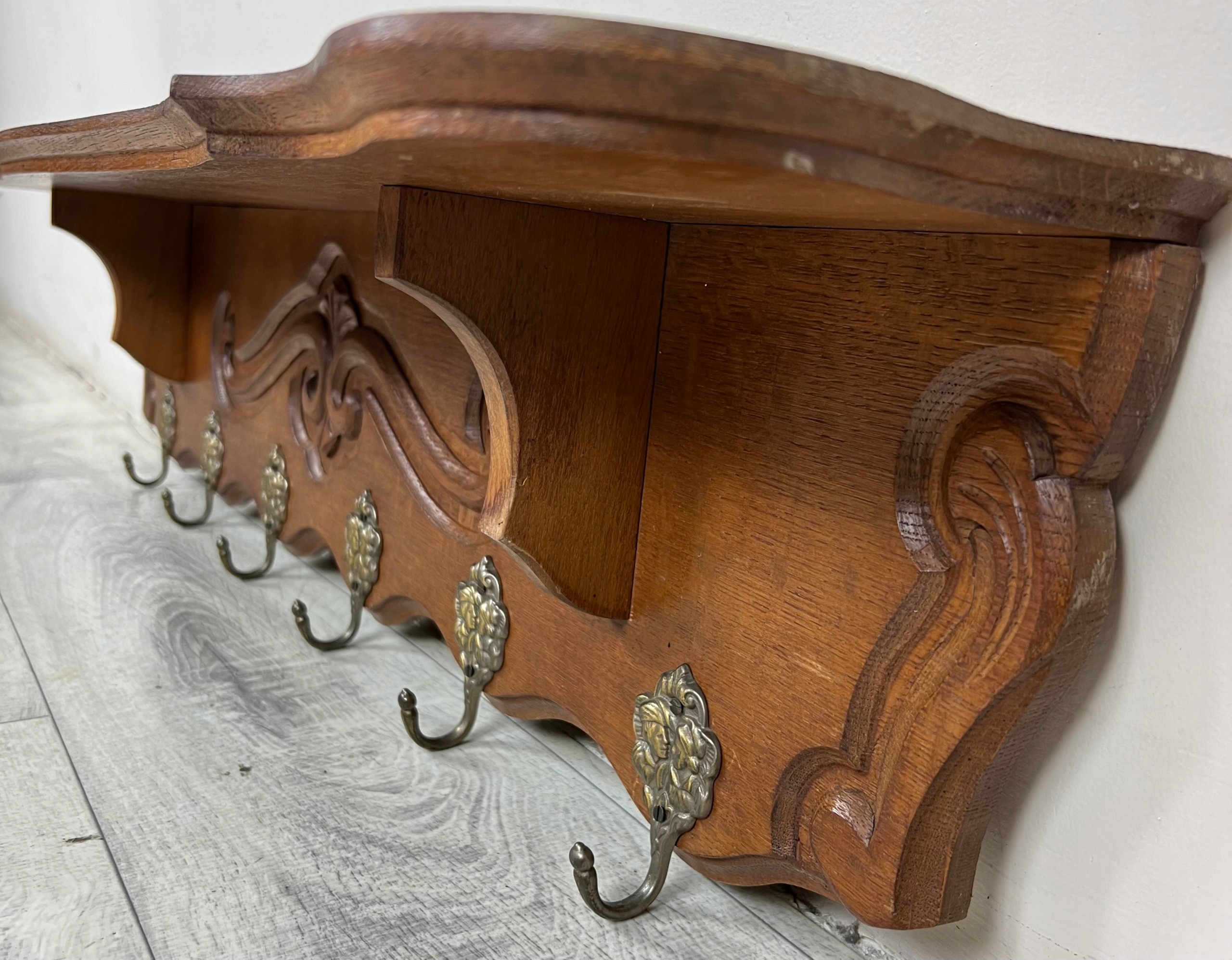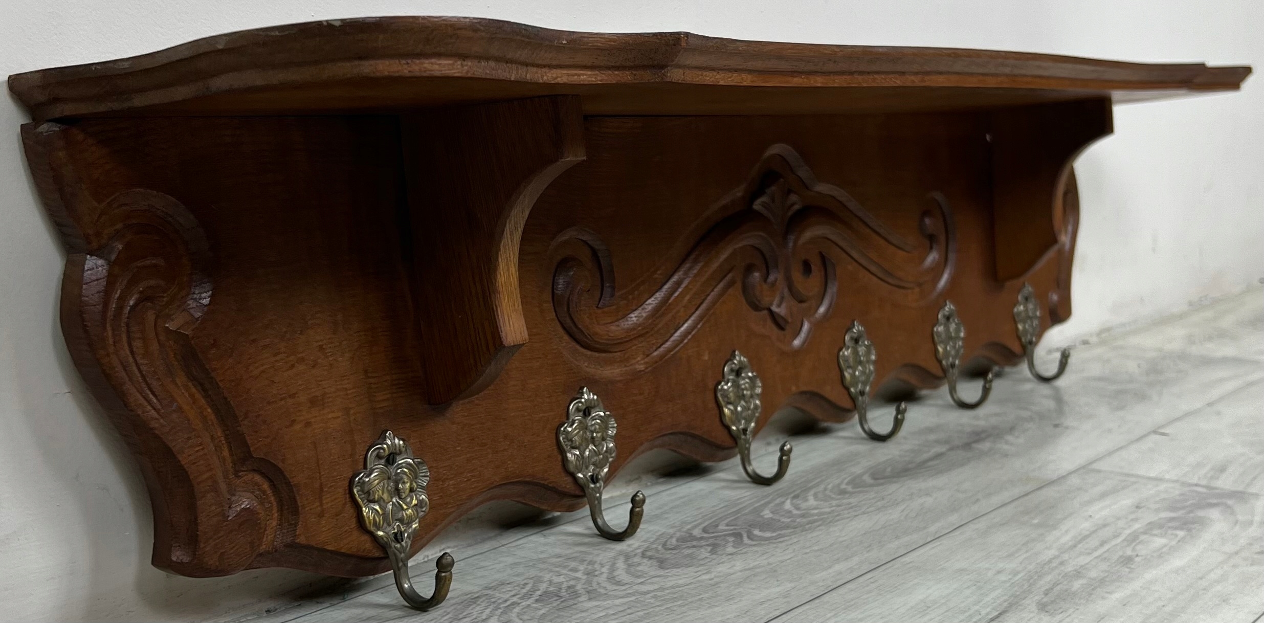 Posiada 6 mosiężnych haczyków. Na górze półka.