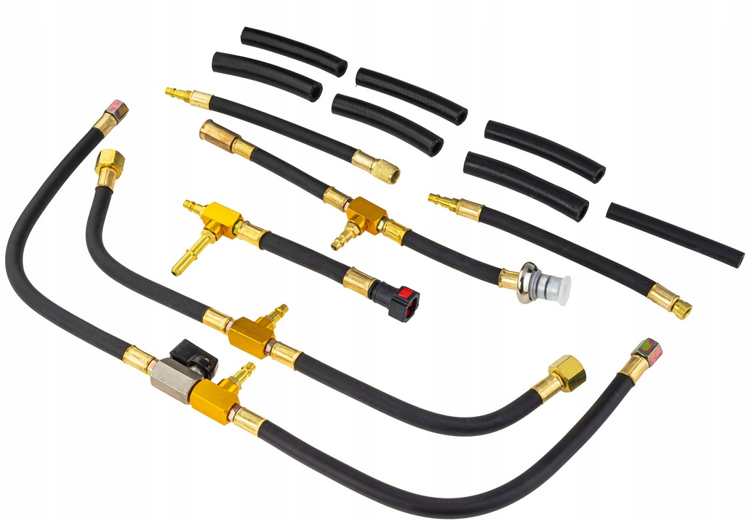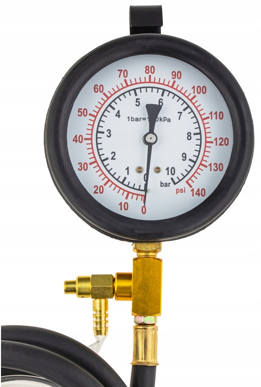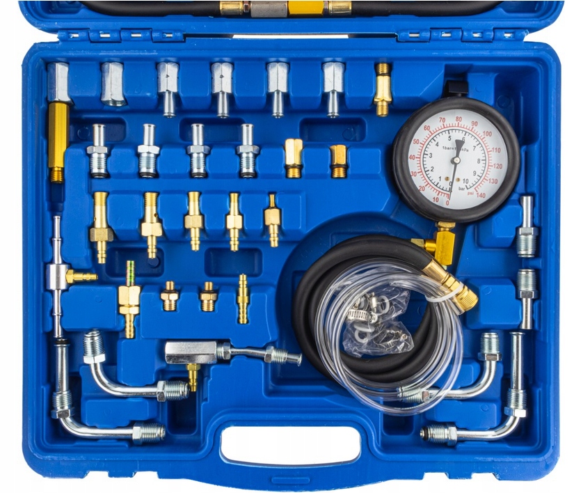 Zestaw do pomiaru ciśnienia paliwa w układach z wtryskiem benzyny może być używany do wszystkich typów układów wtryskowych , w których przewidziano pomiar ciśnienia benzyny. Składa się z dwóch manometrów o zakresach MPa ,BAR-PSI- odpornego na działanie benzyny elastycznego przewodu wraz z zaworem odpowietrzającym, trójnika z zaworem kulowym, przewodów ciśnieniowych oraz kilkunastu różnorodnych redukcji.