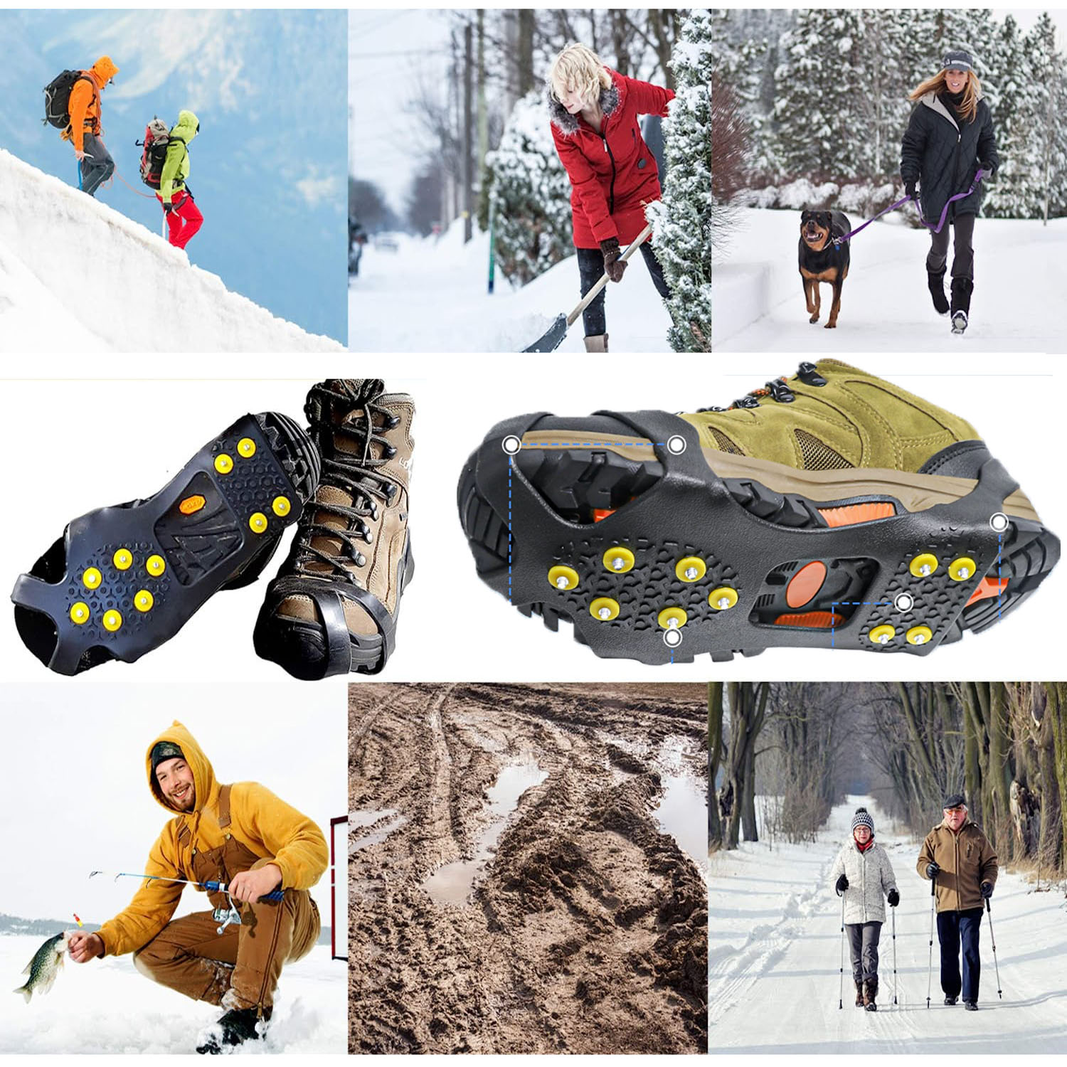 Wyposażone w 10 stalowych zębów (na każdy but), zapewniają doskonałą przyczepność i stabilność – idealne do chodzenia po śniegu, lodzie, błocie czy mokrej trawie.