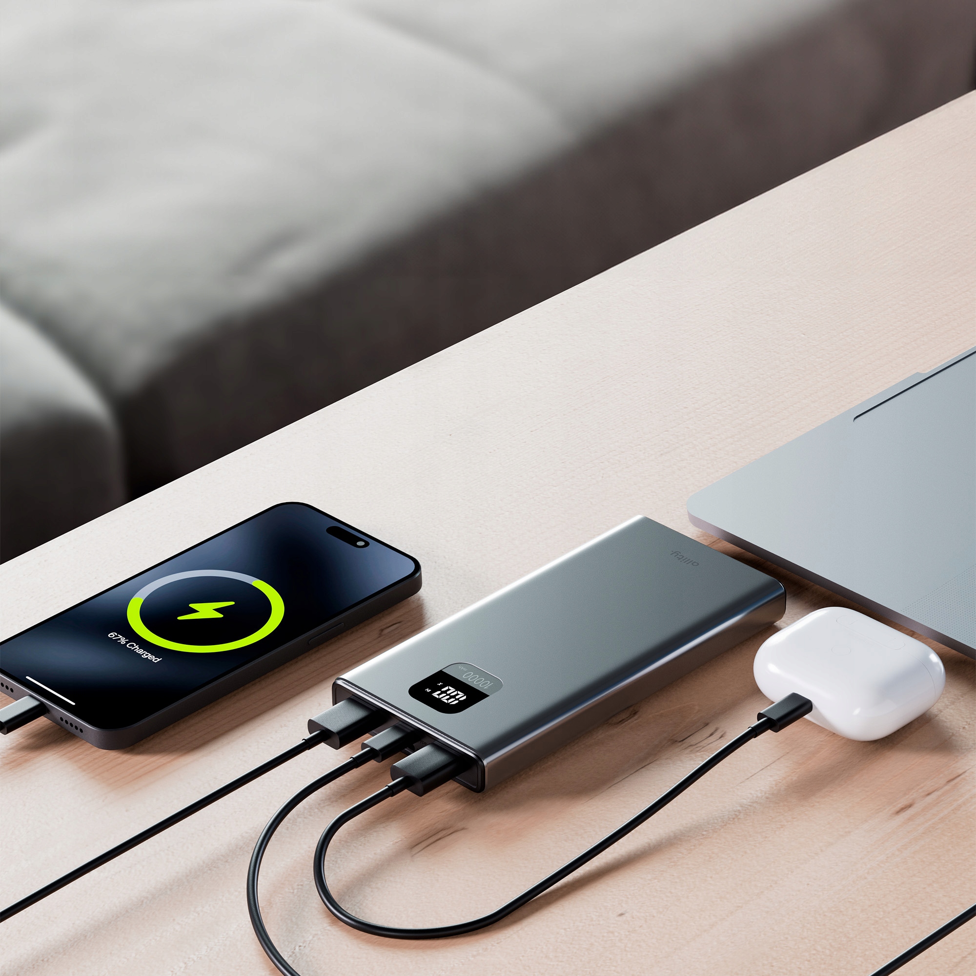 Podręczny powerbank to idealne rozwiązanie zawsze wtedy gdy nie masz dostępu do gniazdka, a Twoje akcesoria mobilne wymagają ładowania. Dzięki dużej pojemności 10000 mAh, zawsze masz pod ręką zapas energii, zarówno na awaryjne podładowanie baterii jak i jej całkowite uzupełnienie. Powerbank osiąga szybkie ładowanie 20W z portu USB-C i 22,5W z portu USB-A. To nasza odpowiedź na wymagania najnowszych sprzętów takich jak tablety czy smartfony, ale też na Twoje potrzeby.