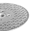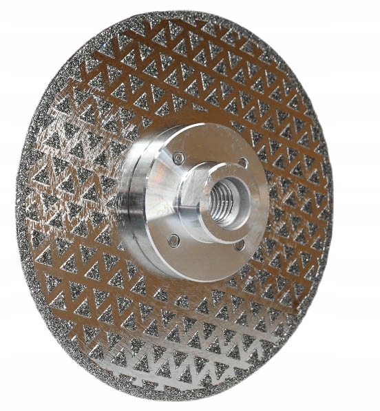 Gładka obróbka zgrubna. Dla grubości <25 mm. Obrzeże zapewnia szybkie usuwanie materiału i dobrą jakość wykończenia. Wyposażona we flanszę mocowaną za pomocą złączki M14. Dysk pokryty na całej powierzchni warstwą diamentu nakładanego elektrolitycznie po obu stronach, co podwaja żywotność dysku. Do stosowania na szlifierkach - na sucho. Skład zestawu Tarcza diamentowa 2w1 do cięcia, fazowania, szlifowania kamienia, gresu, ceramiki Dane techniczne Model: TA1127 Średnica zewnętrzna: 125mm Średnica otworu: 22mm/gwint M14 Maksymalne rpm: 12200 Praca: na sucho Grubość tarczy: 2,6mm