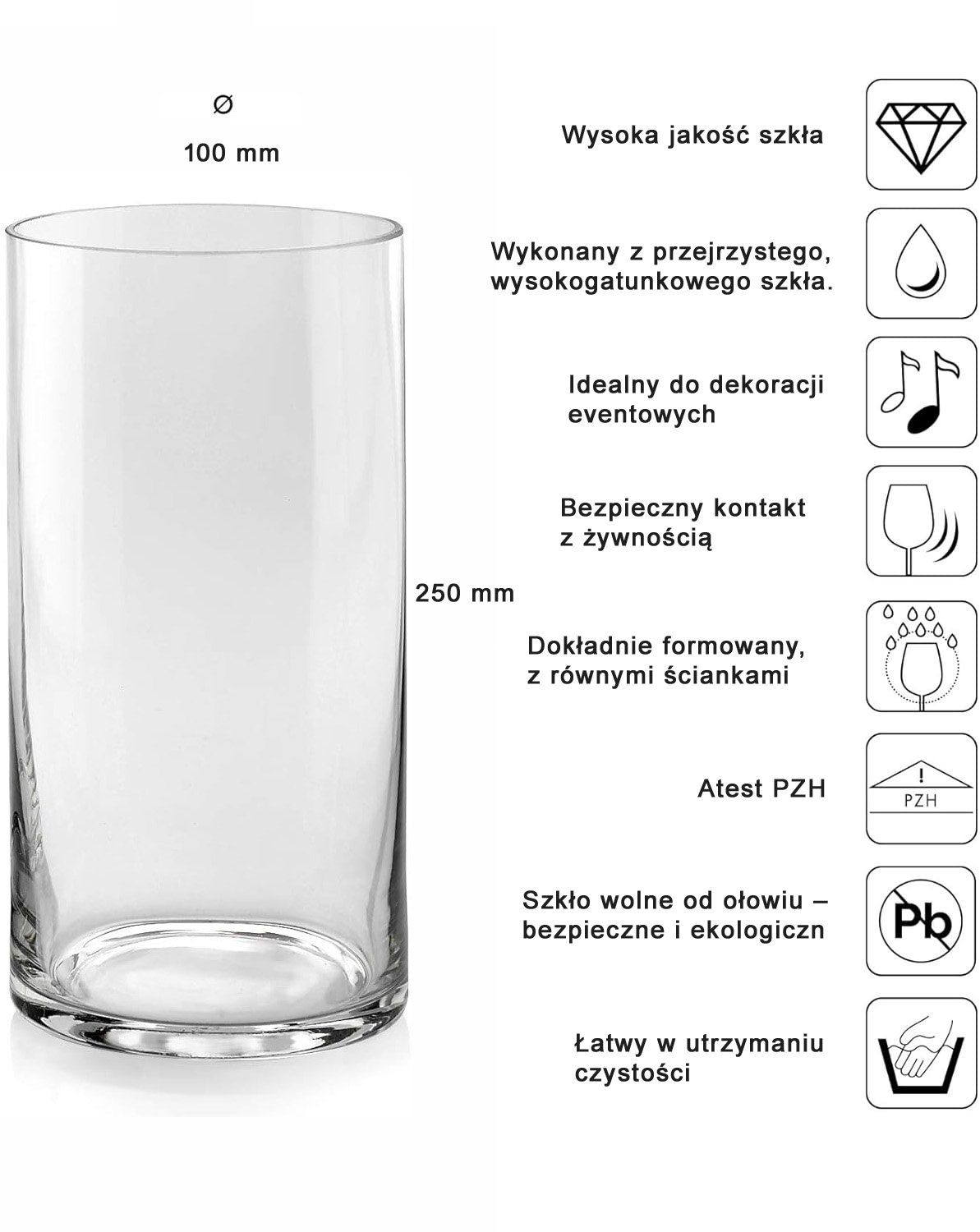 Wazon szklany cylinder o wysokości 25 cm i średnicy 10 cm to propozycja dla osób ceniących nowoczesny styl, prostotę i efektowny design. Smukły, wysoki i minimalistyczny – świetnie prezentuje się jako samodzielna dekoracja, ale również jako centralny element większych kompozycji florystycznych. Bez zbędnych zdobień – tu liczy się forma i to, co umieścisz w środku!