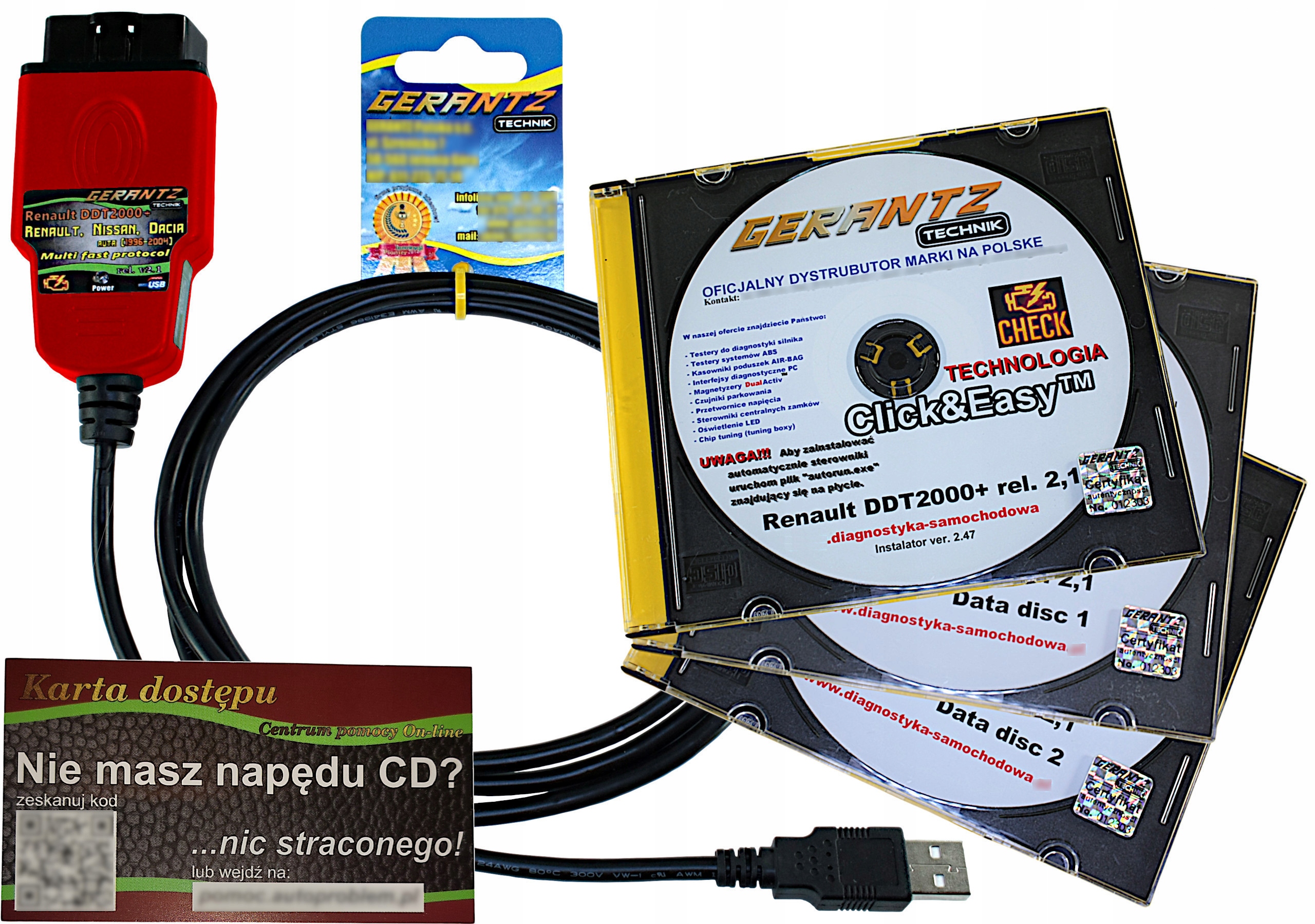 Interfejs diagnostyczny Renault DDT2000+ rel. 2,1 z wtykiem OBD2 do samochodów marki Renault oraz Nissan i Dacia. Interfejs zastępuje urządzenie serwisowe RENAULT CLIP stosowane w autoryzowanych stacjach diagnostycznych samochodów tego koncernu, czyniąc z komputera PC profesjonalne narzędzie diagnostyczne.