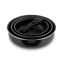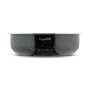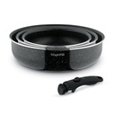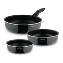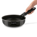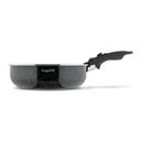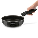 Komplet głębokich patelni non-stick z powłoką typu stone Konighoffer Spinel Black wykonany jest z aluminium. Dzięki temu jest energooszczędny i poręczny. Podwyższoną trwałość zapewnia mu powłoka redukująca przywieranie jedzenia MARBLE PLUS. Jej wysoka jakość, twardość oraz struktura zostały opracowane z myślą o wieloletnim smażeniu. Energooszczędność daje specjalna budowa dna. To dzięki niemu możesz używać patelni Spinel na każdej kuchence. Powłoka nieprzywierająca umożliwi ci dodatkowo smażenie na niewielkiej ilości tłuszczu oraz bezproblemową pielęgnację. Zniesie przy tym też do 10 000 cykli ścierania (5 razy więcej niż zwykłe naczynia non-stick typu marmur dostępne na rynku). Przenoszenie i użytkowanie zestawu zapewnia rączka soft touch, która się nie nagrzewa i pewnie leży w dłoni. Jest ona uniwersalna i odpinana, a więc pasuje do każdej średnicy patelni z powłoką marmurową typu stone i wysokim rantem Spinel. Z jej pomocą o wiele łatwiej zmieścisz naczynia w kuchennej szafce lub szufladzie. Z tym kompletem bez problemu stworzysz też swój własny zestaw naczyń kuchennych do domowego użytku i dla całej rodziny. To jedna z najlepszych opcji w tej kategorii!