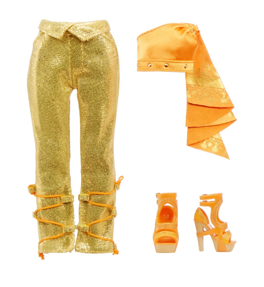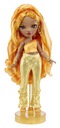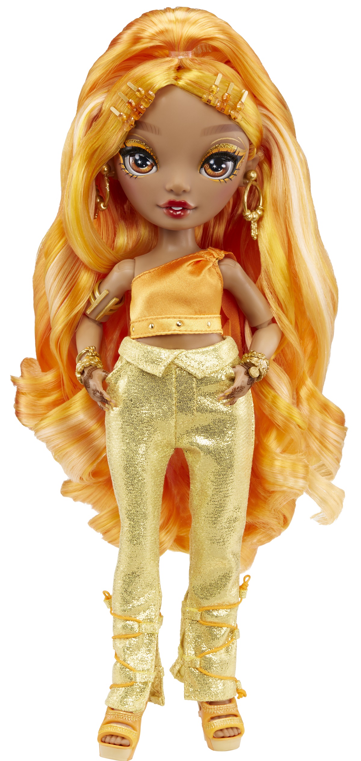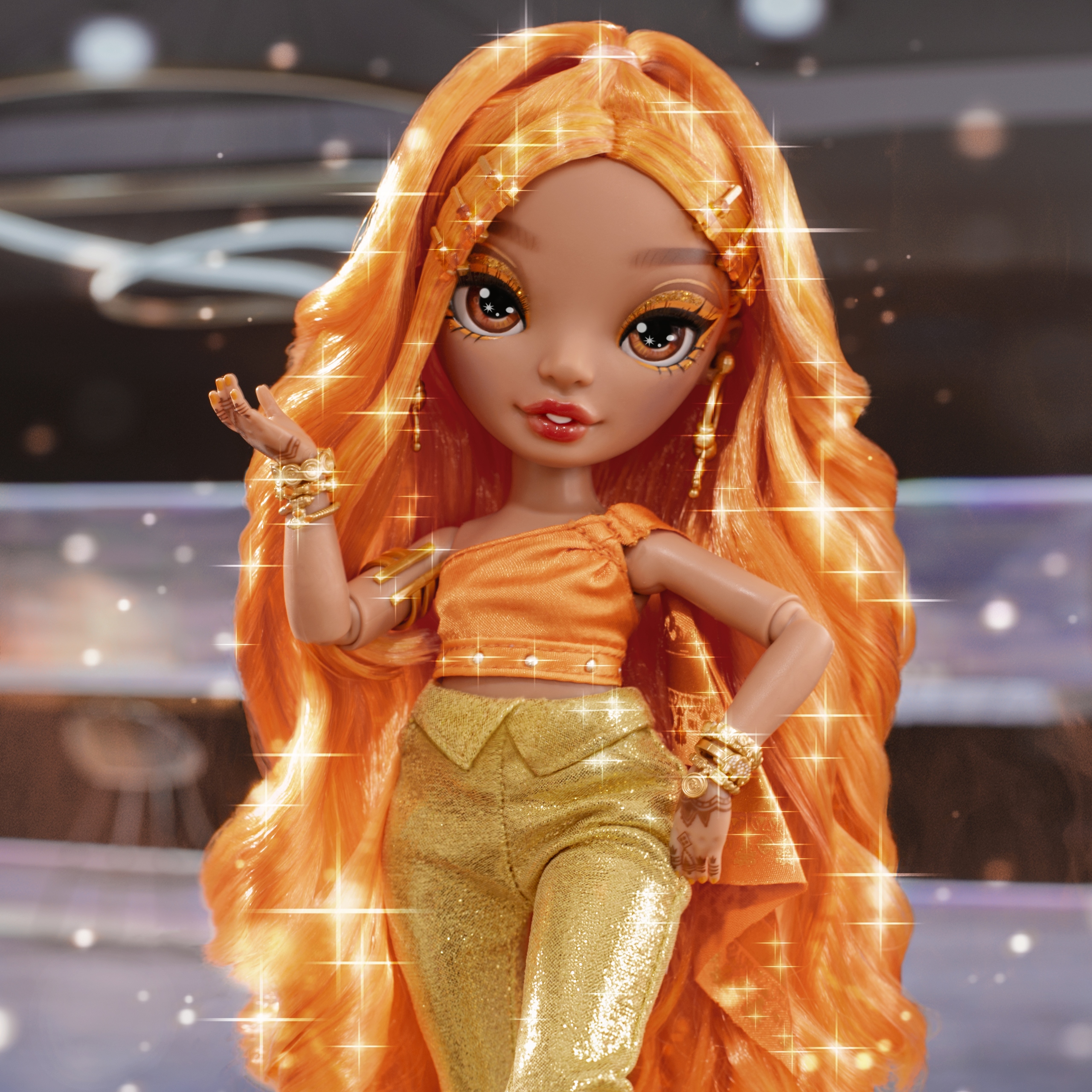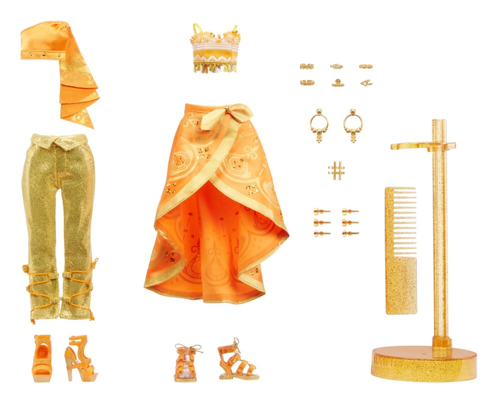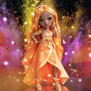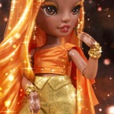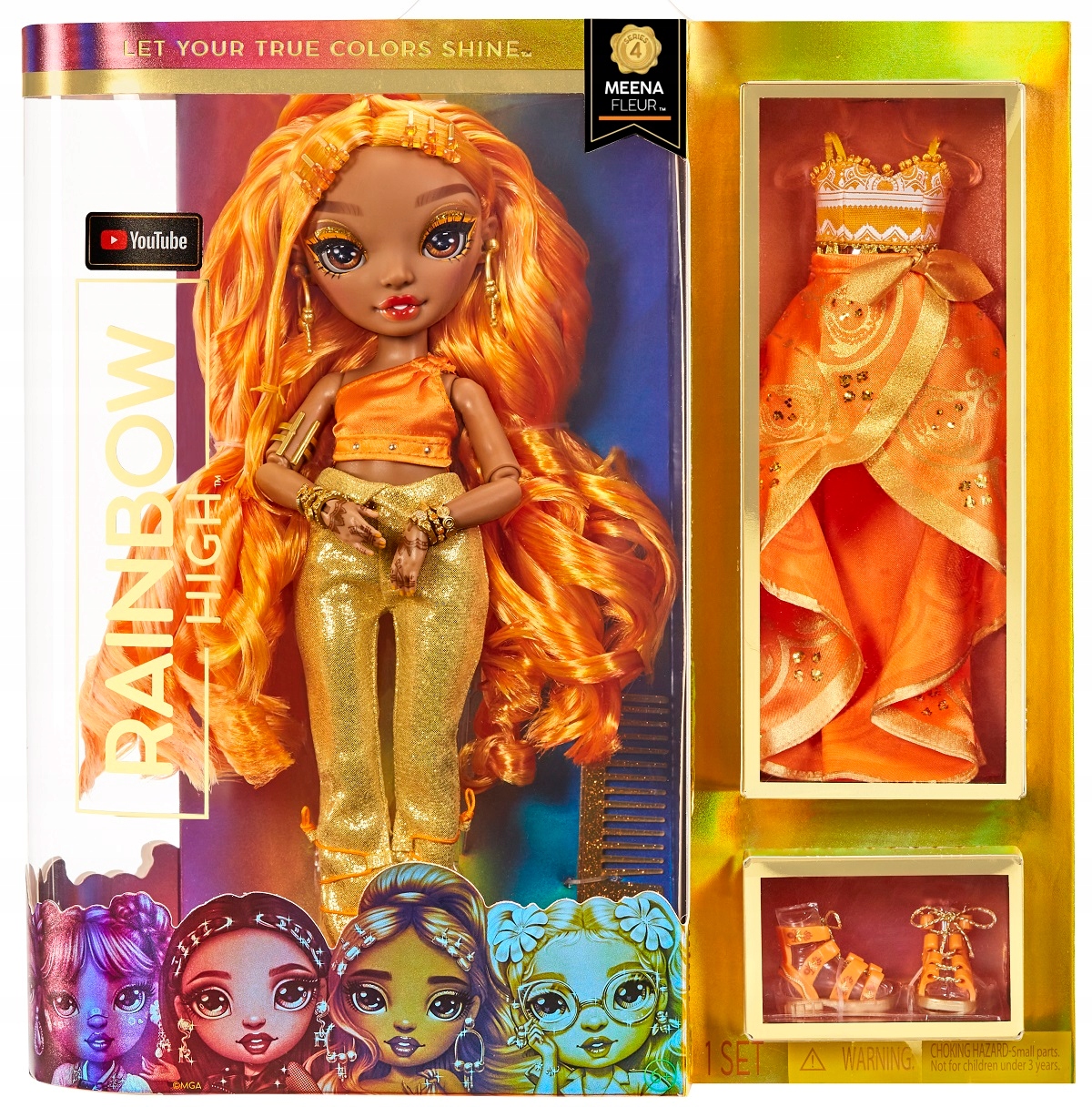 Śliczna Meena Fleur to prawdziwa ikona stylu, czerpiąca z kultury hinduskiej pomysły na ubiór oraz makijaż. Uwielbia projektowanie biżuterii , którą też lubi prezentować przyjaciołom. W pomarańczowym komplecie oszałamia całe liceum Rainbow High. Każdy szczegół jej outfitu jest dopracowany i dopasowany do całości. Lalka ma piękne rysy twarzy, zachwycające oczy z długimi rzęsami i fantastyczne długie włosy, które dziewczynki mogą czesać i stylizować (przed pierwszym czesaniem należy umyć lalce włosy). Każdy zestaw z serii 4 zawiera jedną lalkę Rainbow High, dwa pełne komplety ubranek do miksowania i tworzenia własnych zestawień oraz akcesoria (zestawy sprzedawane oddzielnie). Dzięki stojakowi i różnym punktom artykulacji - lalkę można ustawiać w wielu dowolnych pozach.