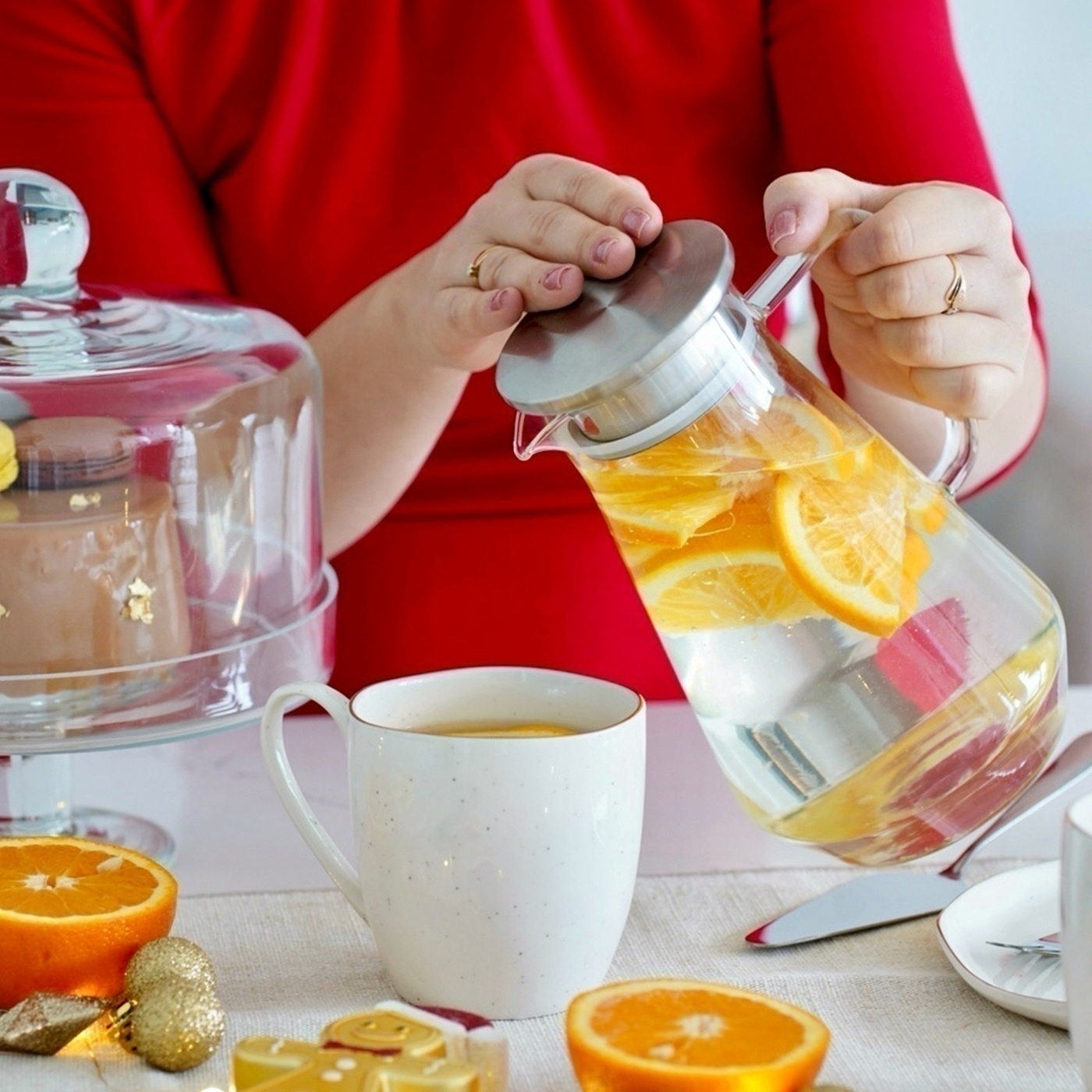 Dzbanek do herbaty Tadar Bianco 1,5 l wykonano ze szkła borokrzemowego. Wykorzystasz go do zimnych i gorących napojów. Co więcej, zdobędziesz możliwość zalewania herbaty bezpośrednio wrzątkiem. Jest to możliwe dzięki temu, że użyte szkło borosilikatowe ma wysoki współczynnik odporności na szok termiczny. Jest też dobrze chronione przed matowieniem i trudno je zarysować. Sprawia to, że bezpiecznie przygotujesz w nim herbatę lub postawisz go na podgrzewaczu. Zyskasz też komfort i precyzję serwowania oraz nalewania napojów. Dzbanek Bianca ma dużą, ergonomiczną rączkę i praktyczną wylewkę. Tym sposobem uzupełnisz domową zastawę do kawy i ciasta o stylowy dzbanek szklany. Jego zamknięcie jest stalowe i zaprojektowane, by zatrzymać wszystkie dodatki do napojów w trakcie nalewania ich do szklanek. Produktu możesz używać w temperaturze do 120 st. C. Biały podgrzewacz do dzbanka, dodany do kompletu, jest ceramiczny. Z nim sprawisz, że herbata będzie długo ciepła. Zdobędziesz też model stabilny, solidny i dobrze pasujący do twojego serwisu deserowego. Co więcej, upewnisz się, że włożona do środka świeczka tealight się nie przewróci. Będzie miała też odpowiedni dopływ powietrza, które podtrzyma jej płomień. Z całą pewnością zyskasz idealną podstawkę ceramiczną z korkiem pod ulubiony imbryk. Warto wybrać ten zestaw, by całe spotkanie towarzyskie zawsze było udane, a zapas świeżo parzonej herbaty bezpieczny. Użyjesz go przy wielu okazjach! Sam szklany dzbanek możesz myć w zmywarce.