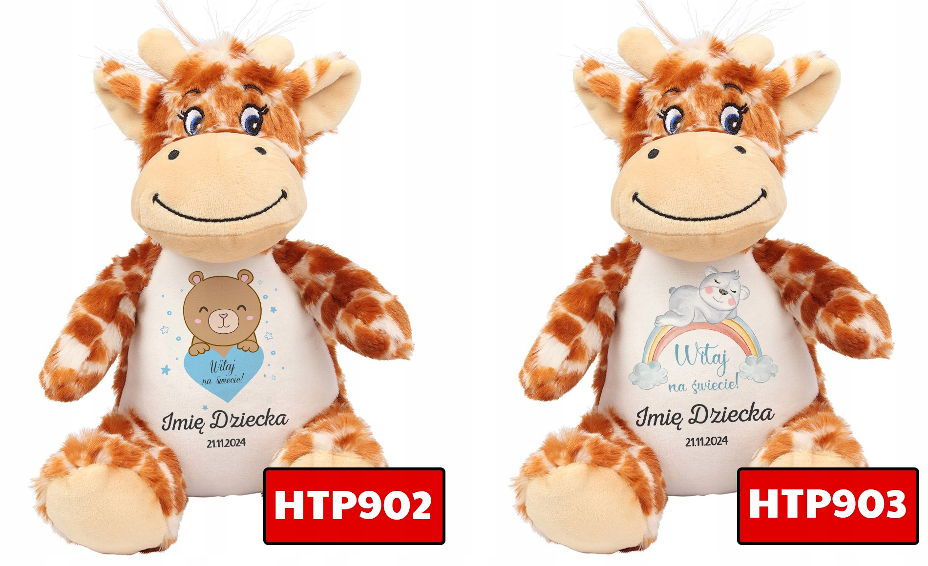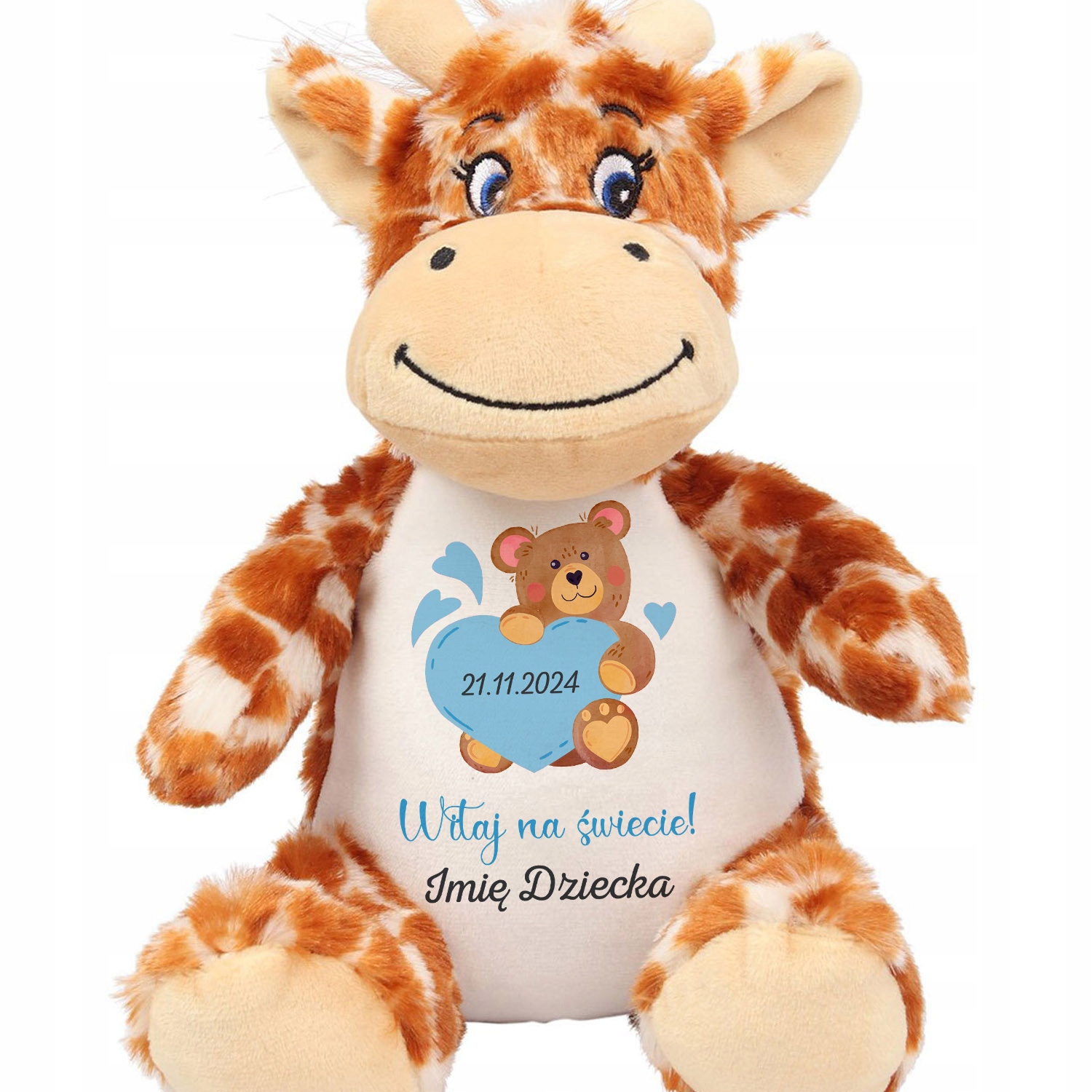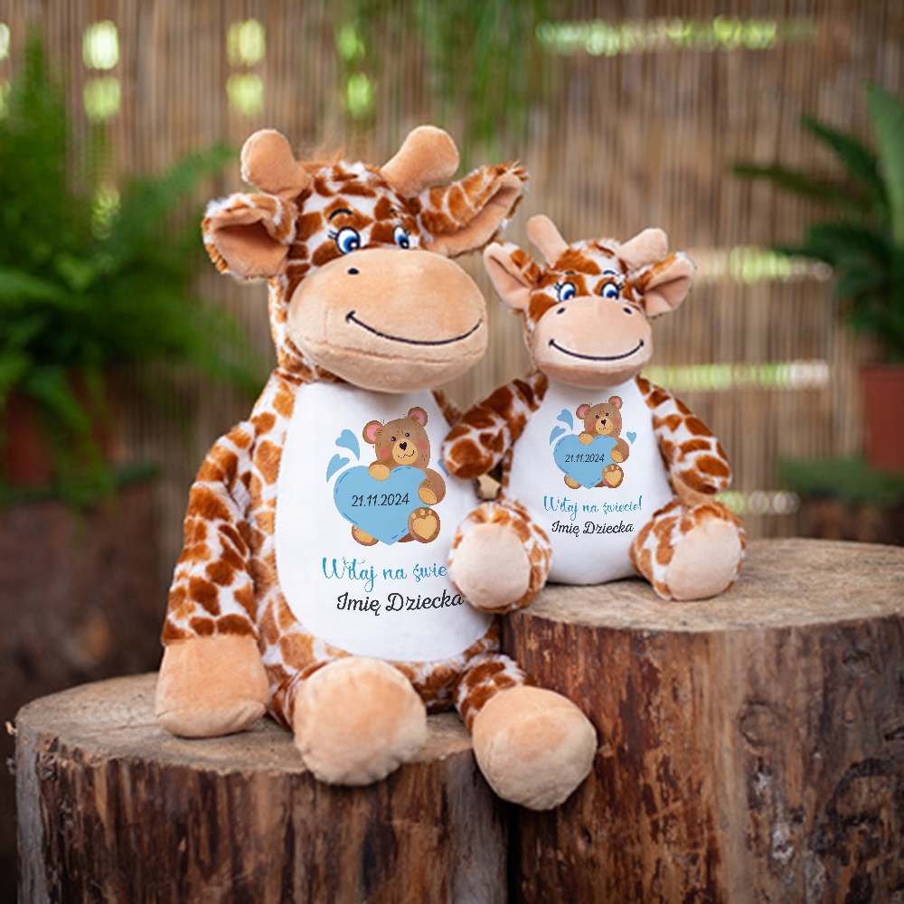 Ta urocza, mięciutka pluszowa żyrafa to nie tylko zabawka, ale także wyjątkowy sposób z narodzin Twojego maluszka! Dzięki personalizowanemu nadrukowi, możesz dodać imię dziecka, datę urodzenia lub inną dedykację, co sprawia, że jest to idealny prezent na baby shower, roczek czy każdą inną okazję.
