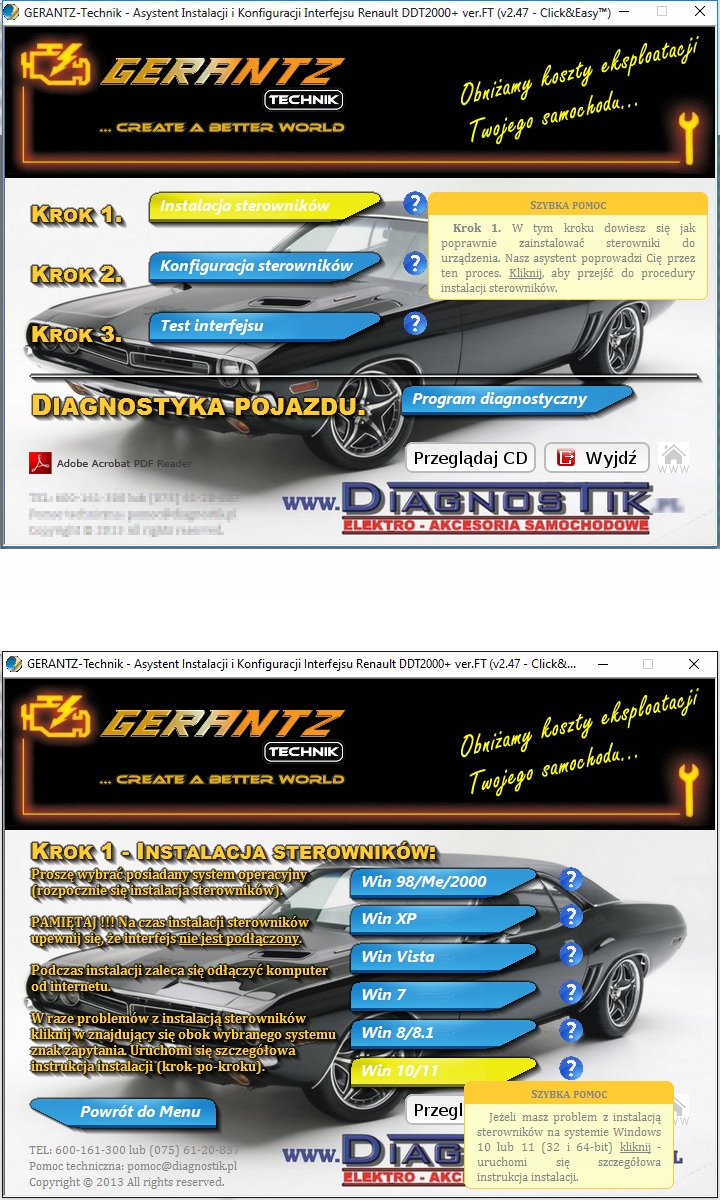 TECHNOLOGIA Click&Easy™ - już nie musisz być Informatykiem-Mechanikiem z wyższym wykształceniem, aby poznać tajniki diagnostyki samochodowej. Teraz wystarczy znać tylko podstawy obsługi komputera, a nasz Asystent poprowadzi Cię "krok-po-kroku" przez proces instalacji i konfiguracji urządzenia w systemie, a także pomoże przy pierwszej, własnej diagnostyce pojazdu.