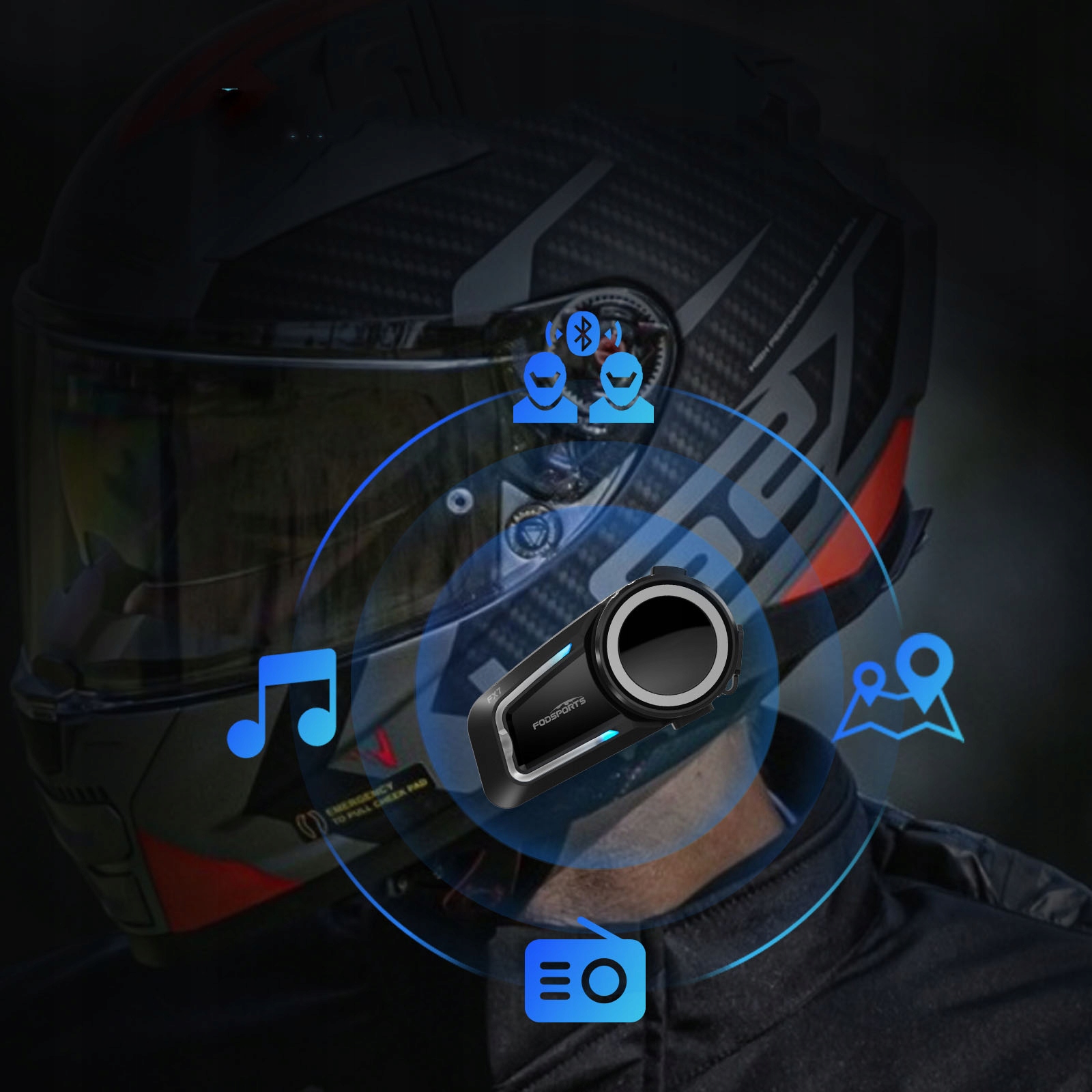 Korzystając z podwójnej konstrukcji bluetooth QCC chip, jedna część steruje dźwiękiem bluetooth, a druga część steruje bluetooth intercom.It pozwala słuchać muzyki lub radia GPS lub FM podczas interkomu