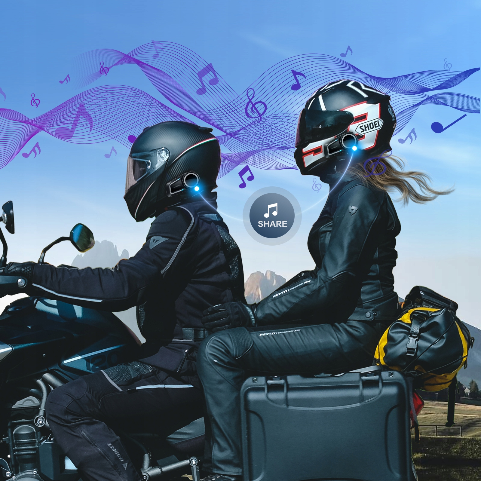 Udostępnianie muzyki działa tylko wtedy, gdy 2 interkomy są sparowane - główny interkom może odtwarzać muzykę, którą słyszy zarówno kierowca, jak i pasażer (funkcja działa w niewielkiej odległości, między dwoma maszynami w 15 metrach).