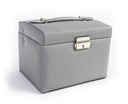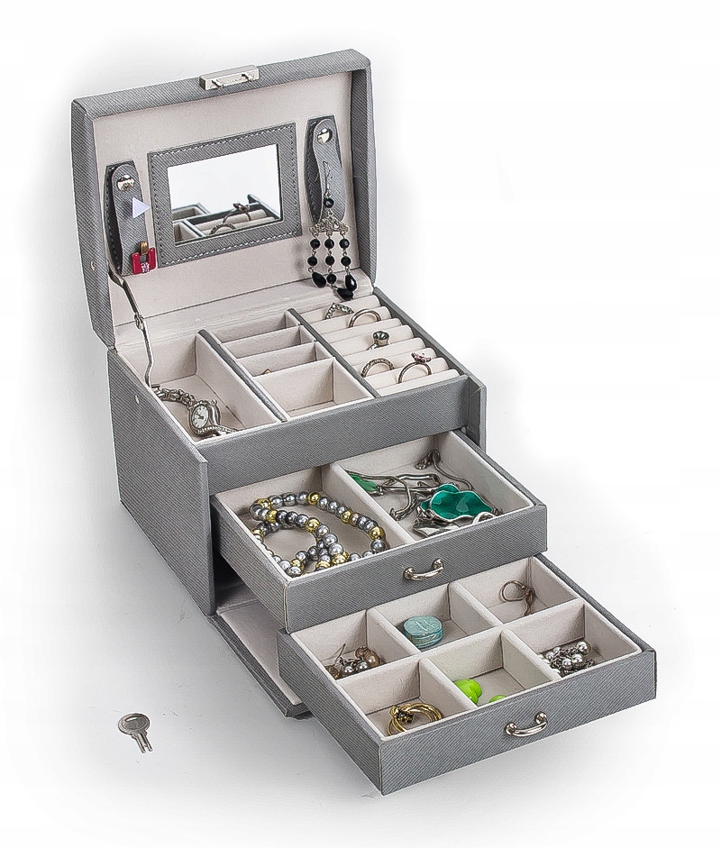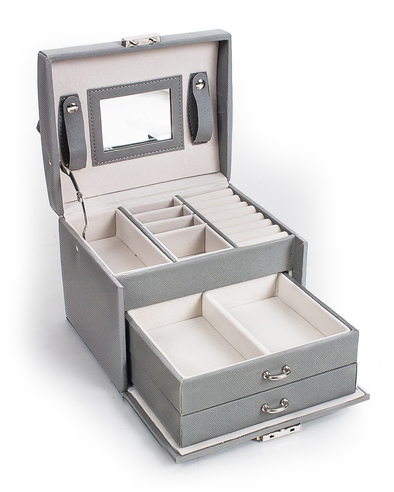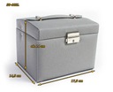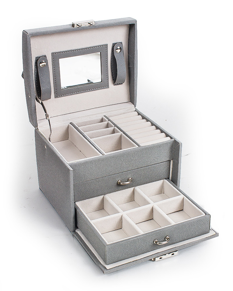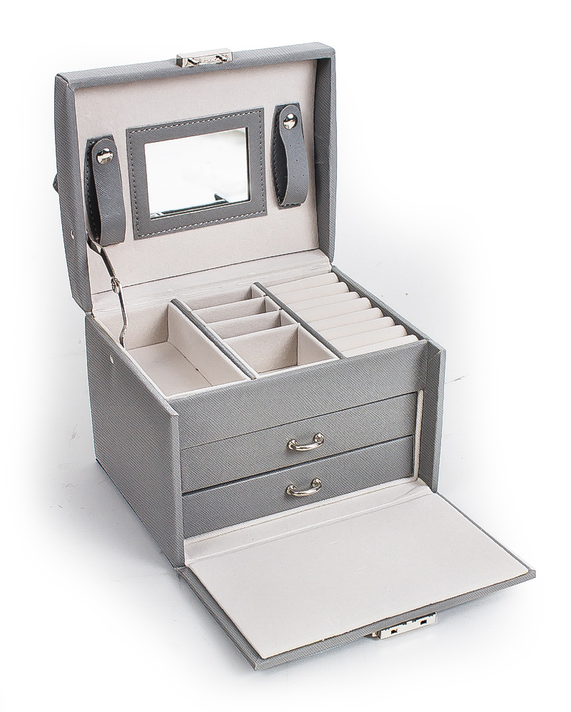 Сундук изготовлен из искусственной кожи. Имеет много отсеки для различных видов ювелирных изделий. Внутри сундук выложен велюром. Шкатулка запирается на ключ.