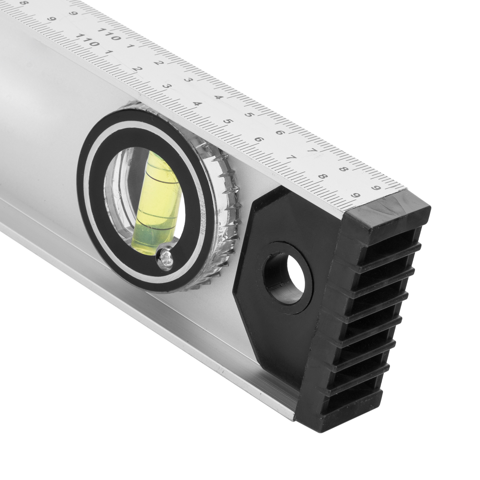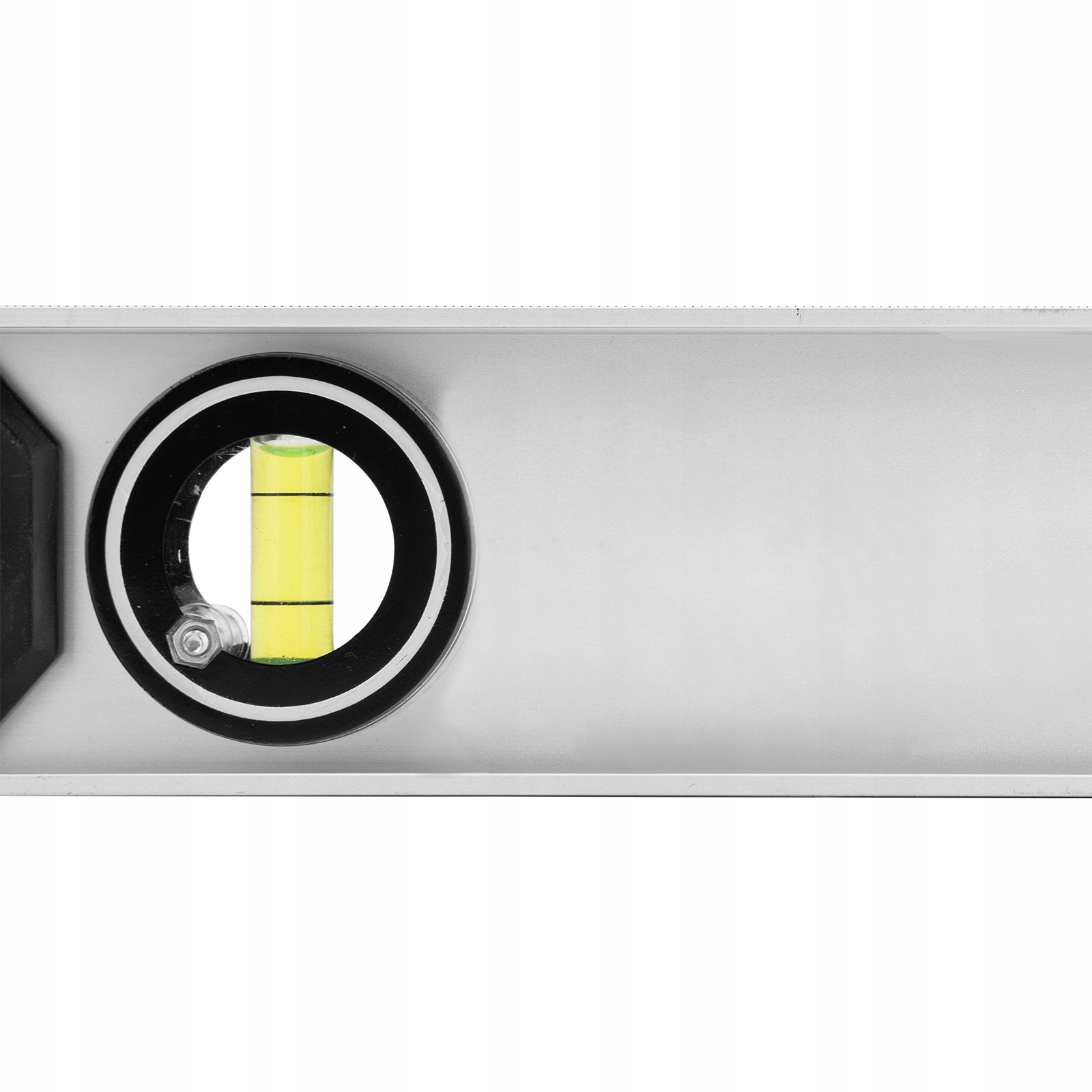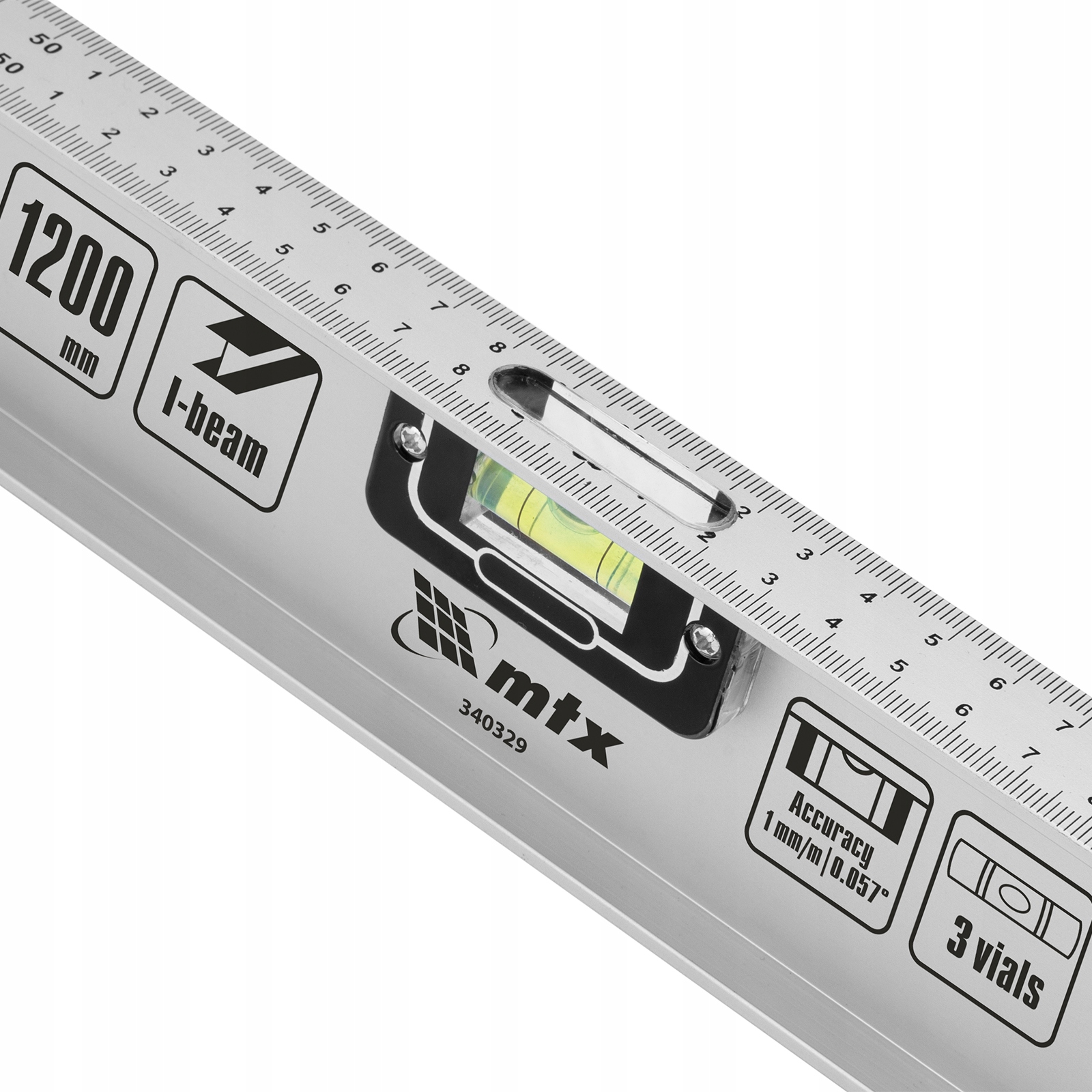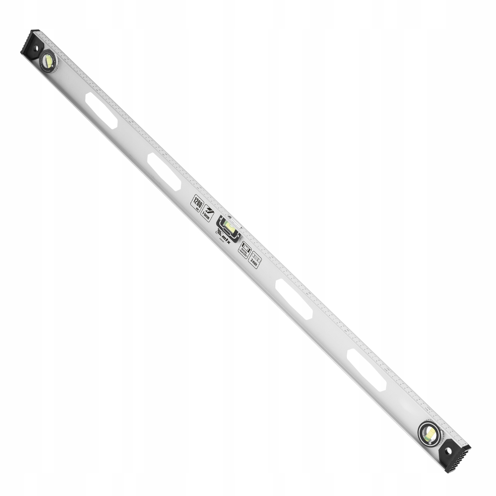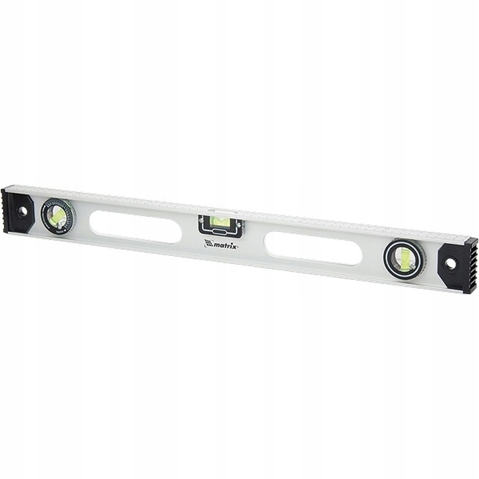 Poziomica aluminiowa Matrix „Rail” 34032 o długości 1200 mm posiada 3 ucha: 2 do sprawdzania odchyleń od zadanego pionu i poziomu oraz 1 obrotowe do sprawdzania pochyłych powierzchni.