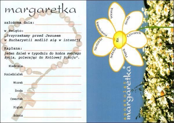 W centrum kwiatu (margaretki) wpisuje się imię i nazwisko kapłana, zaś na siedmiu listkach kwiatowych nazwiska siedmiu rodzin (lub imiona i nazwiska siedmiu konkretnych osób), które składają Bogu przyrzeczenie wieczystej modlitwy - każda rodzina (lub pojedyncza osoba) w jednym określonym dniu tygodnia za konkretnego kapłana.
