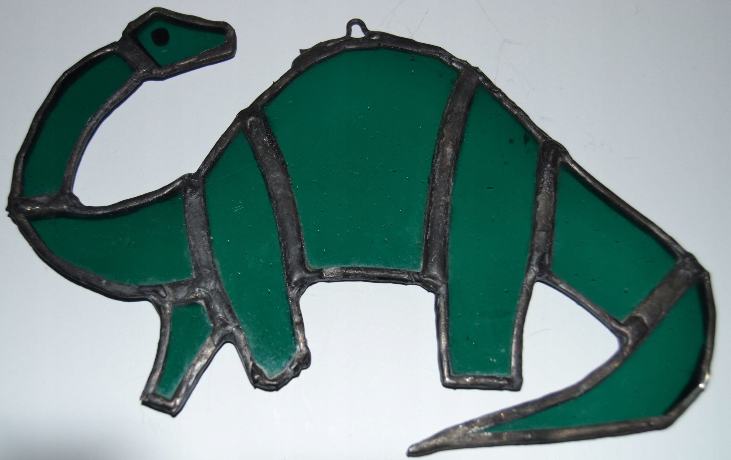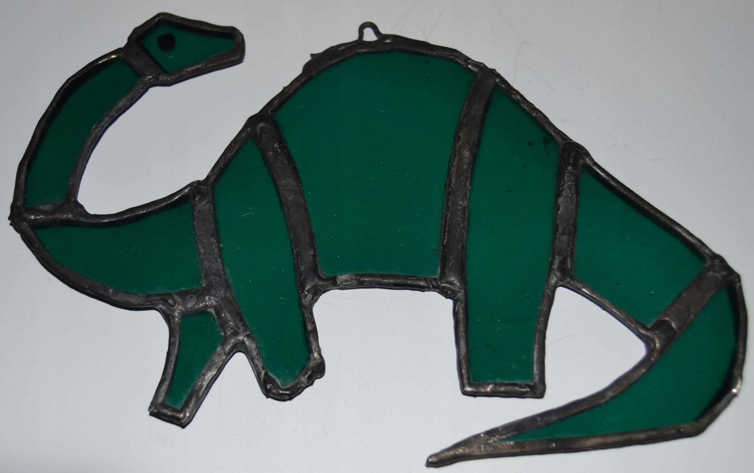 Dinozaur - zawieszka witrażowa, wykonana ze szkła witrażowego techniką Tiffany.