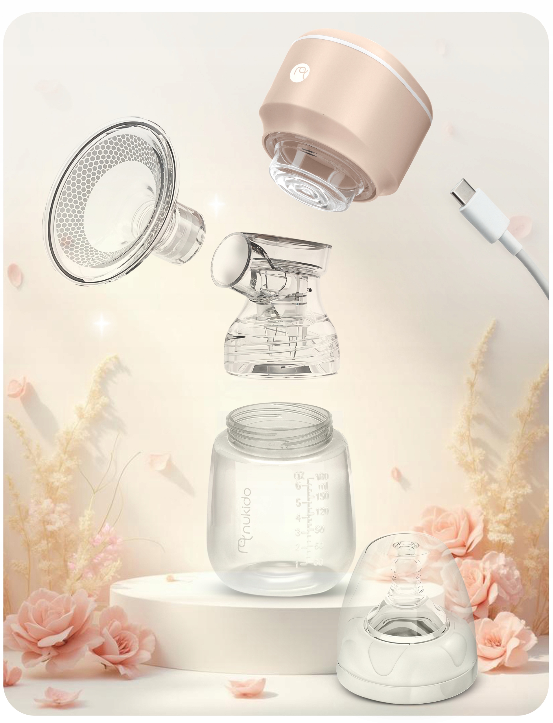Молокоотсос Nukido работает без проводов. Он снабжен батареей литиевая батарея, которая при зарядке позволяет использовать 4 часа, и она заряжается с помощью зарядное устройство USB-C.